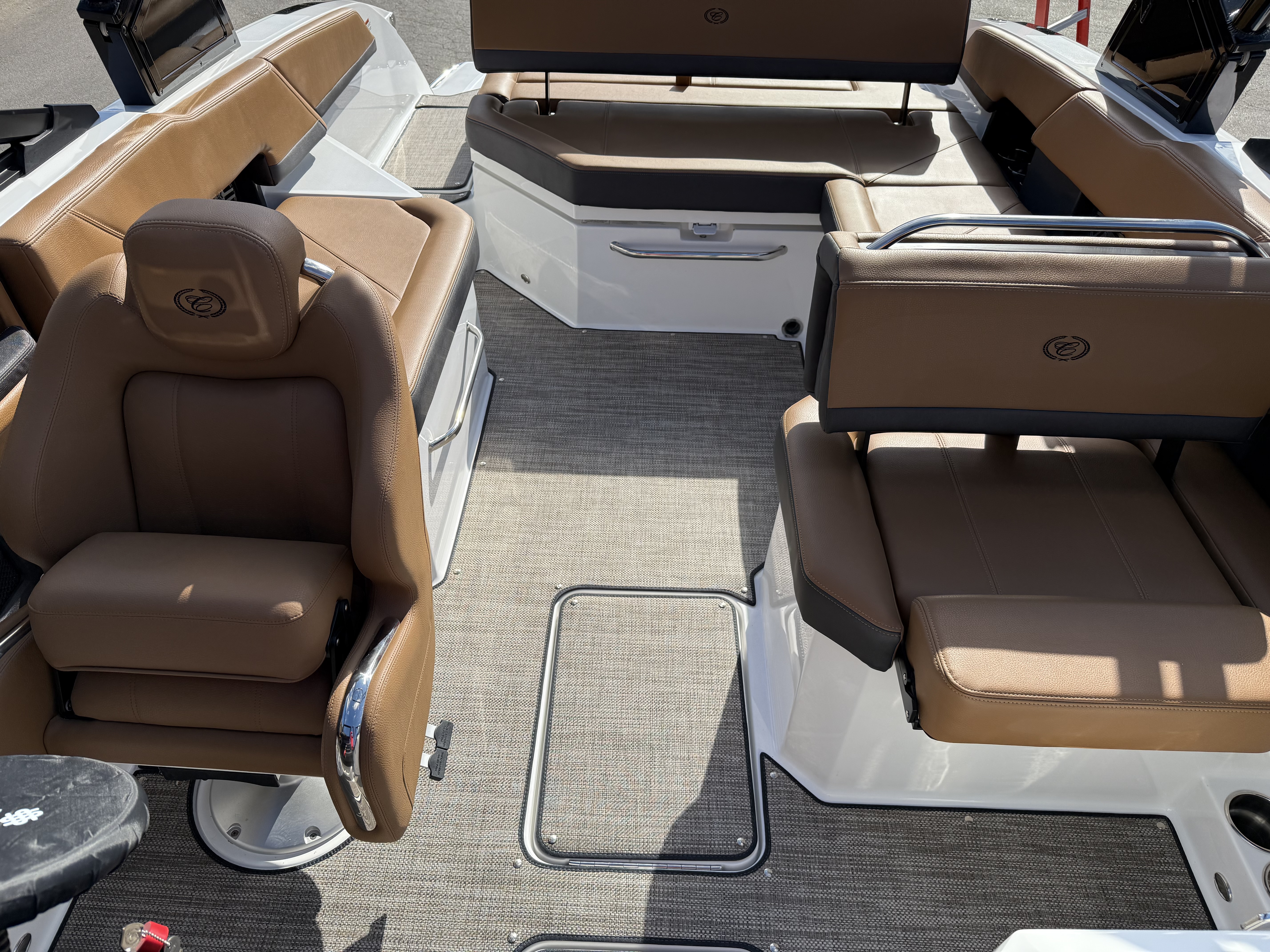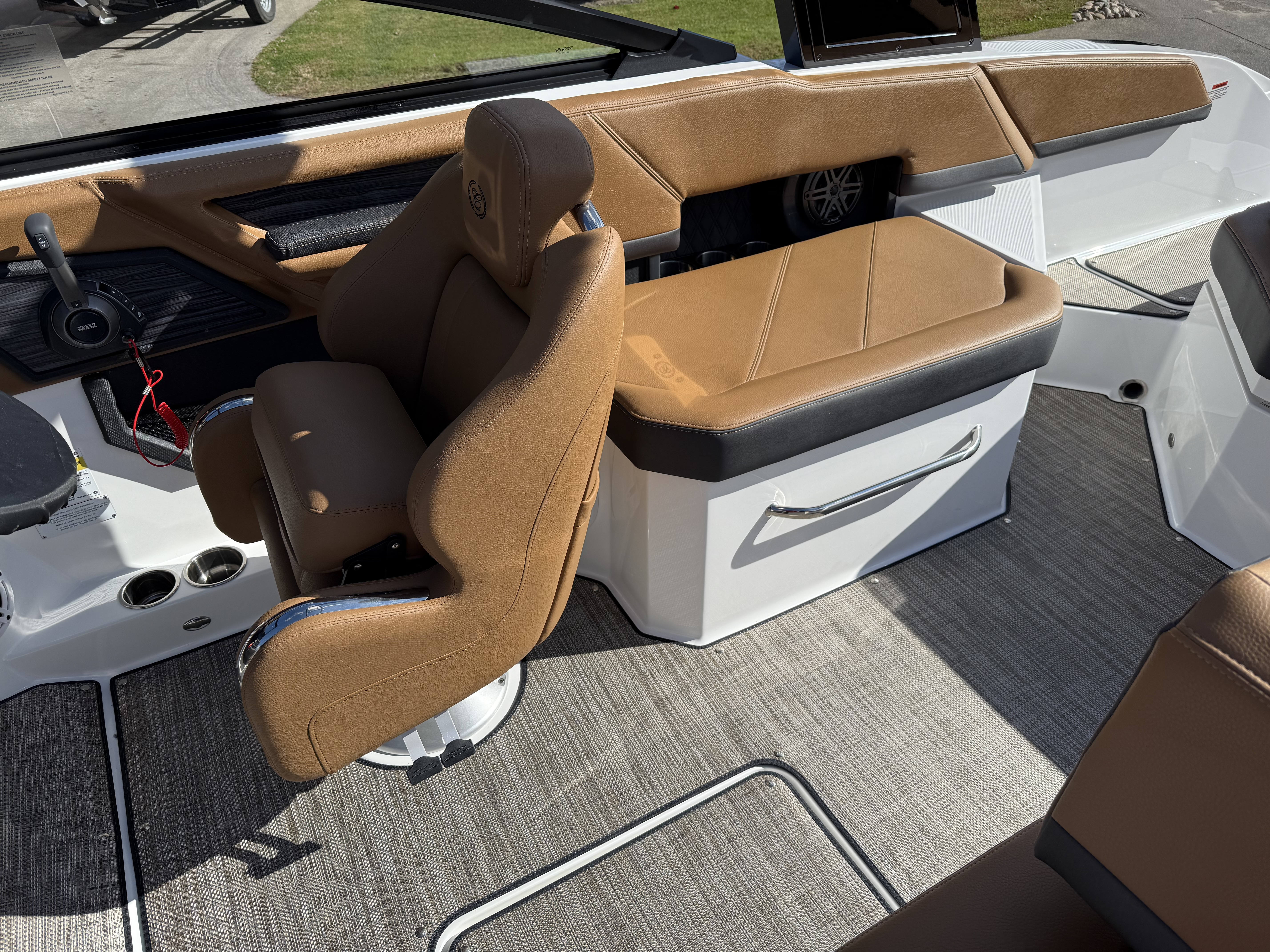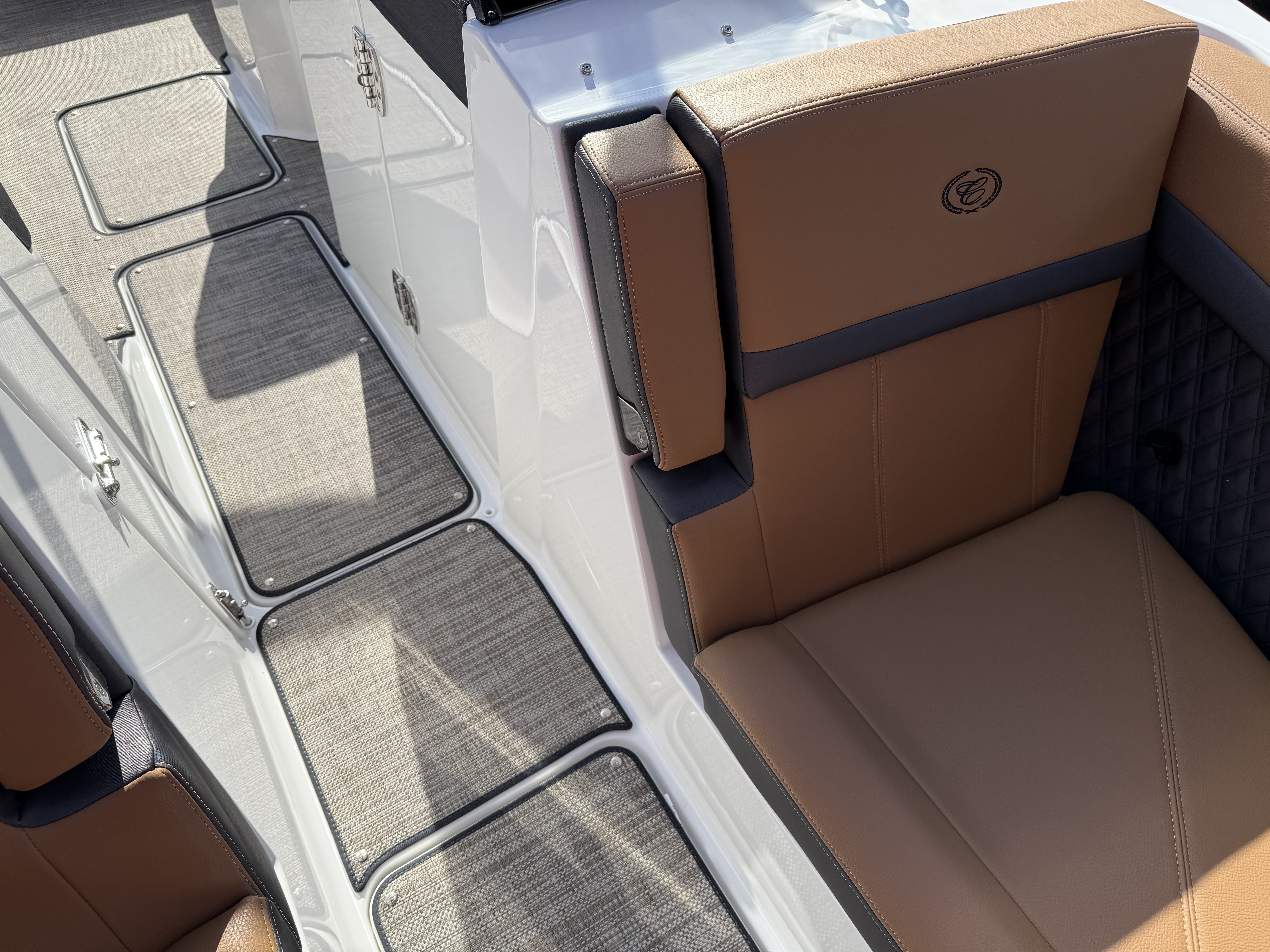 Inside, the Caramel/Carbon interior is complemented by the Dark Driftwood trim package and Sea Grass floor covering, offering a rich, elegant environment that feels more like a luxury lounge than a boat. RGB LED interior accent lighting sets the mood for evening cruises, while the leather color-matched steering wheel and dual Garmin 8610 glass cockpit displays put advanced control right at your fingertips.