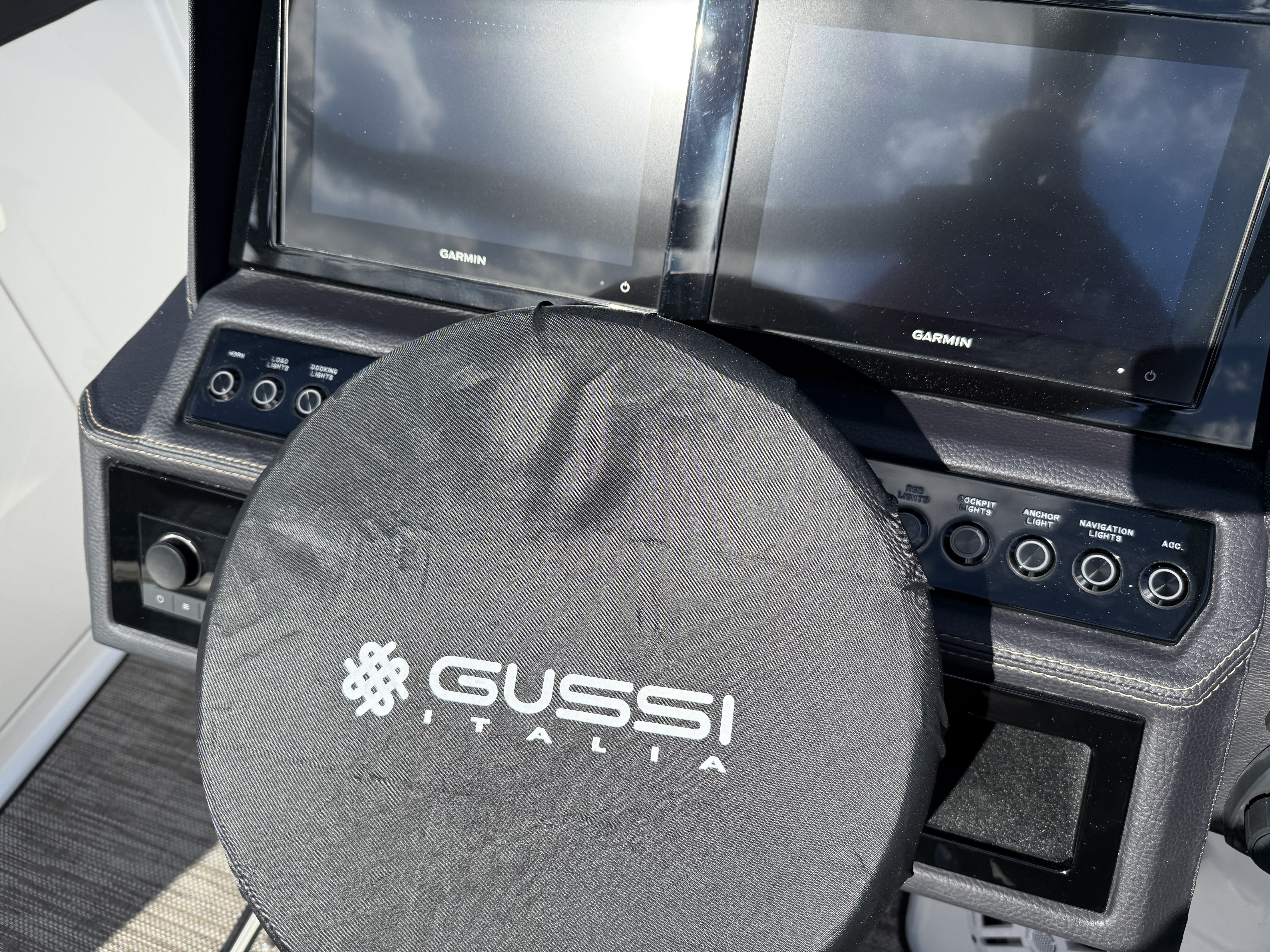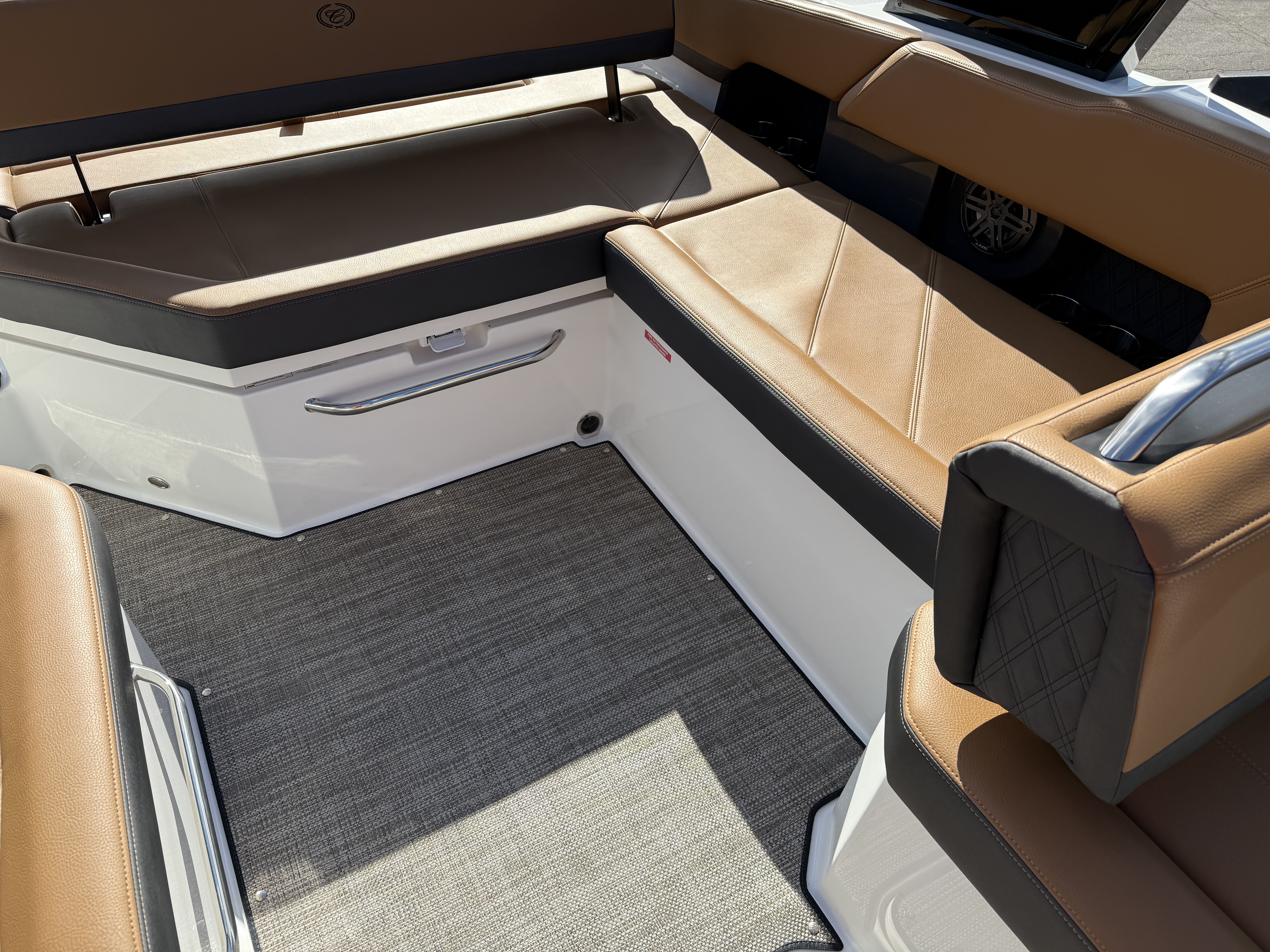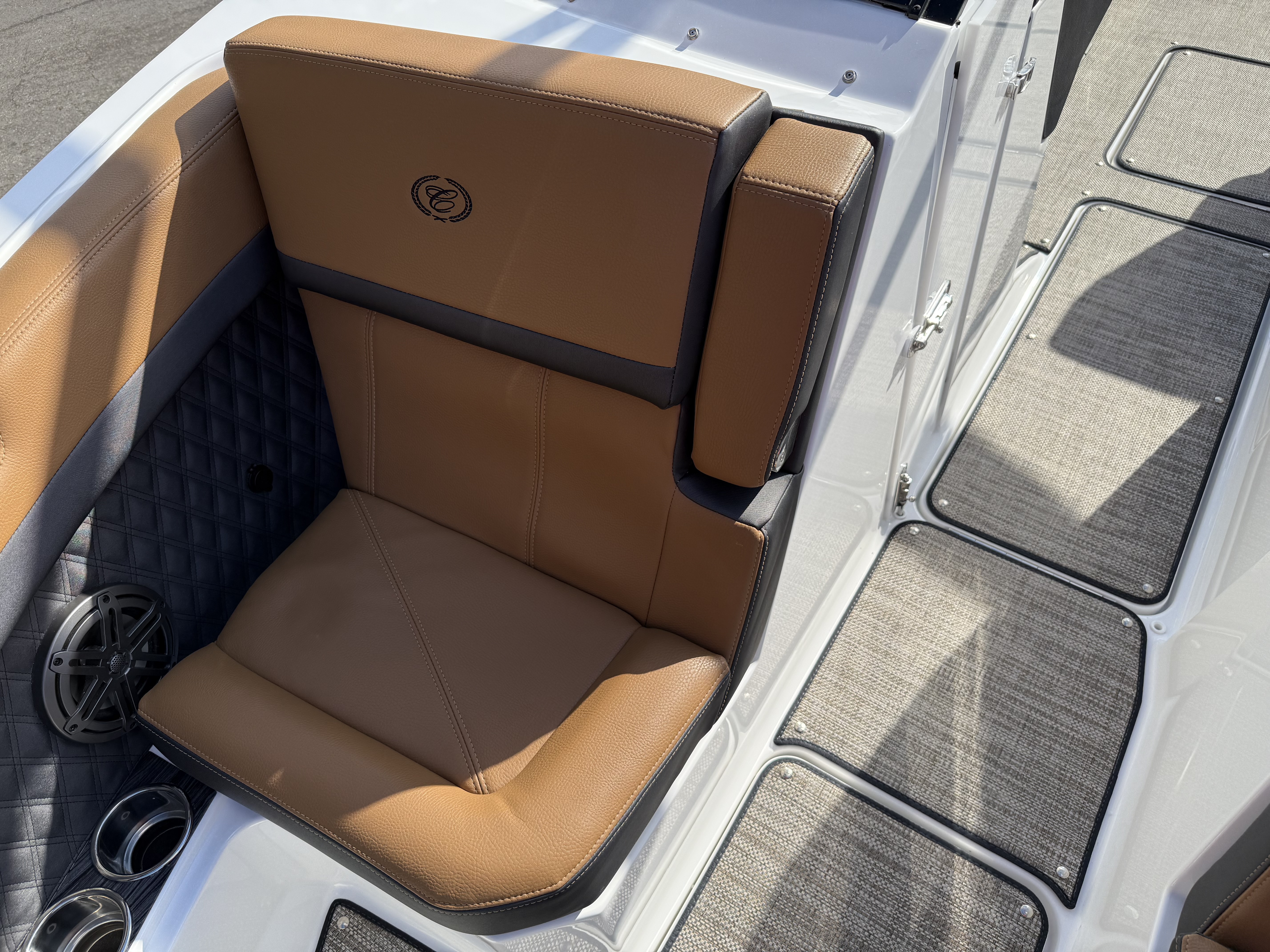 Inside, the Caramel/Carbon interior is complemented by the Dark Driftwood trim package and Sea Grass floor covering, offering a rich, elegant environment that feels more like a luxury lounge than a boat. RGB LED interior accent lighting sets the mood for evening cruises, while the leather color-matched steering wheel and dual Garmin 8610 glass cockpit displays put advanced control right at your fingertips.