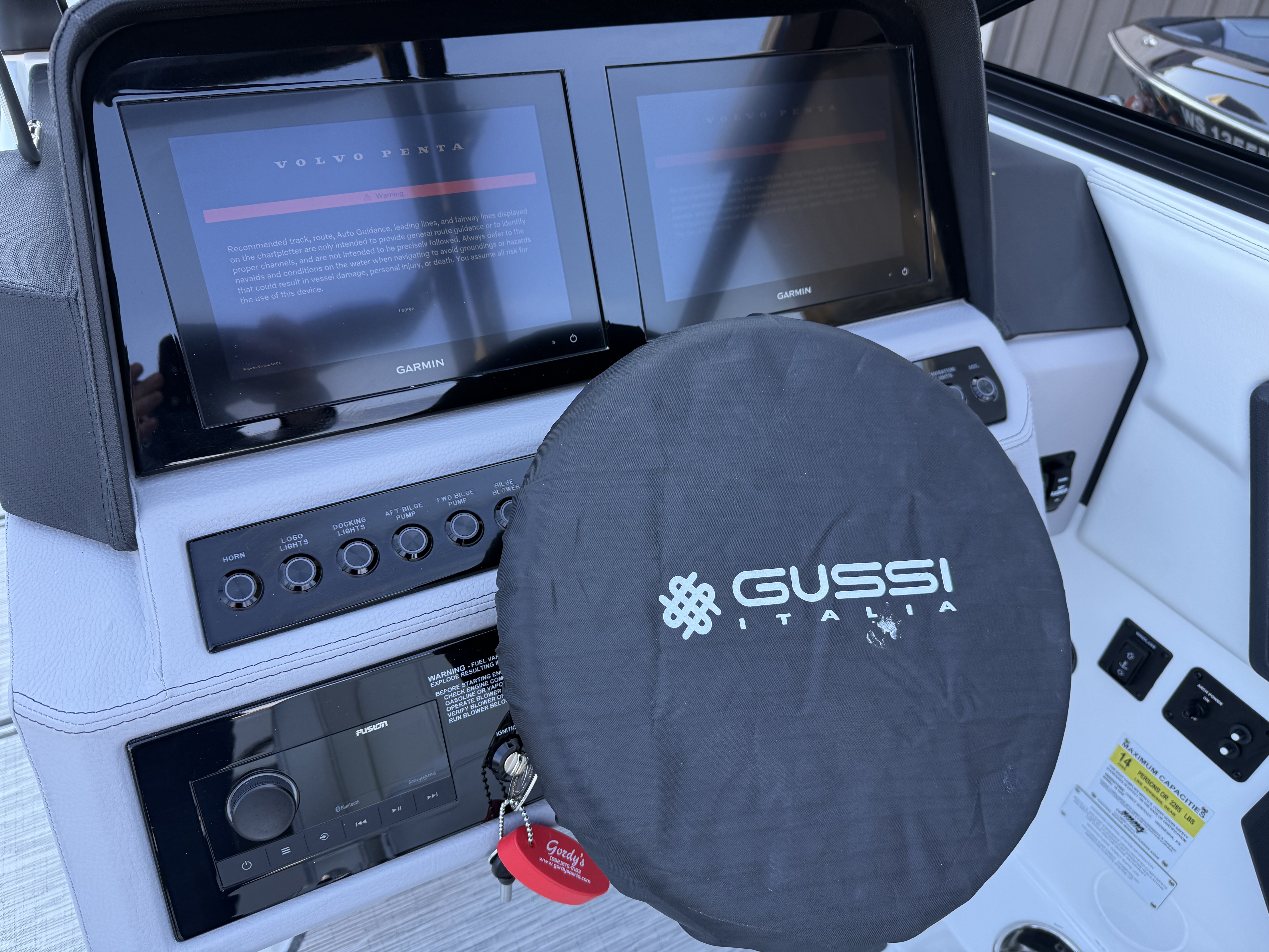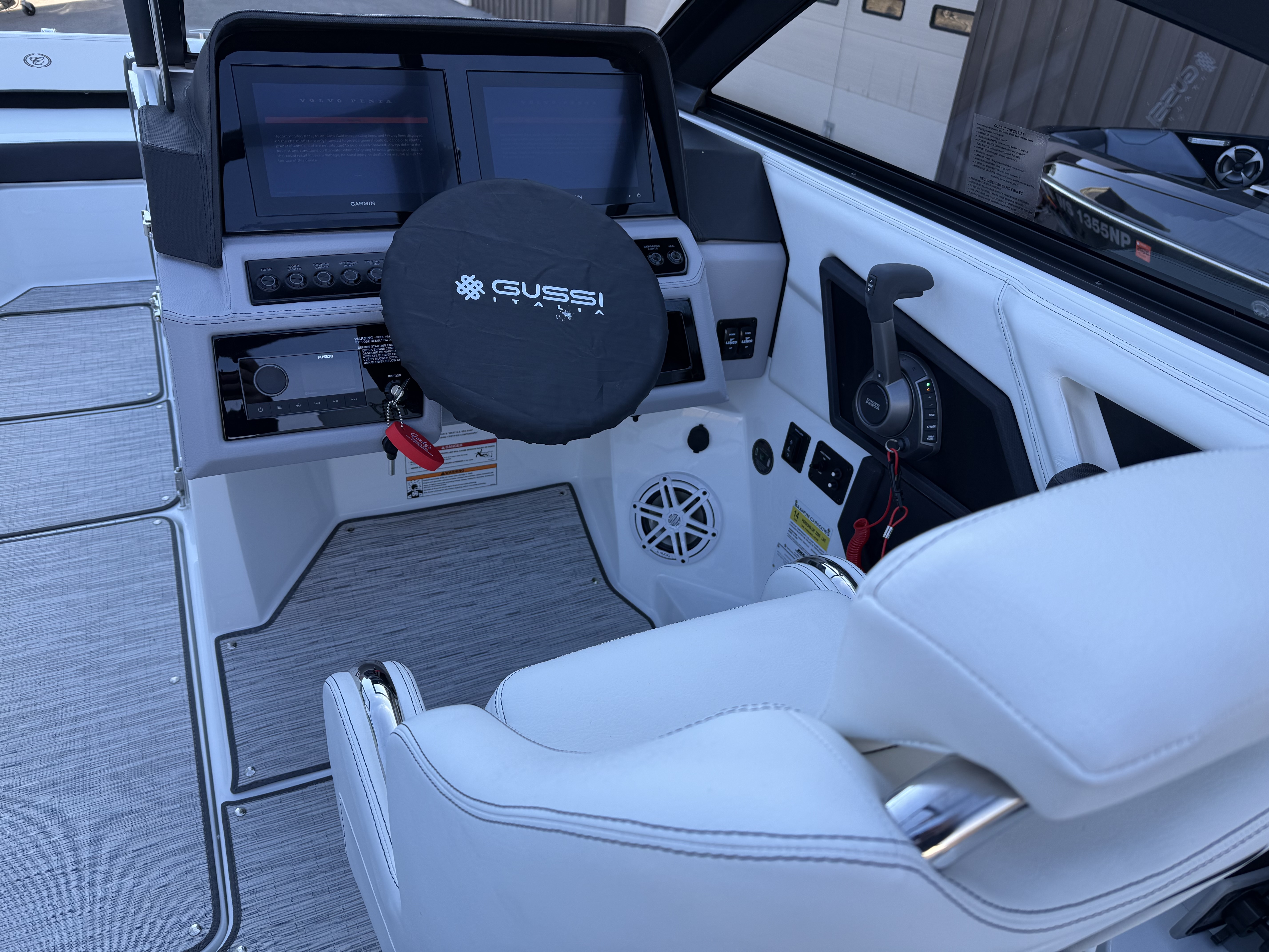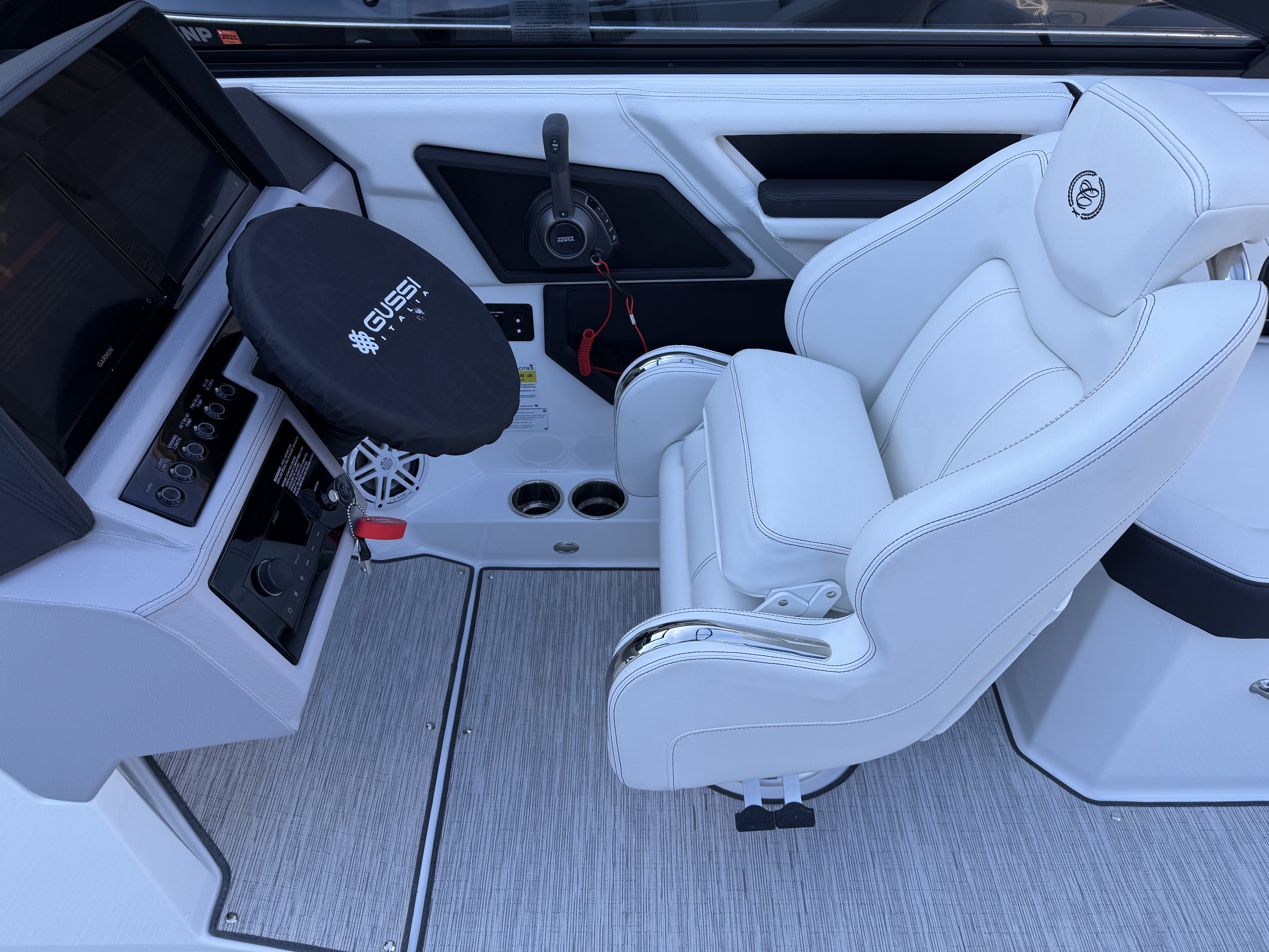 The helm is elevated with Dual Garmin 8610 Glass Cockpit displays, offering intuitive control over navigation, surf settings, and onboard systems in a sleek, high-end layout. An electric aluminum folding arch with integrated bimini adds both style and function, while RGB LED interior accent lighting lets you set the mood from day to night.