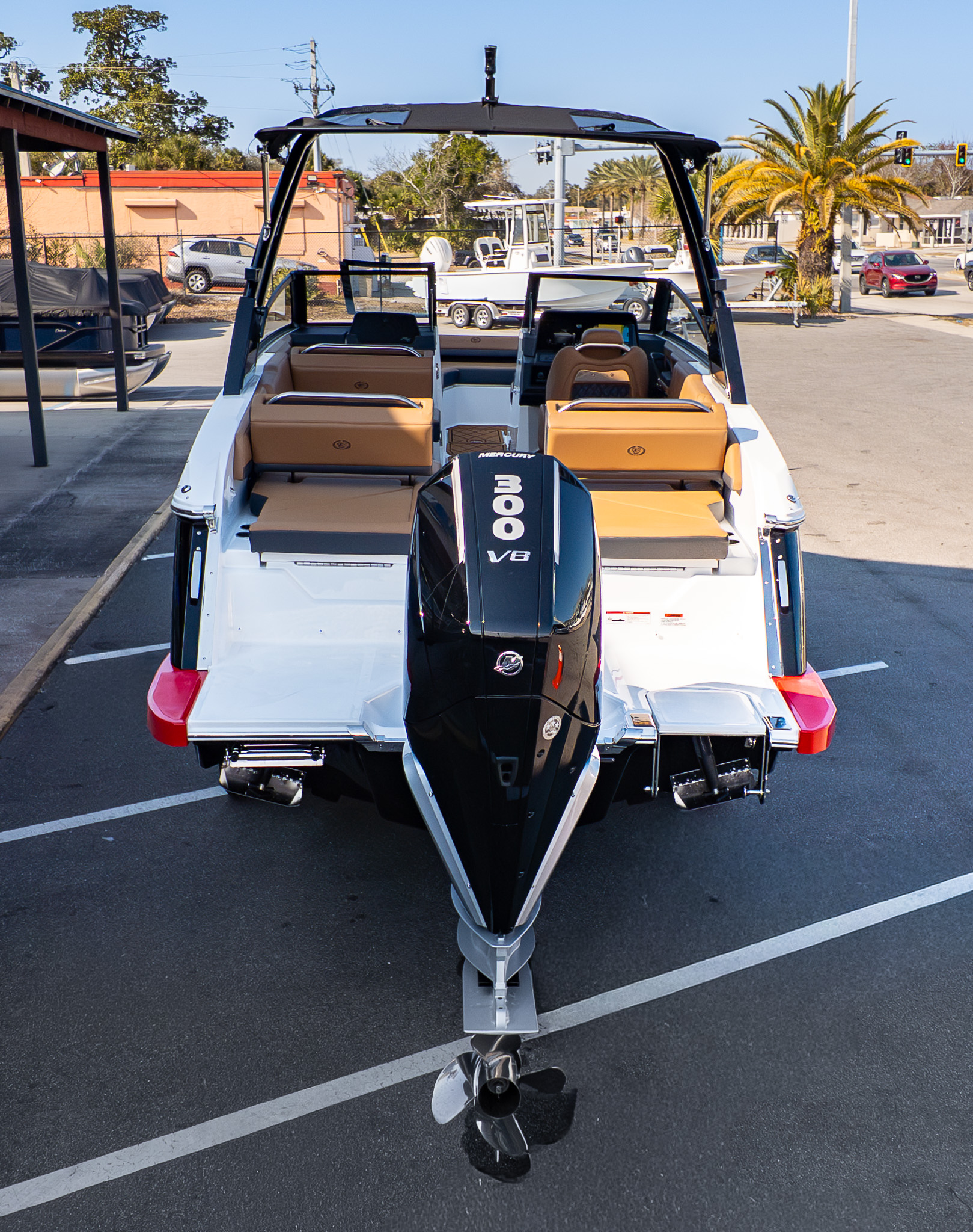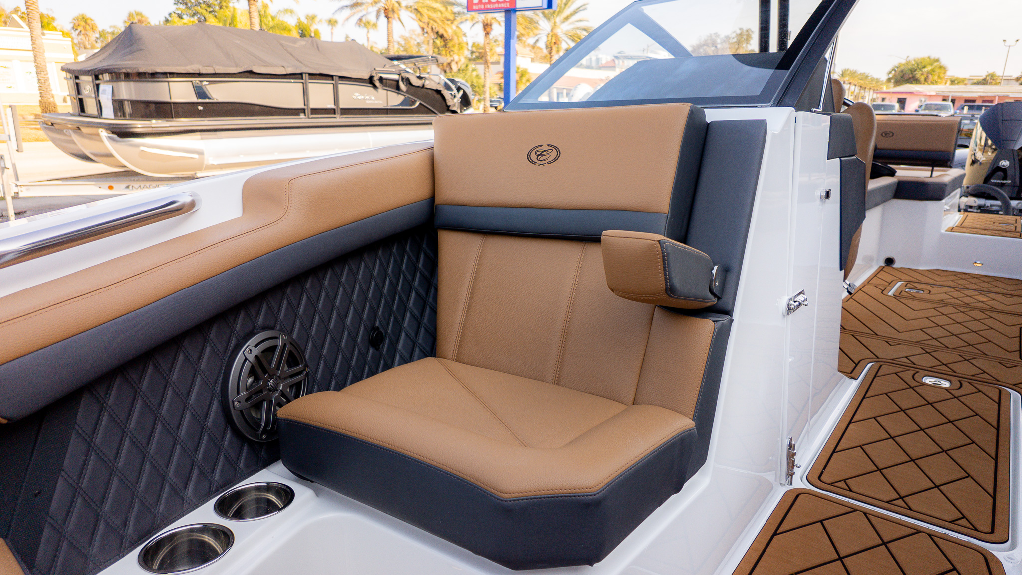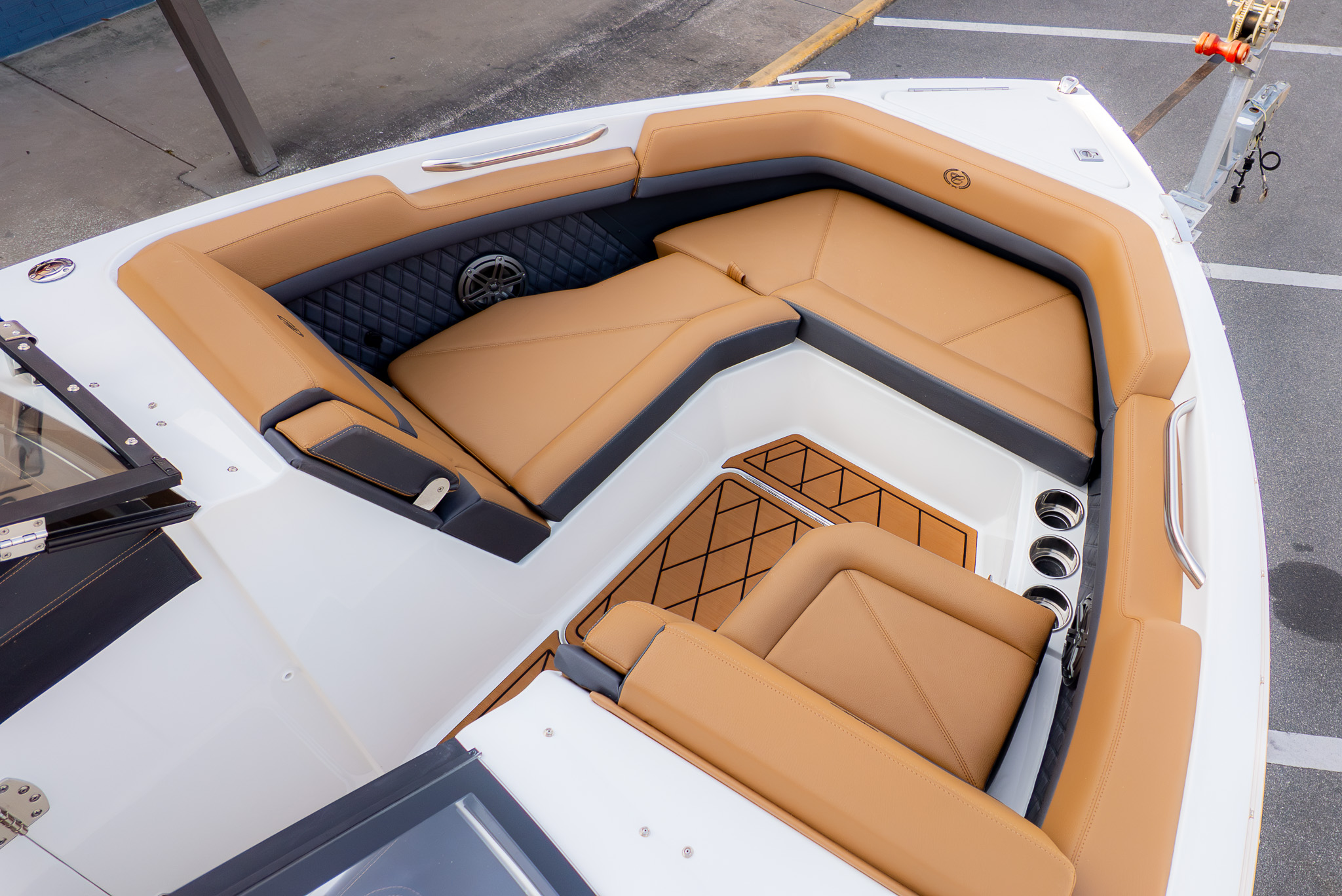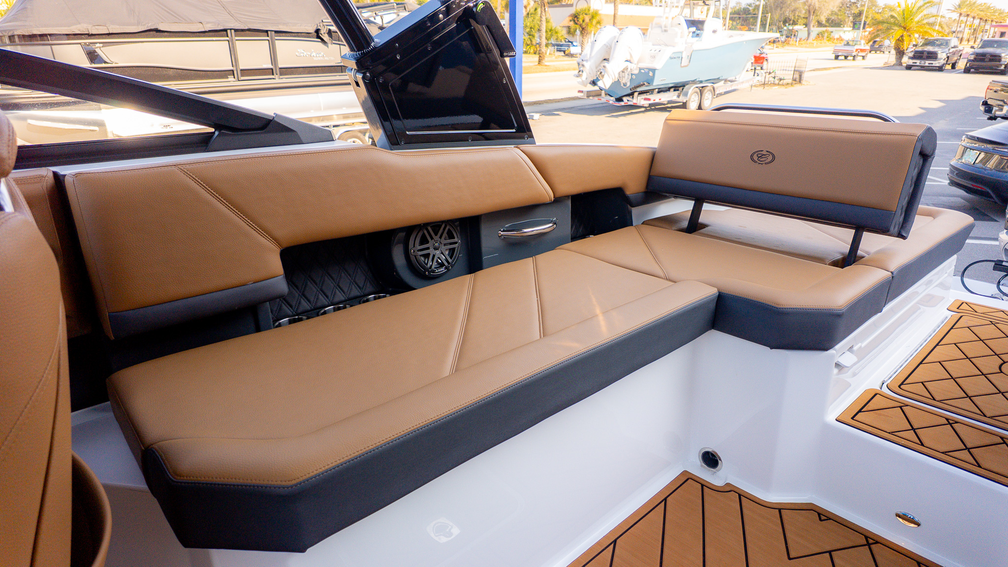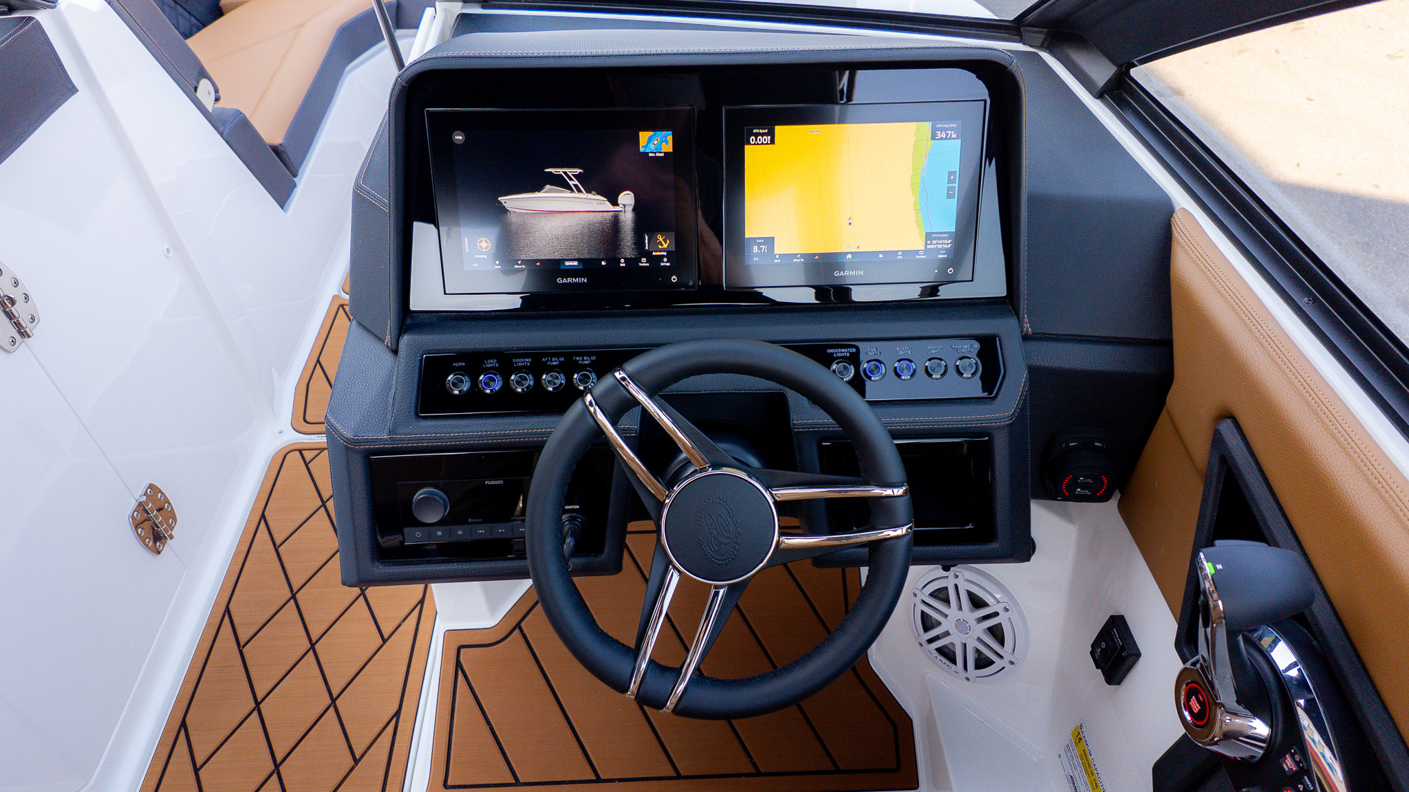 For those who love watersports, the extended swim platform and flip-down swim step are game changers, letting you dive in and climb out with ease. Pair that with the sleek dual Garmin glass cockpit for effortless navigation and a Bluetooth sound system that pumps your playlist through six speakers, and you’ve got the perfect setup for wakeboarding mornings, tubing afternoons, and sunset parties.