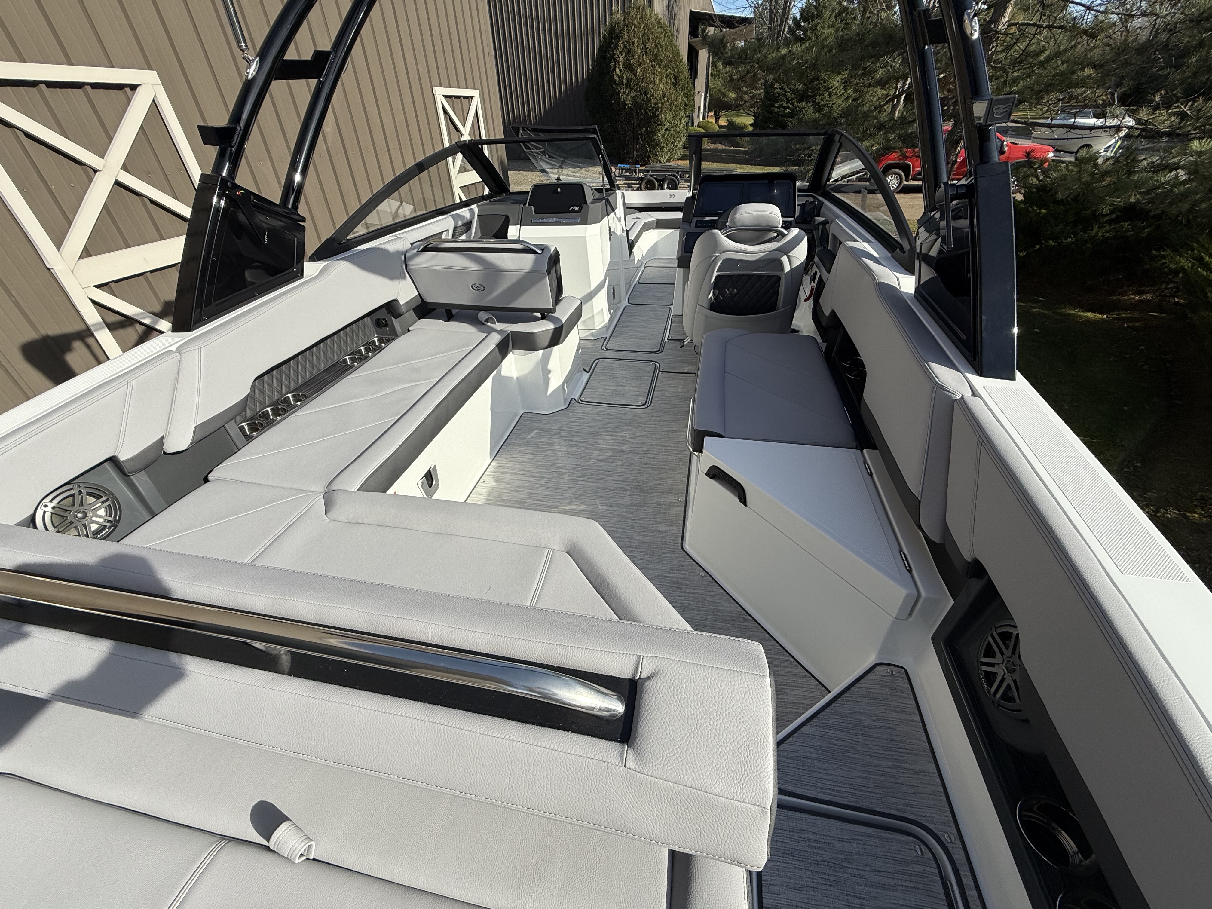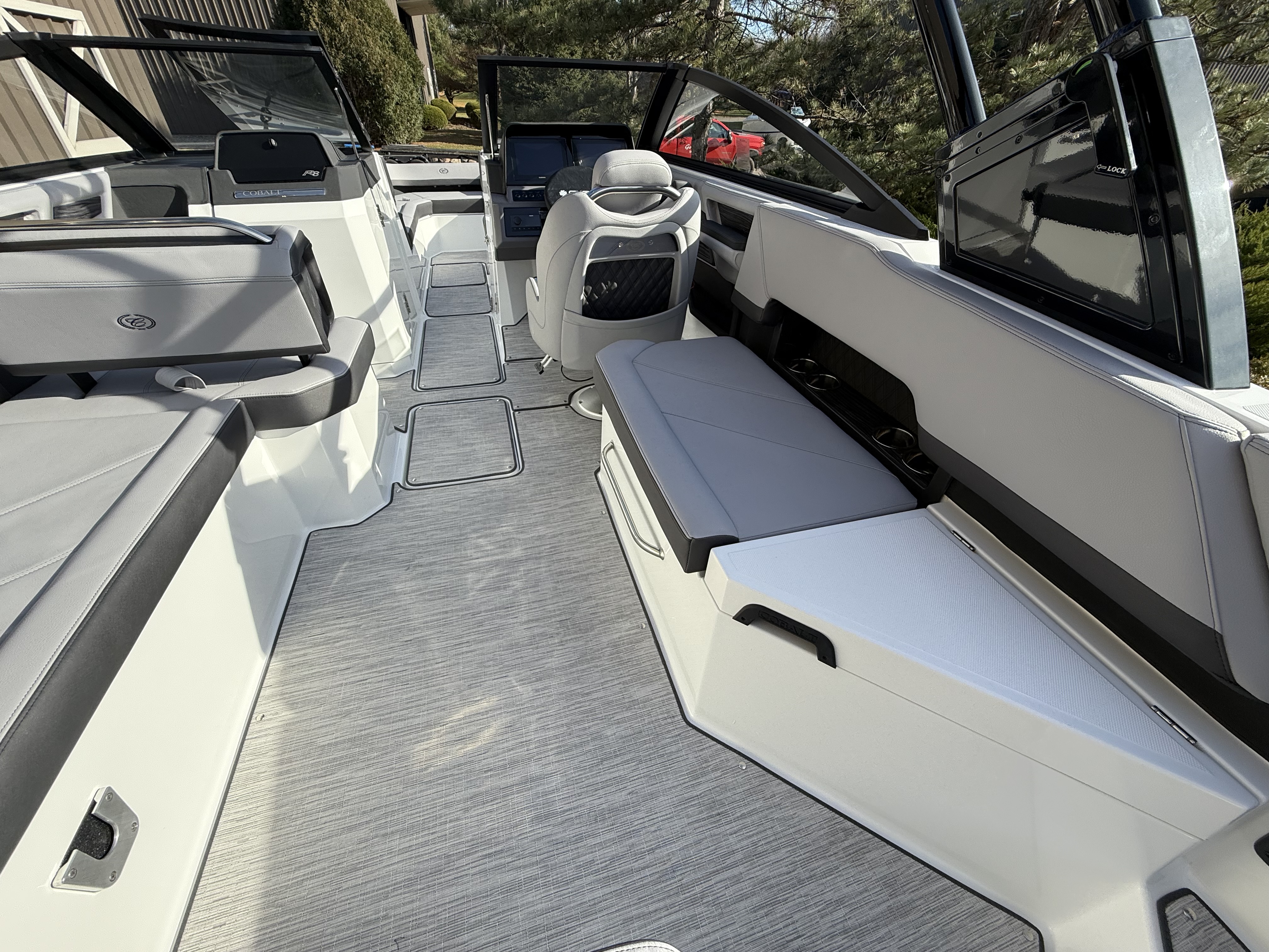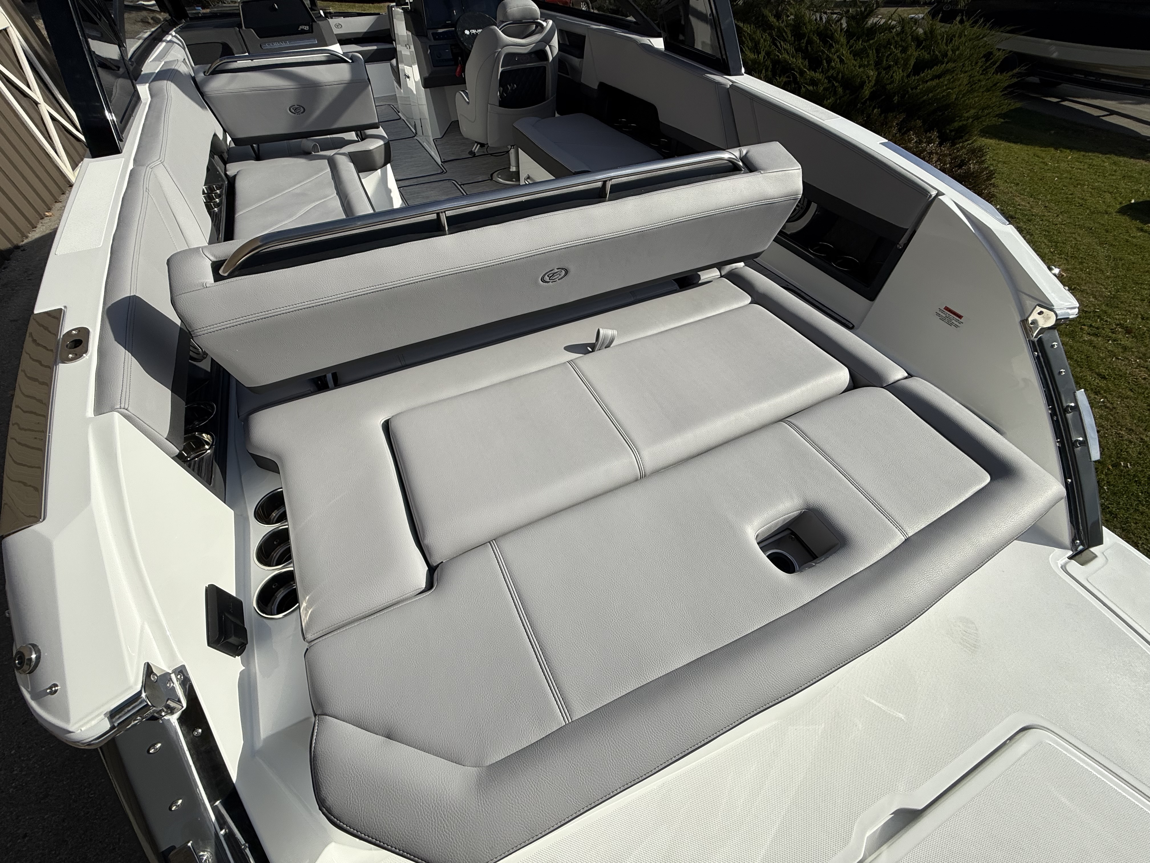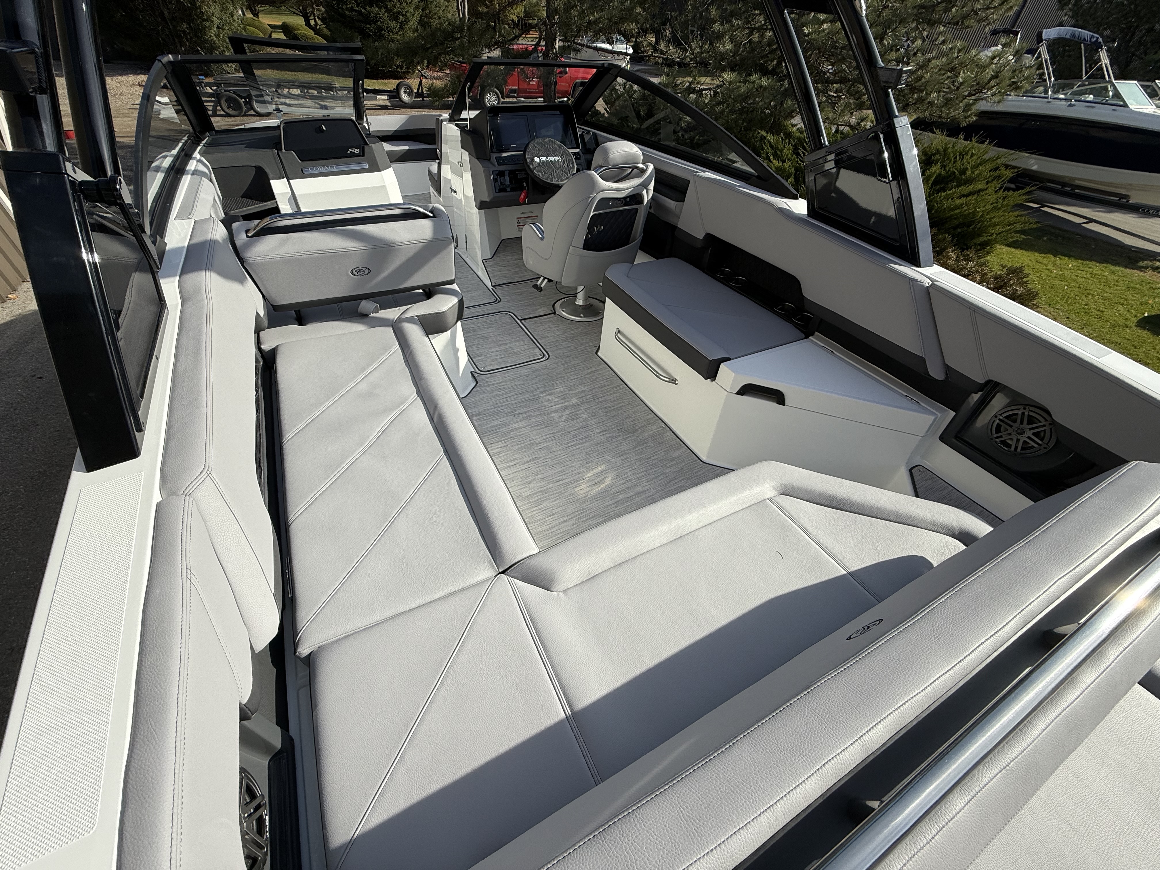 Inside, the craftsmanship is unmistakably Cobalt. The wood interior accent package, sea grass flooring, and RGB LED interior lighting create a warm, inviting atmosphere day or night. The cockpit and bow tonneau covers offer protection when not in use, and the cockpit entry step makes boarding effortless.