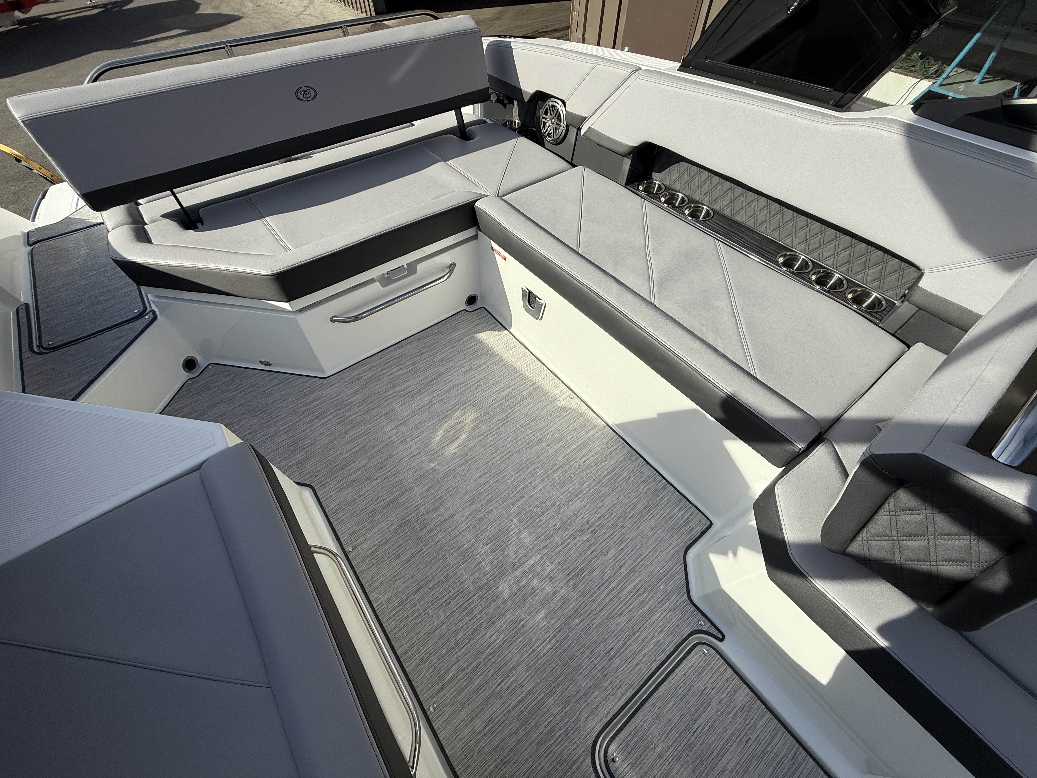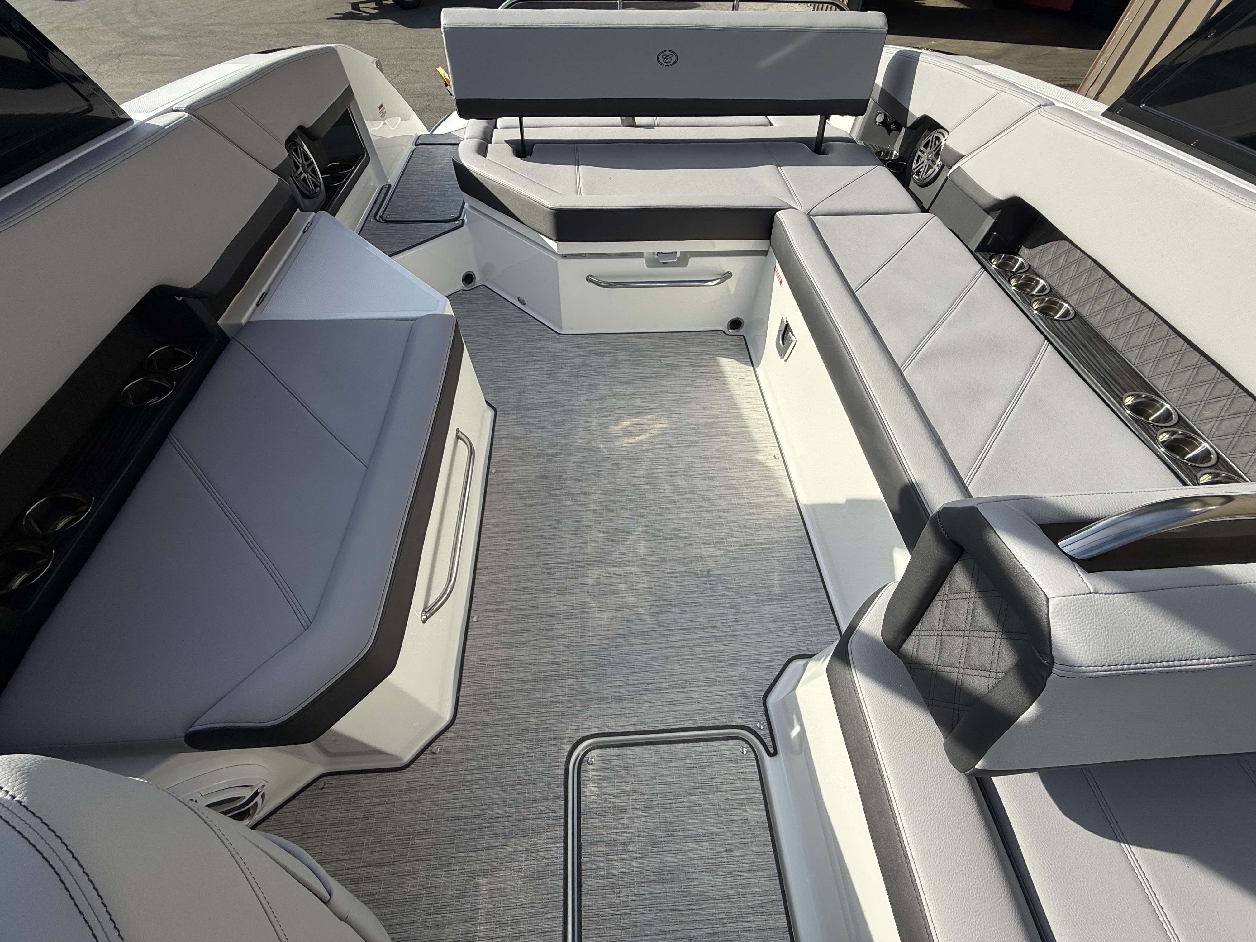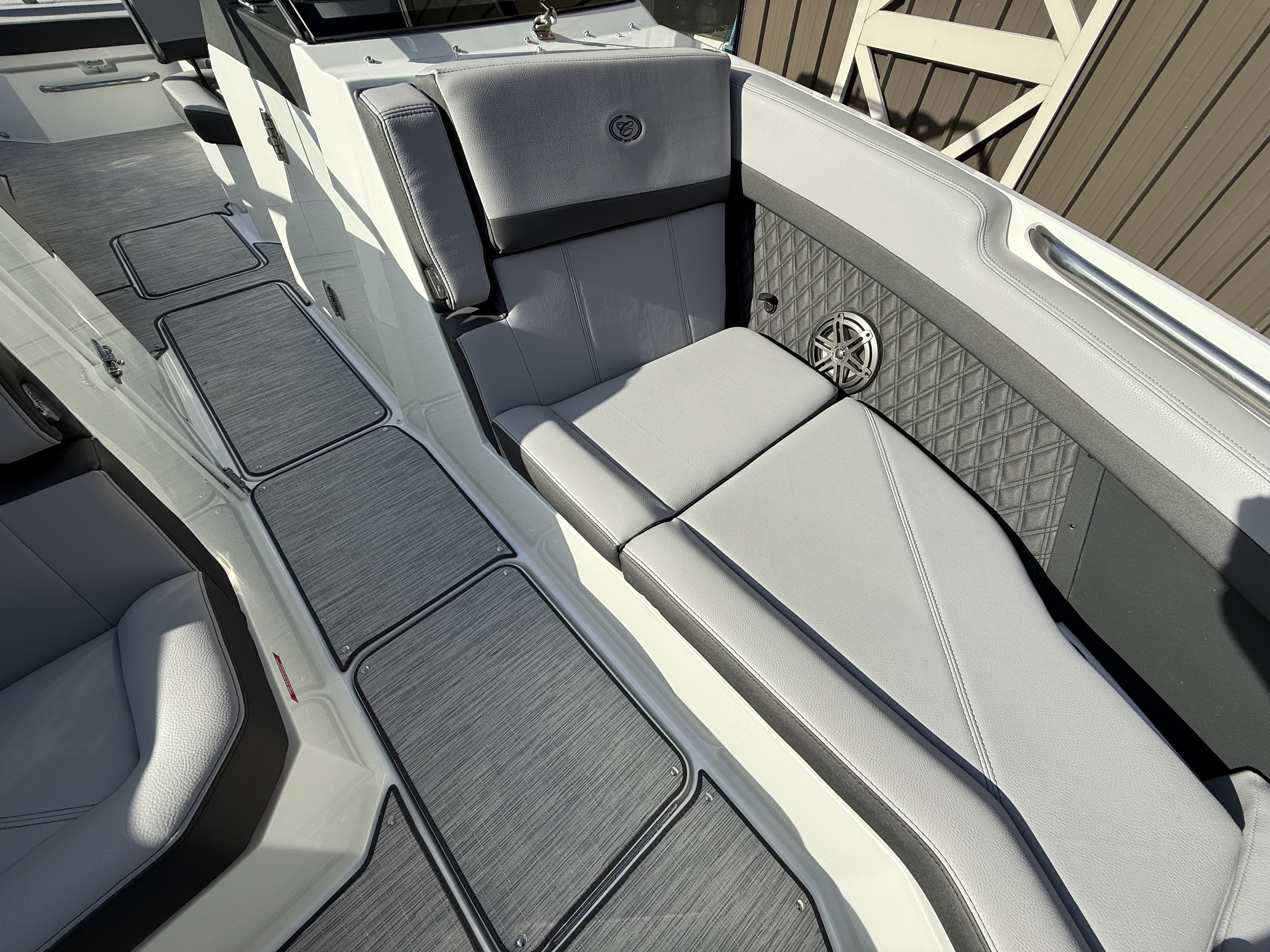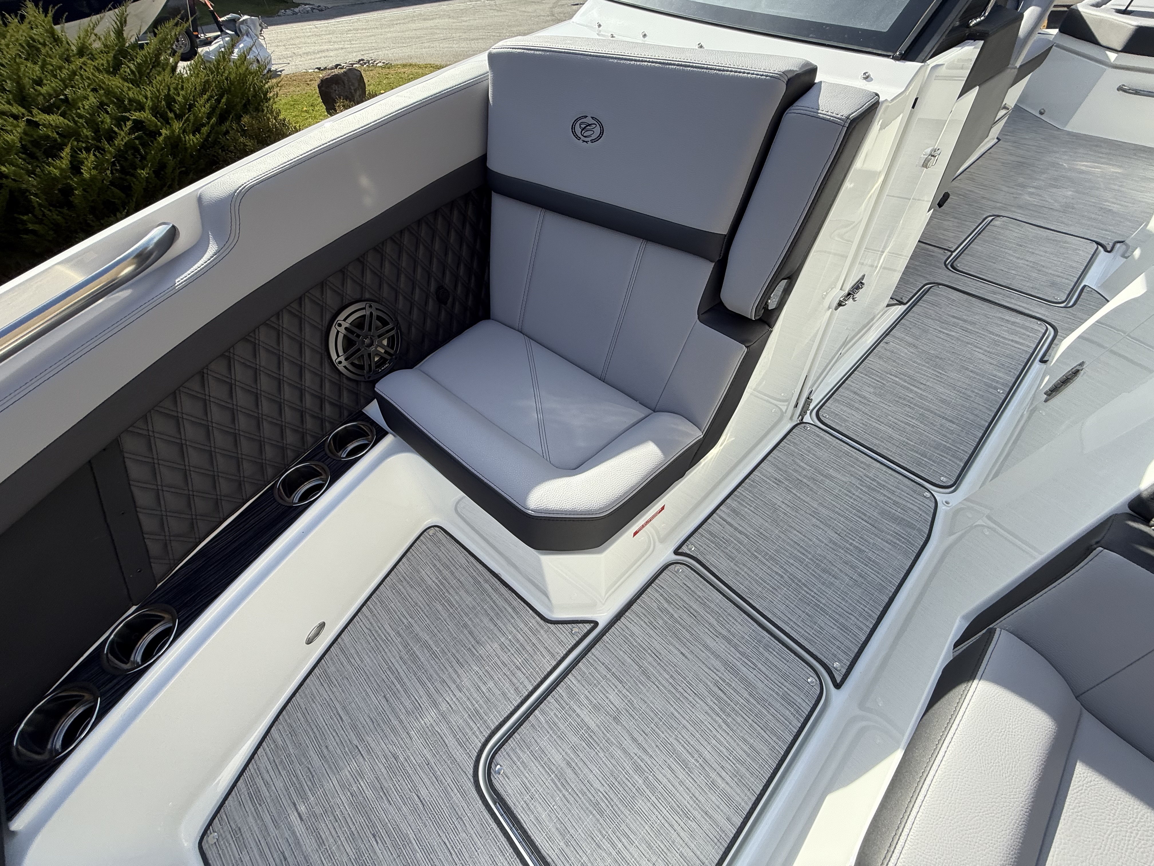 At the helm, the dual Garmin 8610 glass cockpit provides a cutting-edge command center with crystal-clear displays and intuitive controls. Keep your devices powered with the wireless phone charger, and enjoy rich audio from the Premium Sound system with transom speakers—perfect for boat days at anchor or a quiet cruise at dusk.
