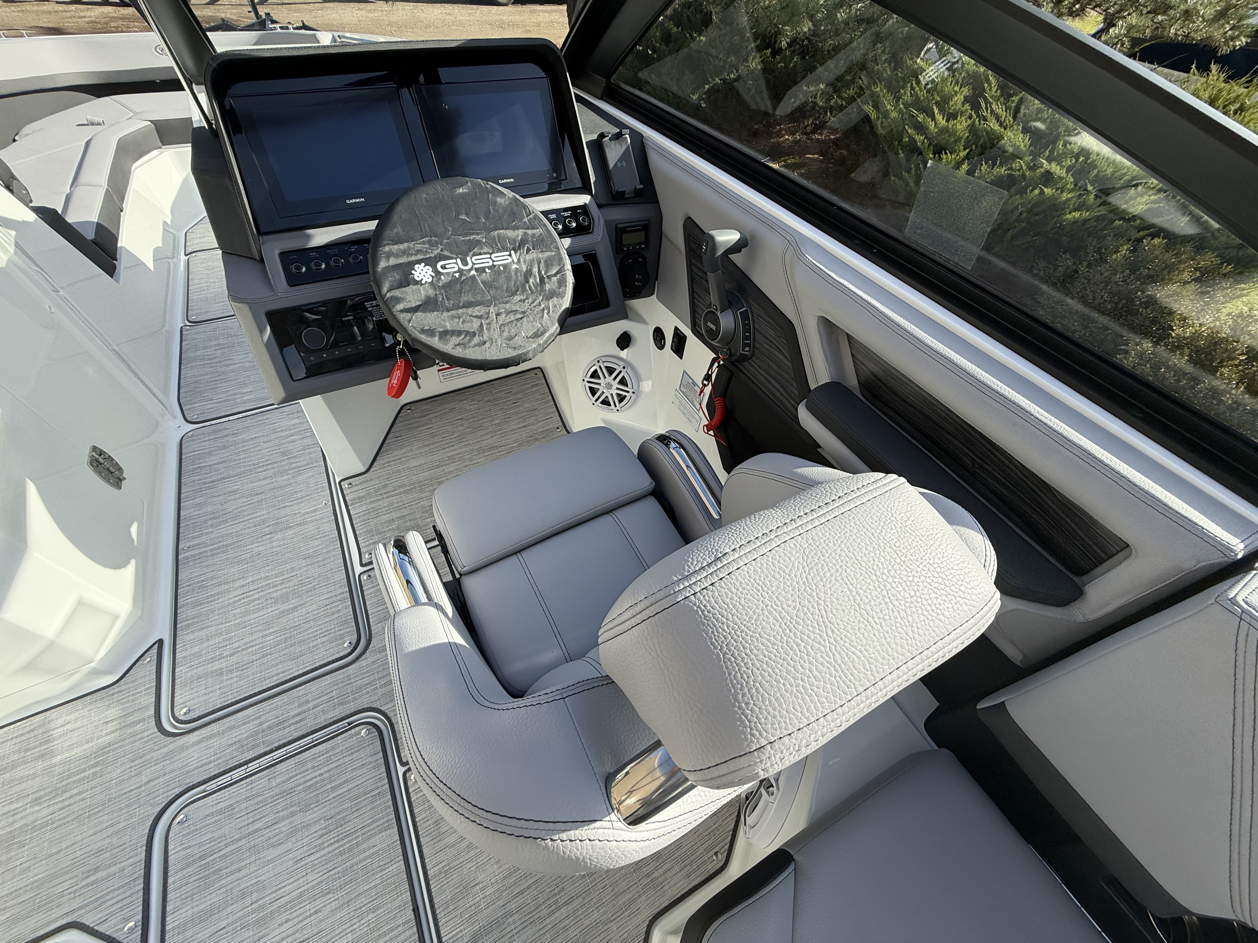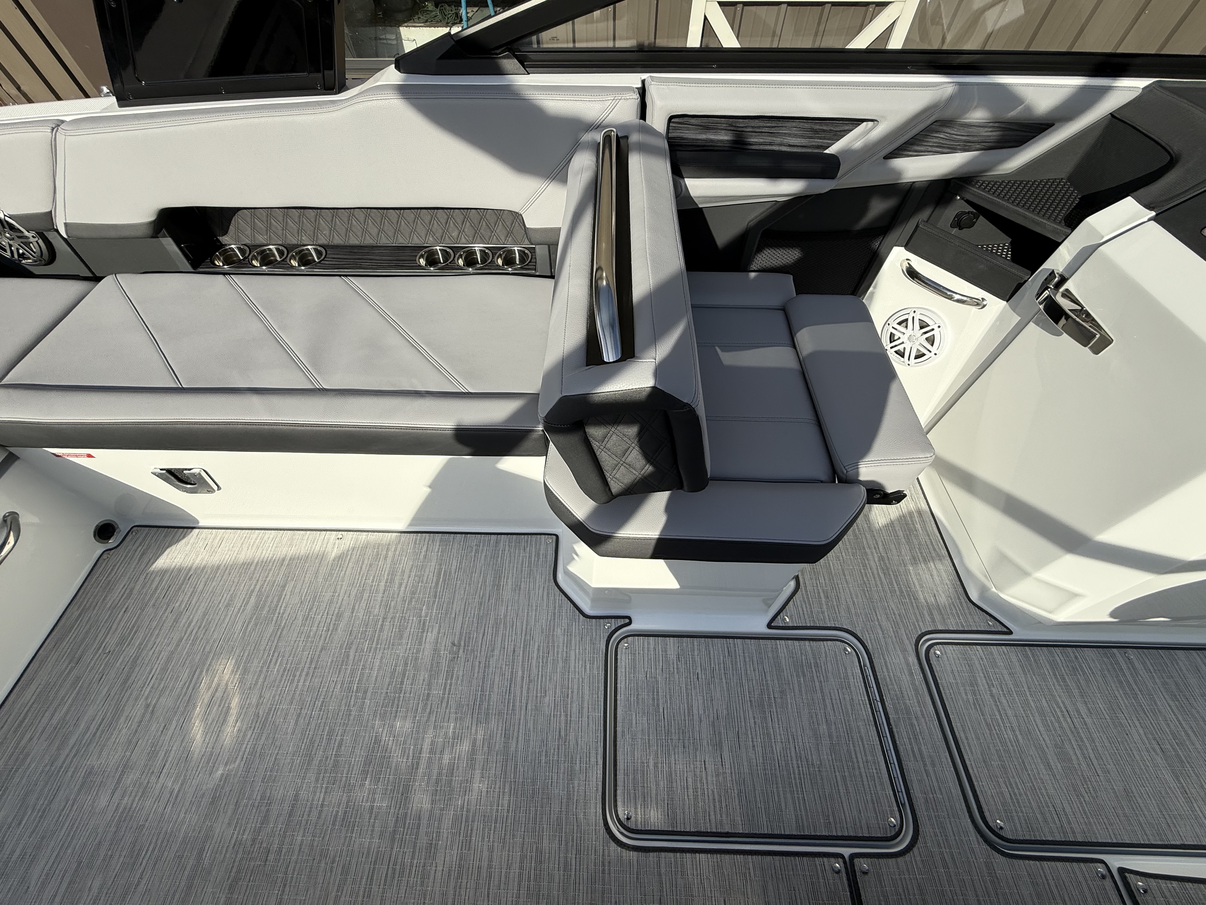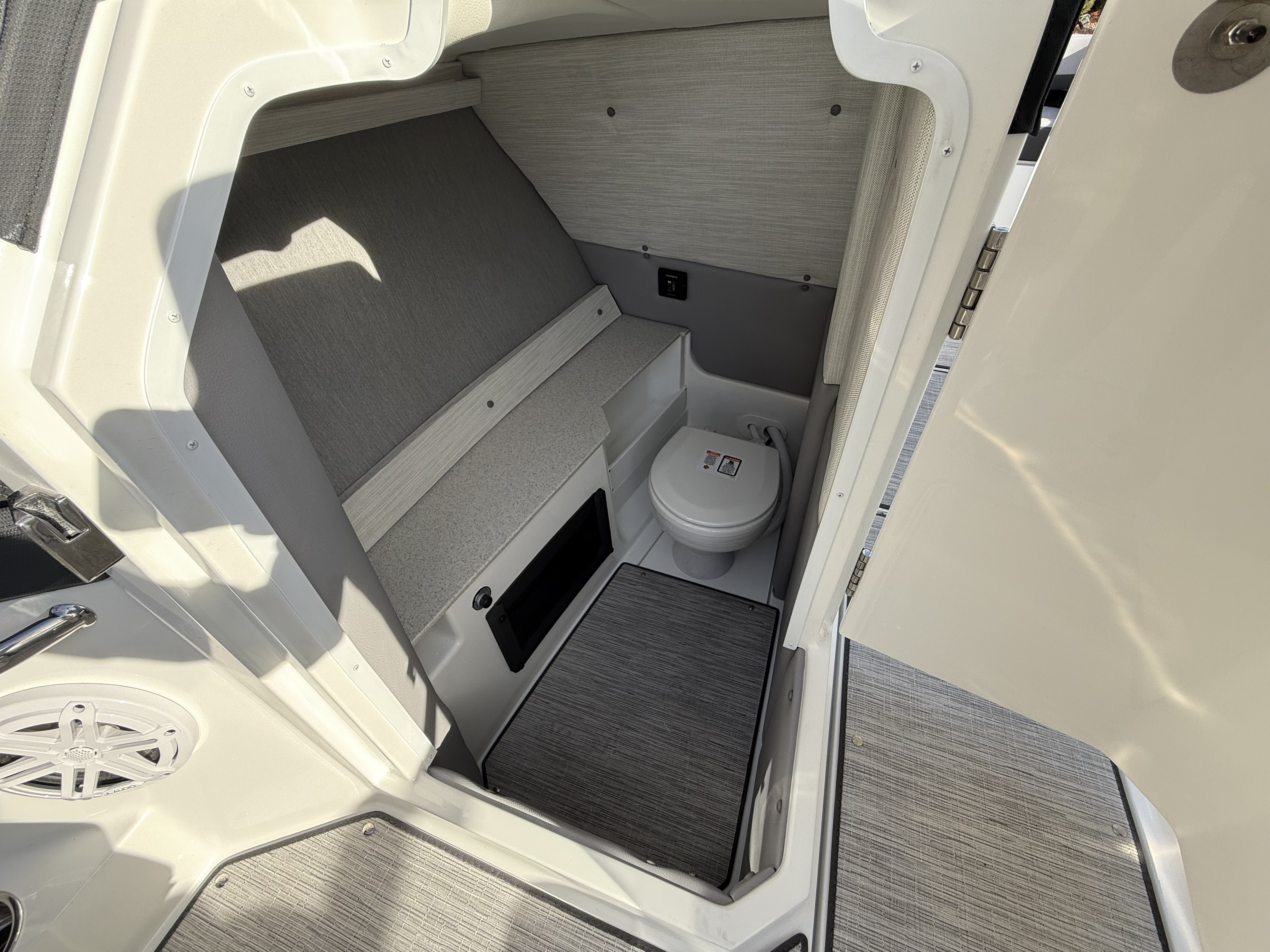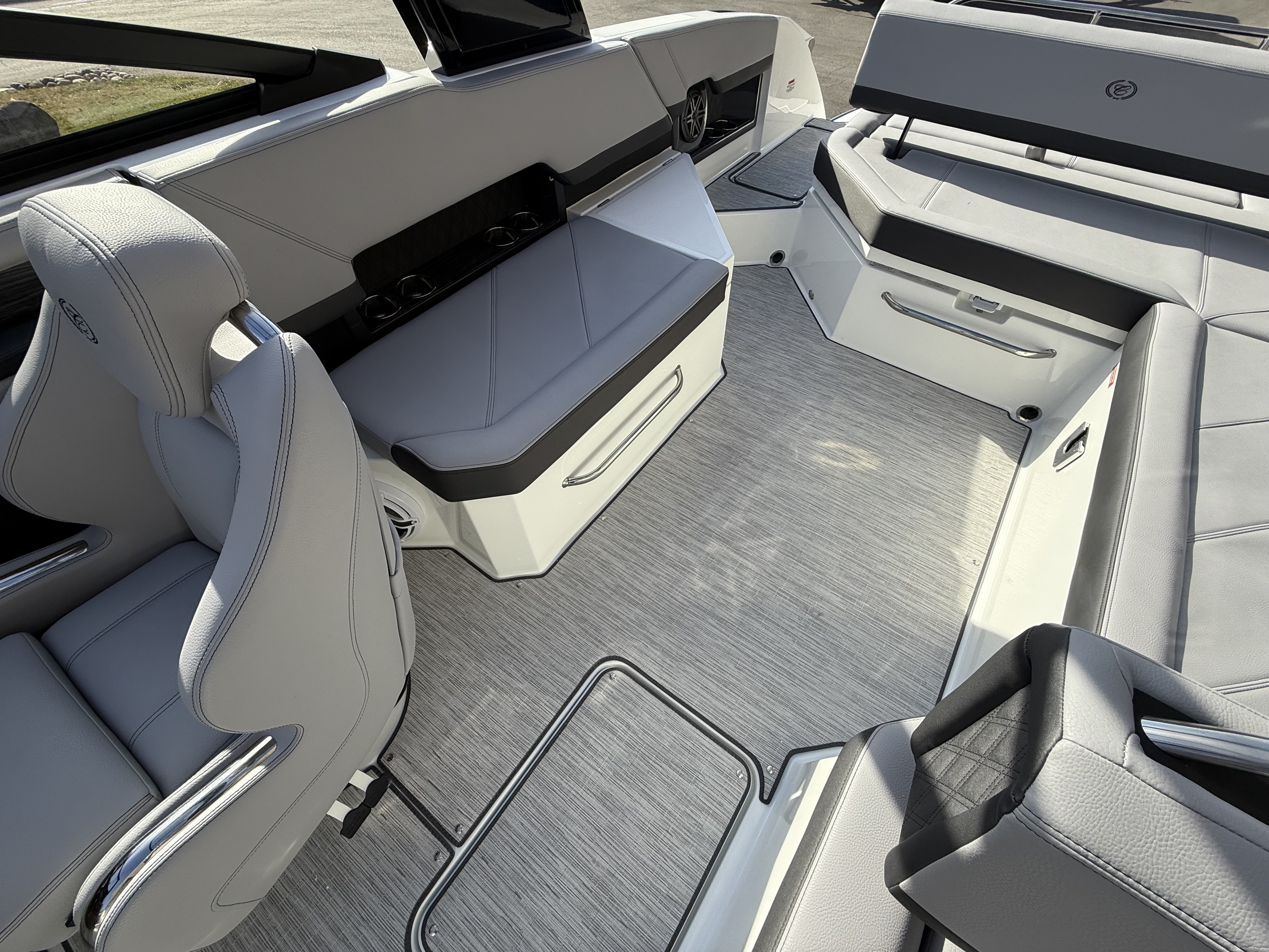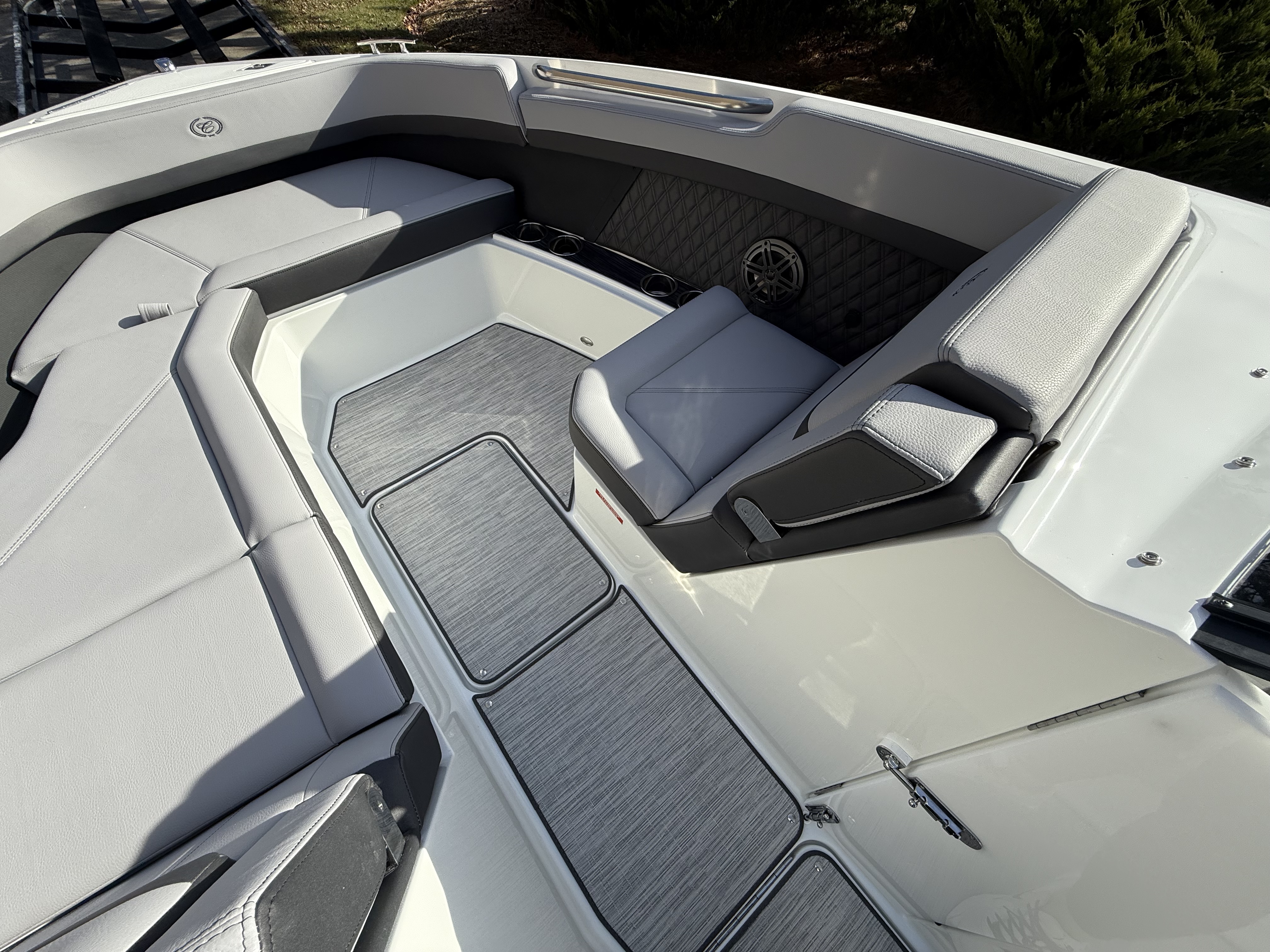 At the helm, the dual Garmin 8610 glass cockpit provides a cutting-edge command center with crystal-clear displays and intuitive controls. Keep your devices powered with the wireless phone charger, and enjoy rich audio from the Premium Sound system with transom speakers—perfect for boat days at anchor or a quiet cruise at dusk.