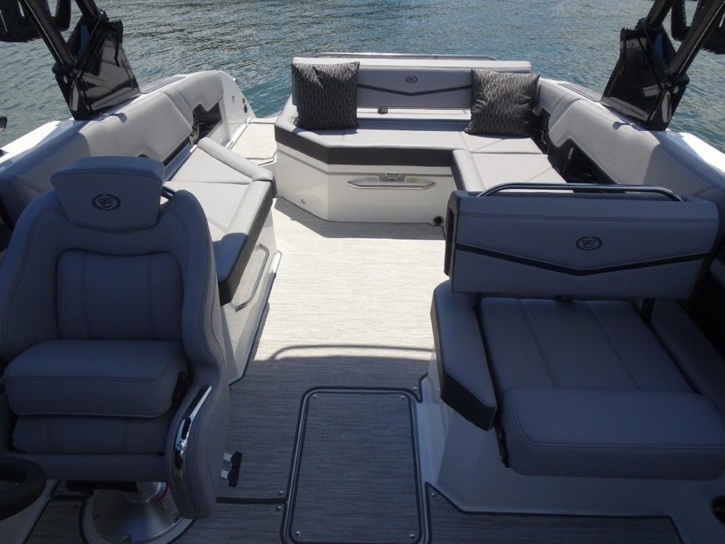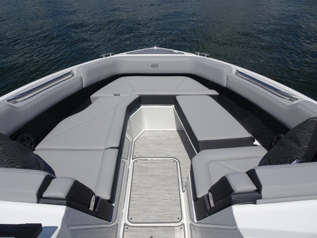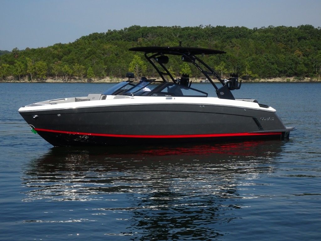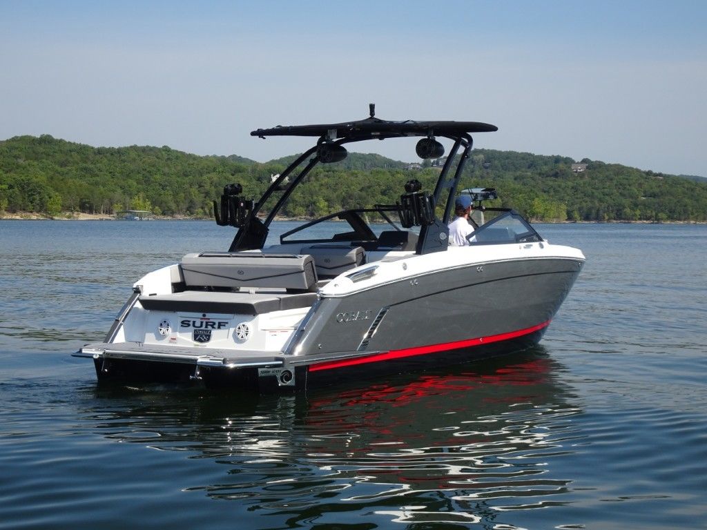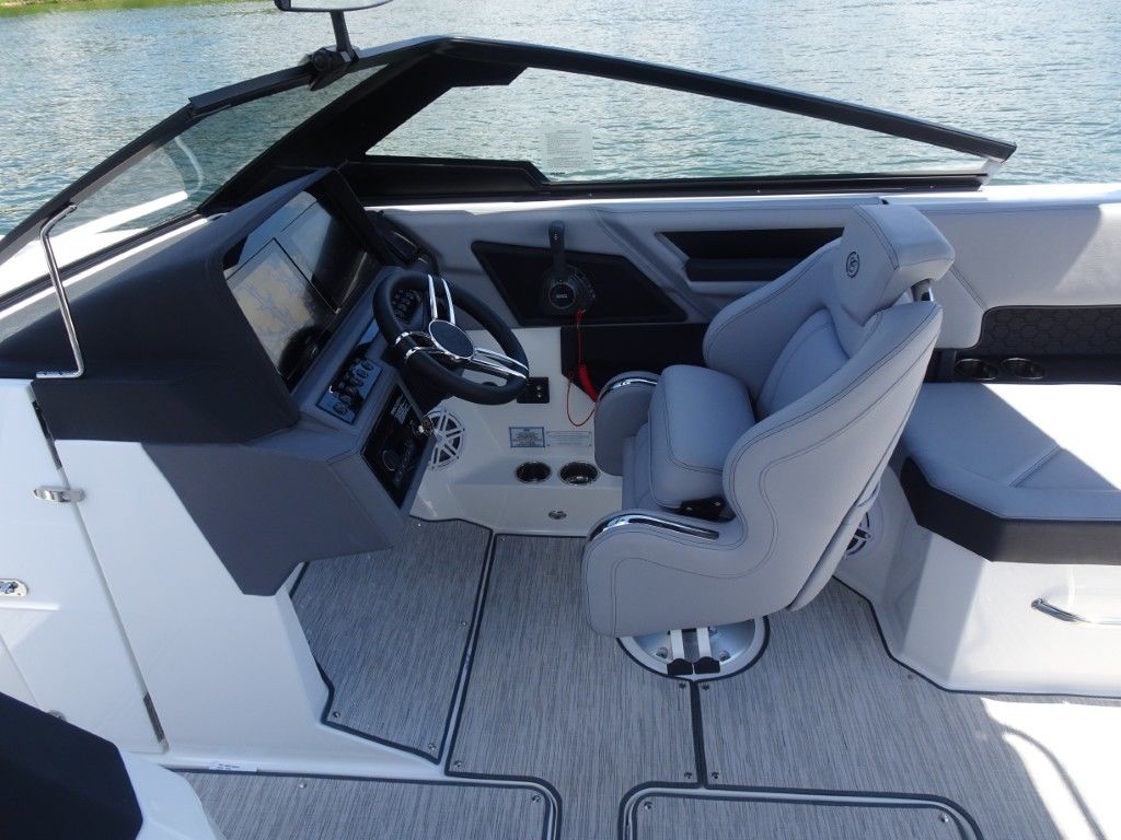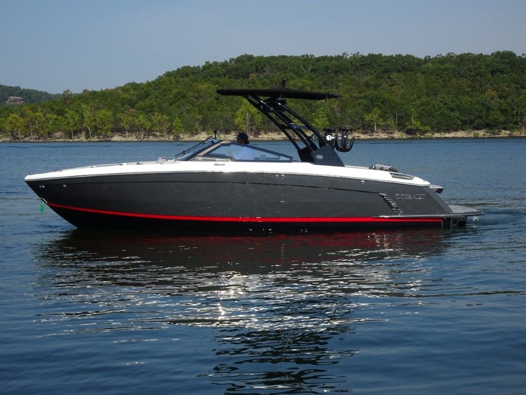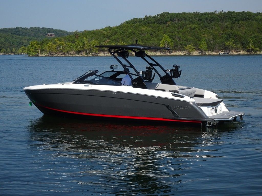 This is a new 2026 Cobalt R8 Surf featuring a Graphite Grey Hull Side, KO Red Accent Stripe, and a Rich Ebony Bottom. It has the Frost/Slate Interior package and is powered by a Volvo Penta 380hp FWD EVC Dual Prop. Other options include: