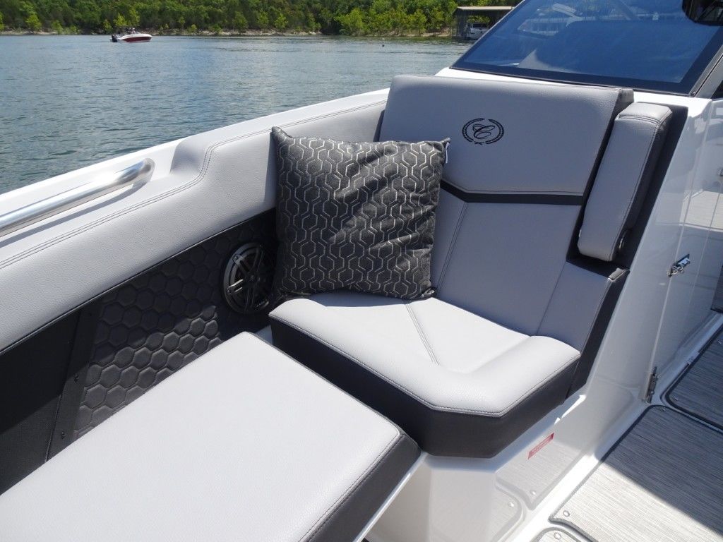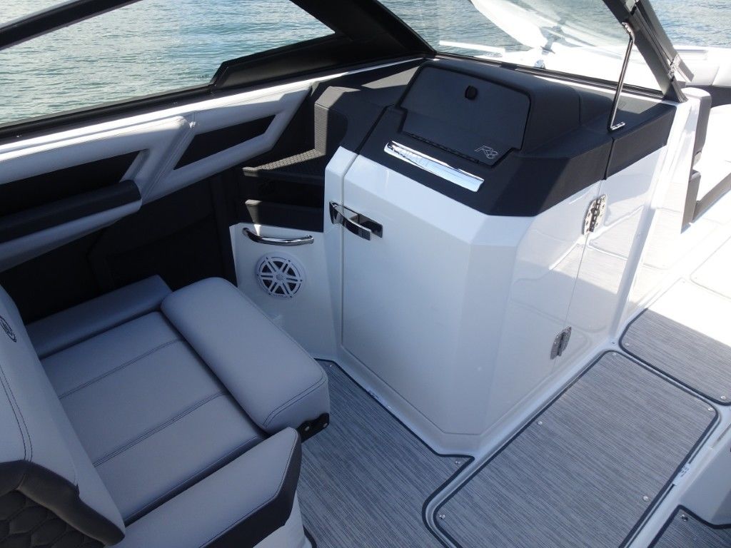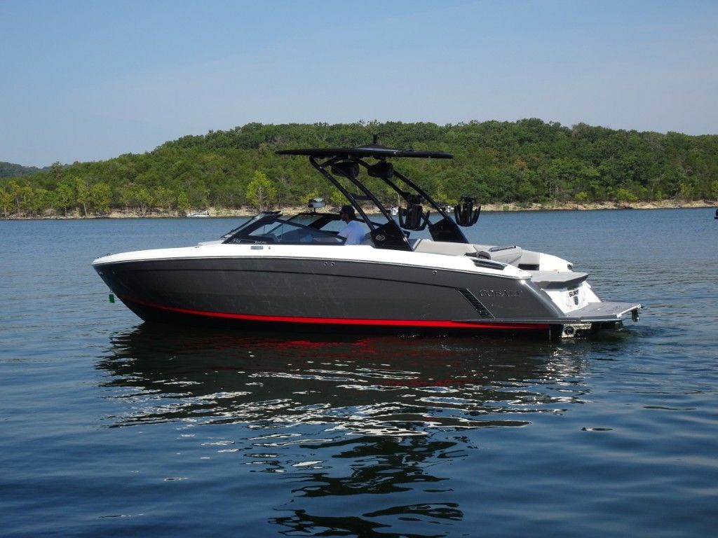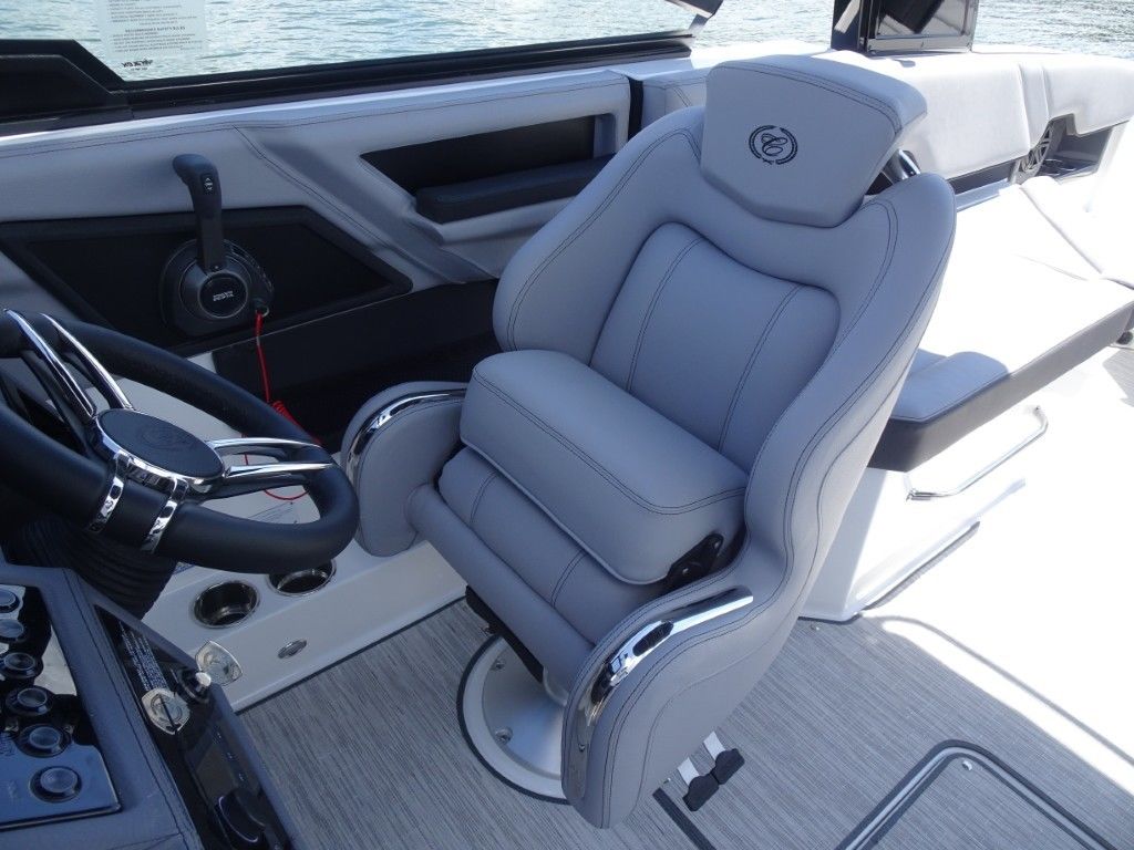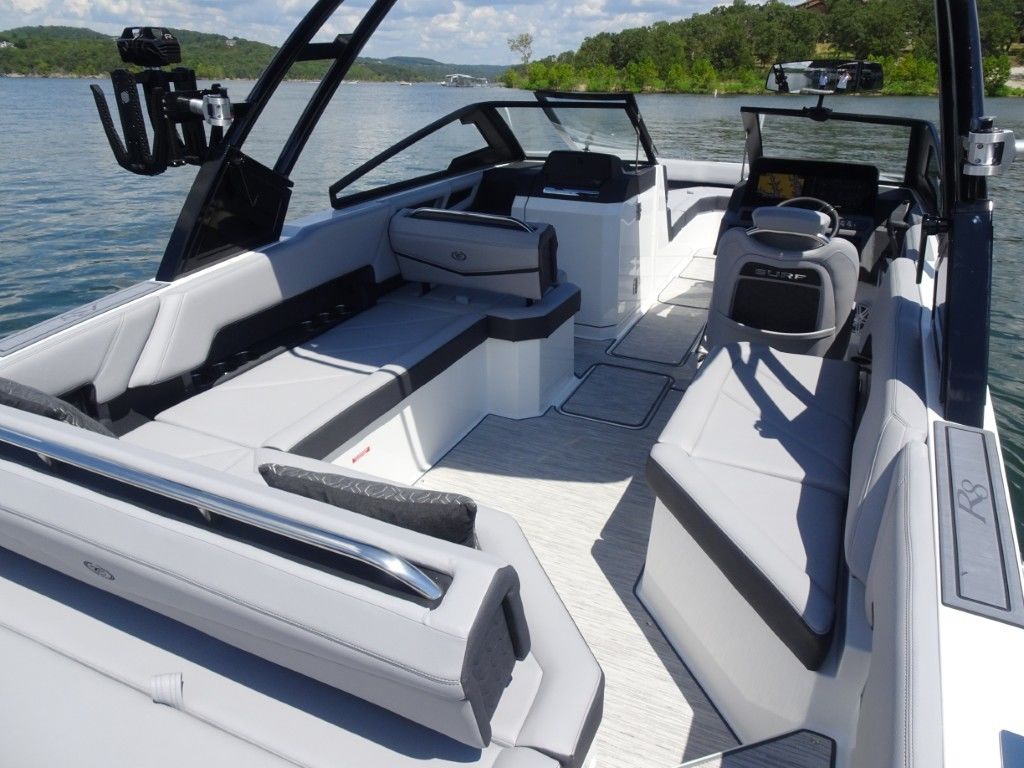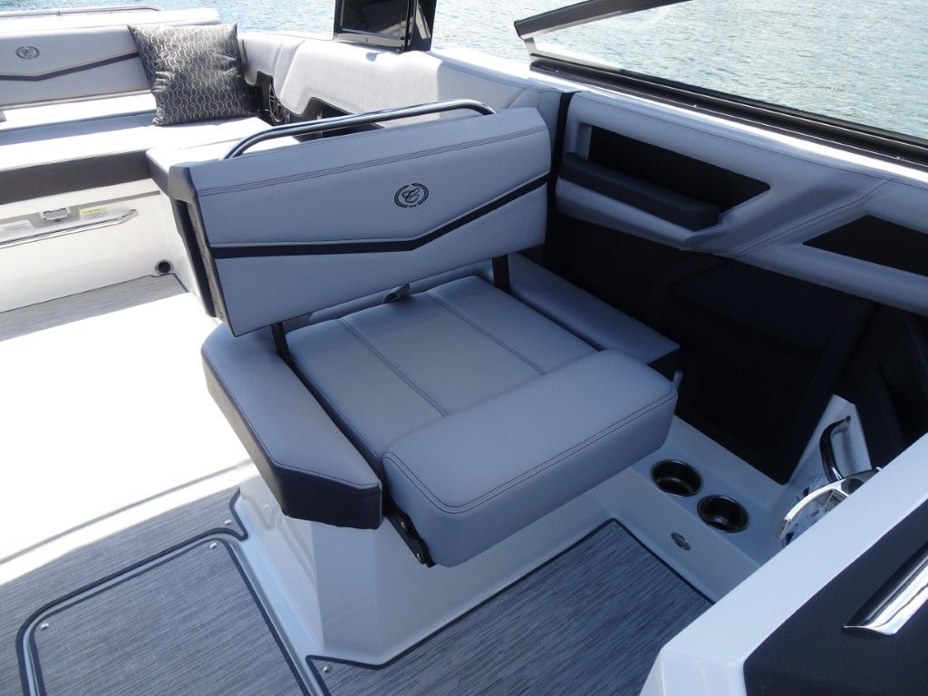 This is a new 2026 Cobalt R8 Surf featuring a Graphite Grey Hull Side, KO Red Accent Stripe, and a Rich Ebony Bottom. It has the Frost/Slate Interior package and is powered by a Volvo Penta 380hp FWD EVC Dual Prop. Other options include: