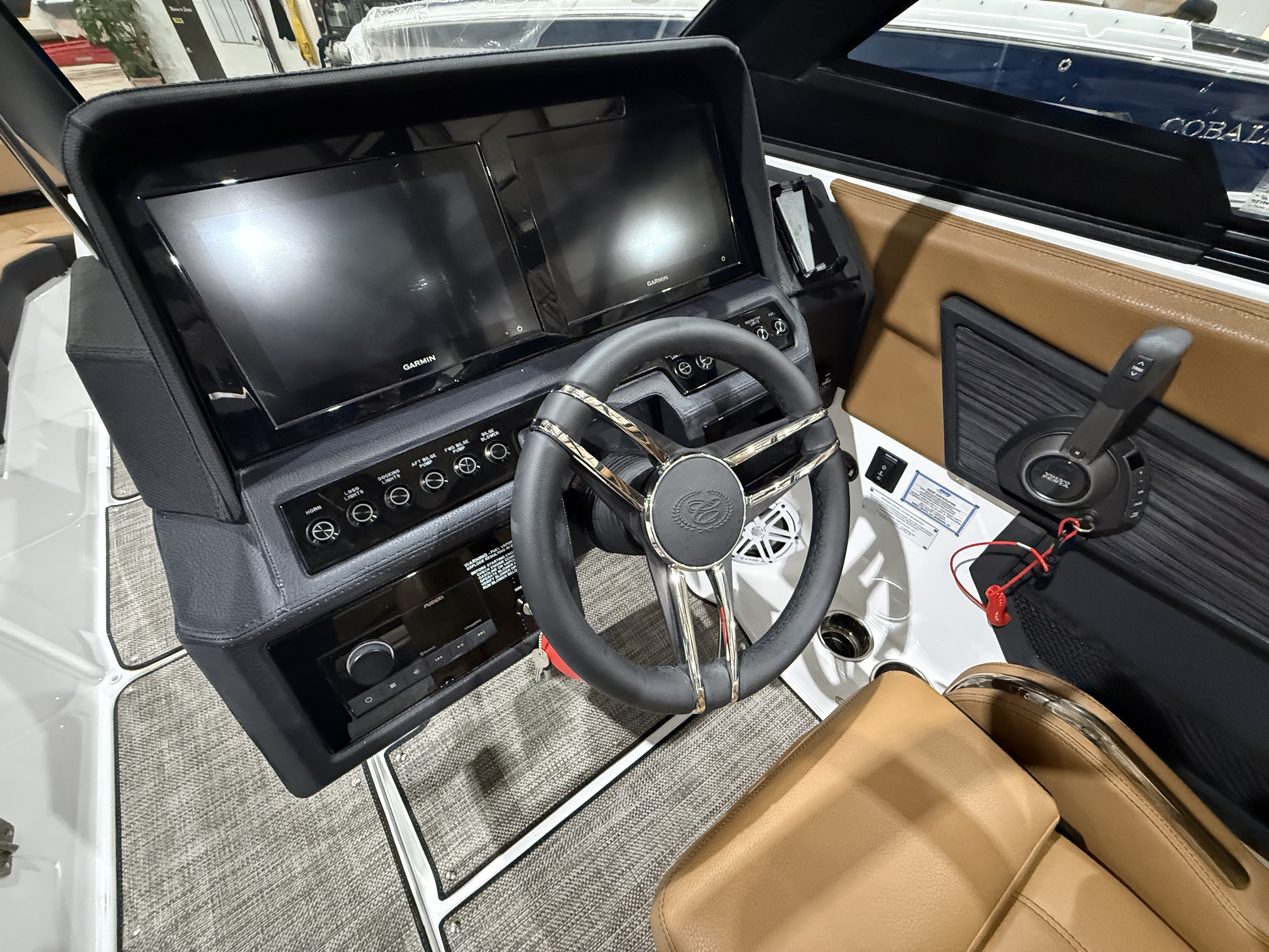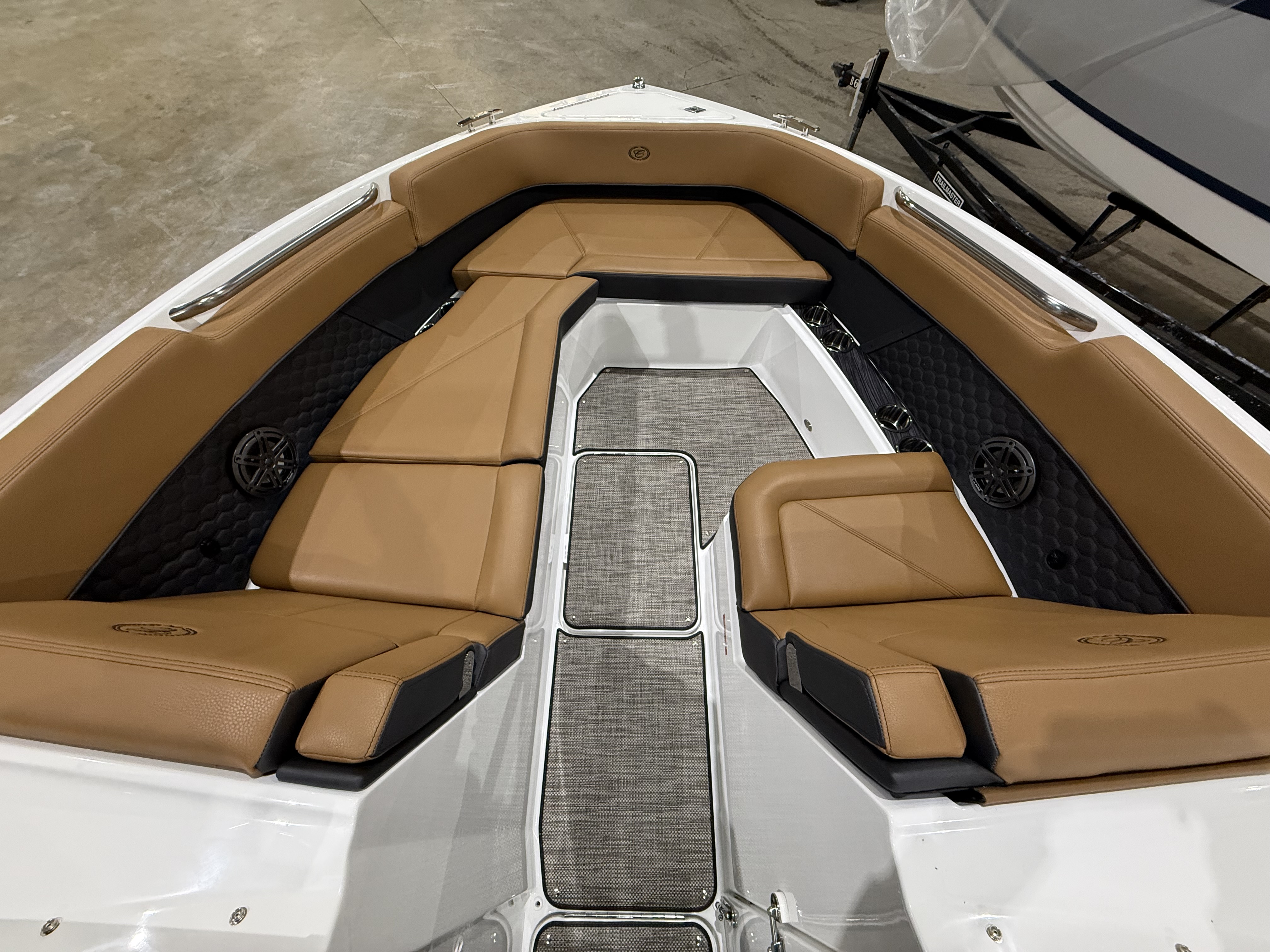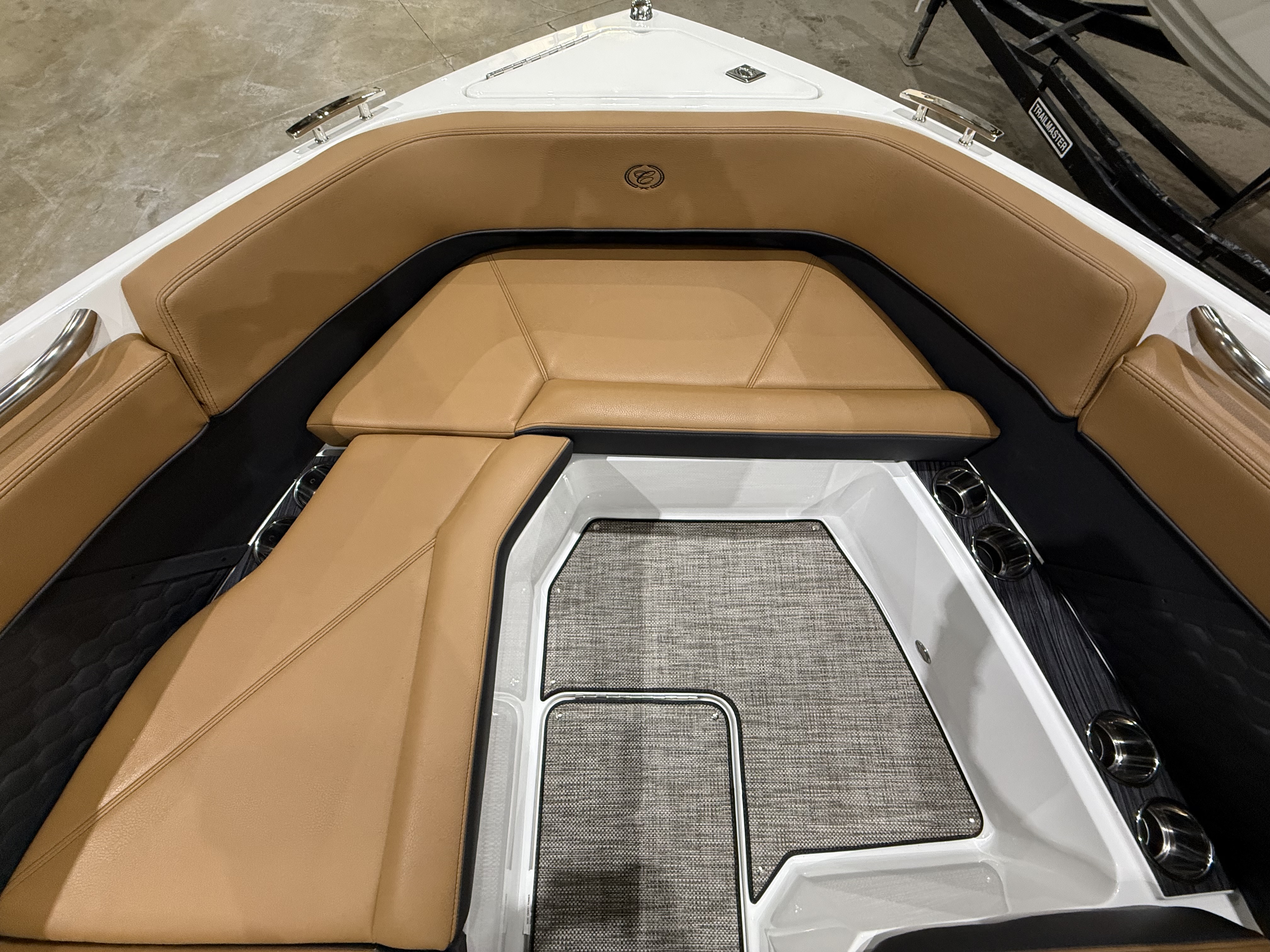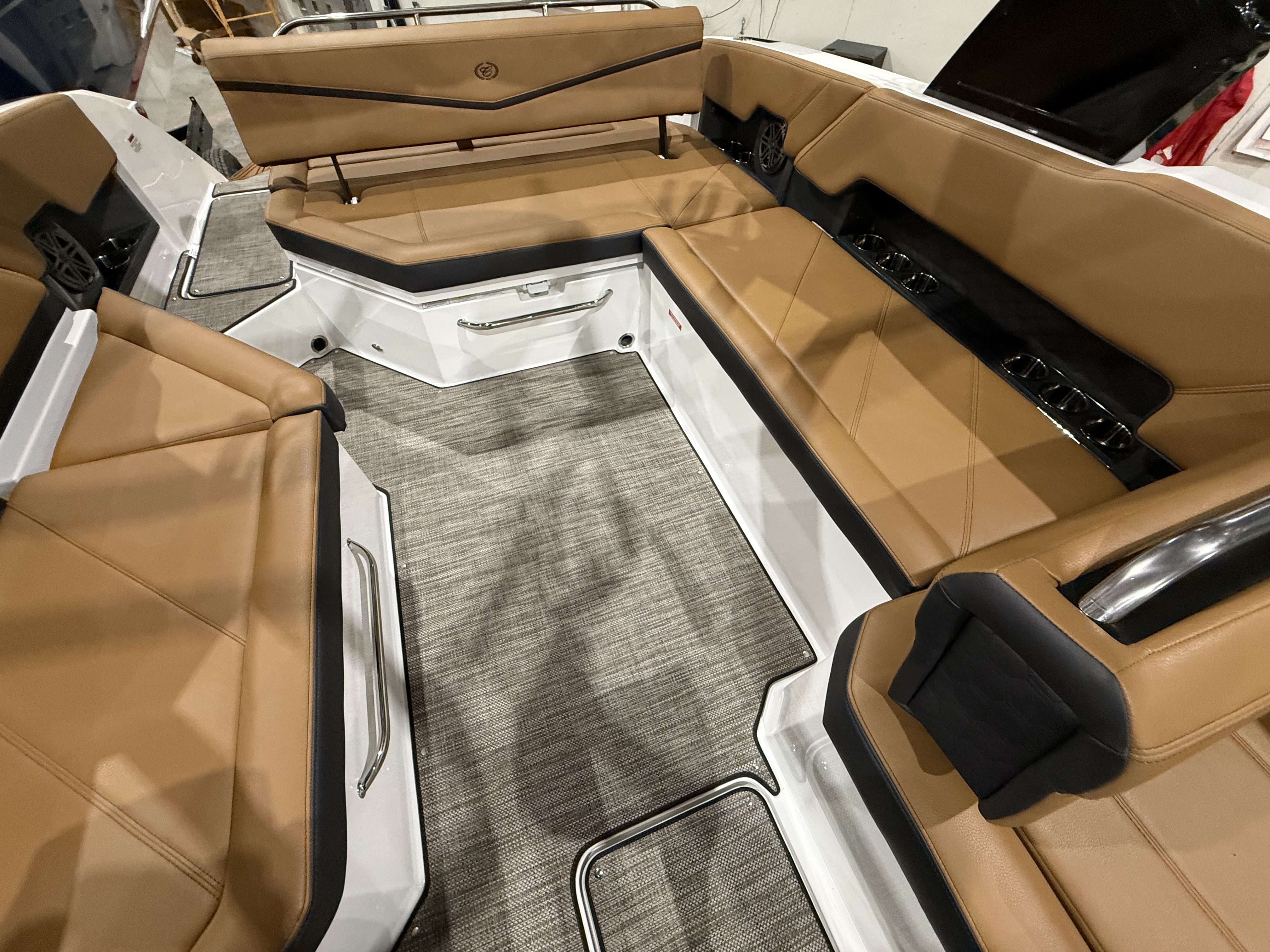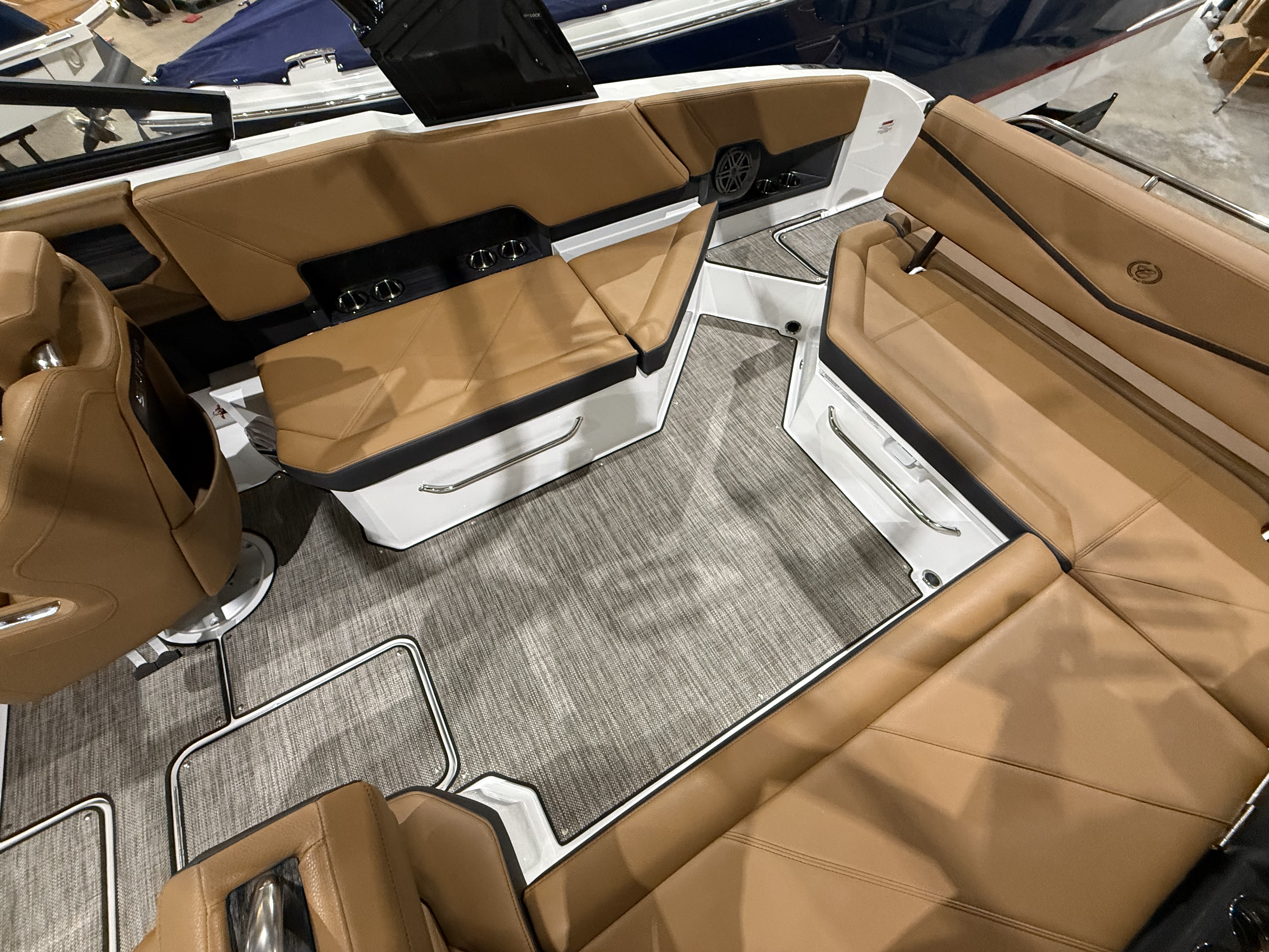 The rich Ebony and White exterior gives this boat a bold, upscale presence, while the Sea Grass flooring adds both durability and barefoot comfort—easy to maintain and perfect for long summer days on the water. Inside, every detail reflects Cobalt’s legendary craftsmanship, from the premium upholstery to the thoughtful layout designed for entertaining, relaxing, and riding.