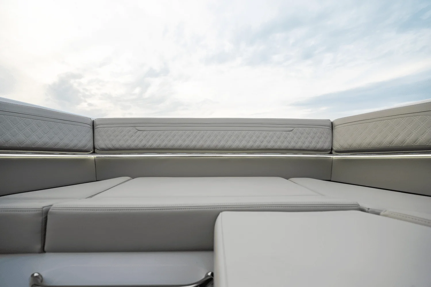 Luxury Finishes - Cruisers Yachts incorporates numerous intricate details for superior finishes. 316L-grade stainless steel metal components enhance durability throughout the vessel, reinforcing key elements such as deck cleats, rail stanchions, arch legs, and sump and bilge pump foundations. Cutting-edge machines and hand-sewn techniques create high-quality upholstery. Top-quality materials are used for a classic and durable interior look. Exotic woods are meticulously selected, machine-sanded, and finished to withstand marine environments.