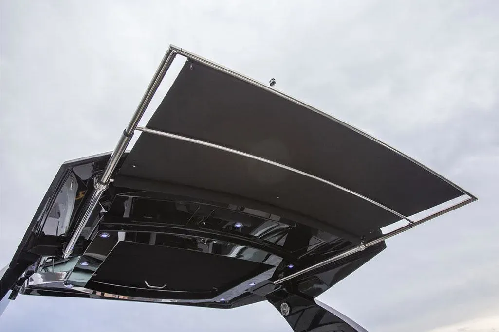 Bow Seating - Socialize in the deep bow seating of the 38 GLS. Rockford Fosgate speakers, multiple cupholders, and a convertible table make entertaining a breeze. An optional foredeck shade will keep your guests nice and cool.