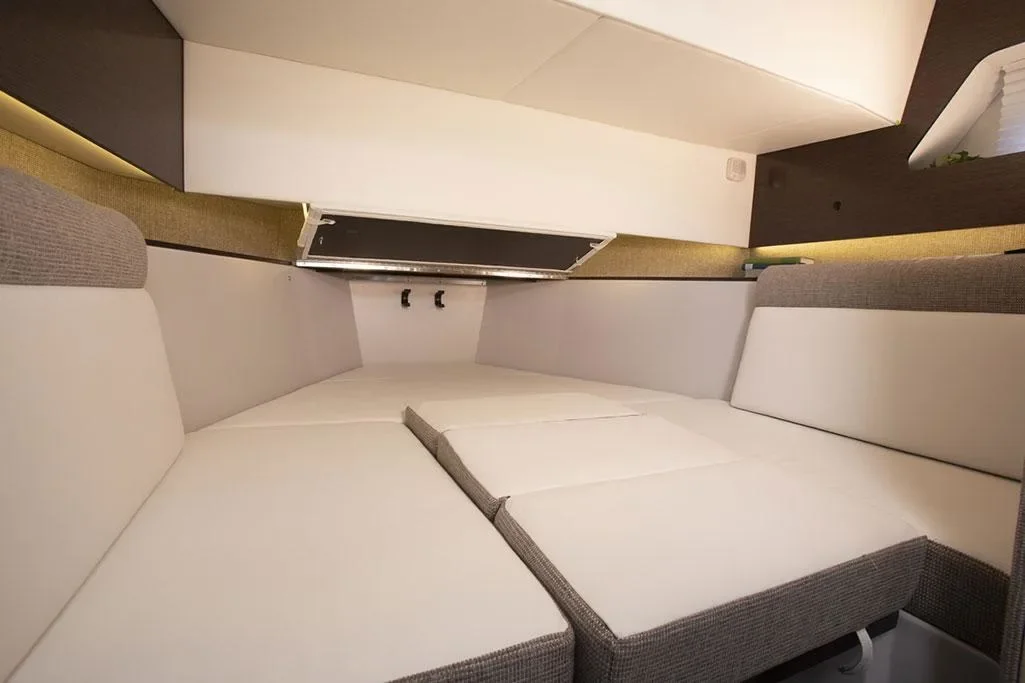 Aft Stateroom - Need to rest for the night? The aft stateroom features a custom sized berth, personal reading lights, shelf storage, and optional TV.