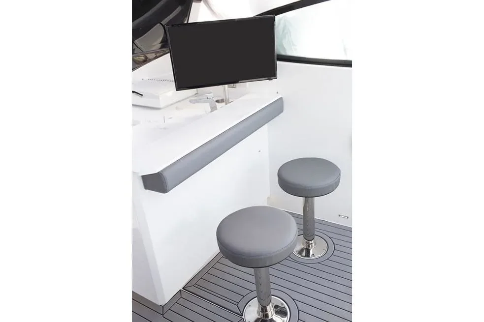 Helm - Command the helm with Simrad electronics and joystick. Also, at the helm is a conductive phone charging pad. Underneath the bolster helm chair is storage or an optional ice maker.