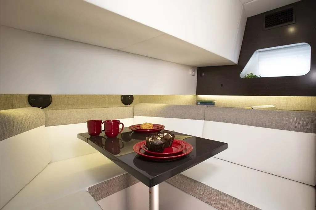 Bow Seating - Socialize in the deep bow seating of the 38 GLS. Rockford Fosgate speakers, multiple cupholders, and a convertible table make entertaining a breeze. An optional foredeck shade will keep your guests nice and cool.