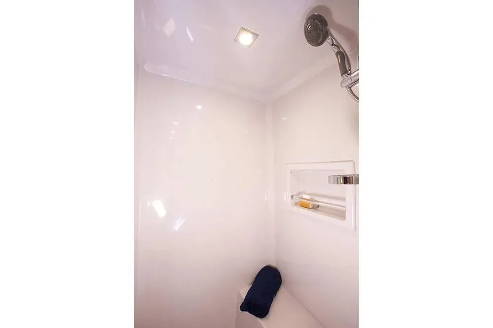 Master Head - You'll have all the privacy you need with the en-suite master head located just off the stateroom, which is equipped with a vessel sink, toilet, and separate shower stall. Store your toiletries in the concenient cabinets beneath the sink. There's also ample counter space and shelves for towels.