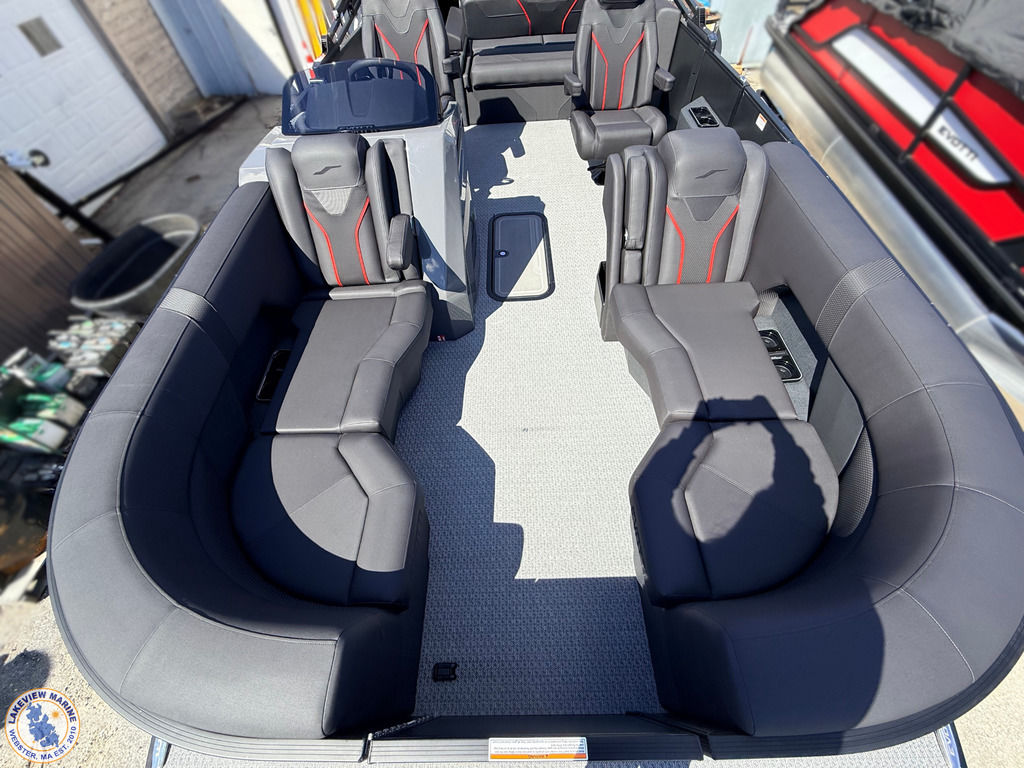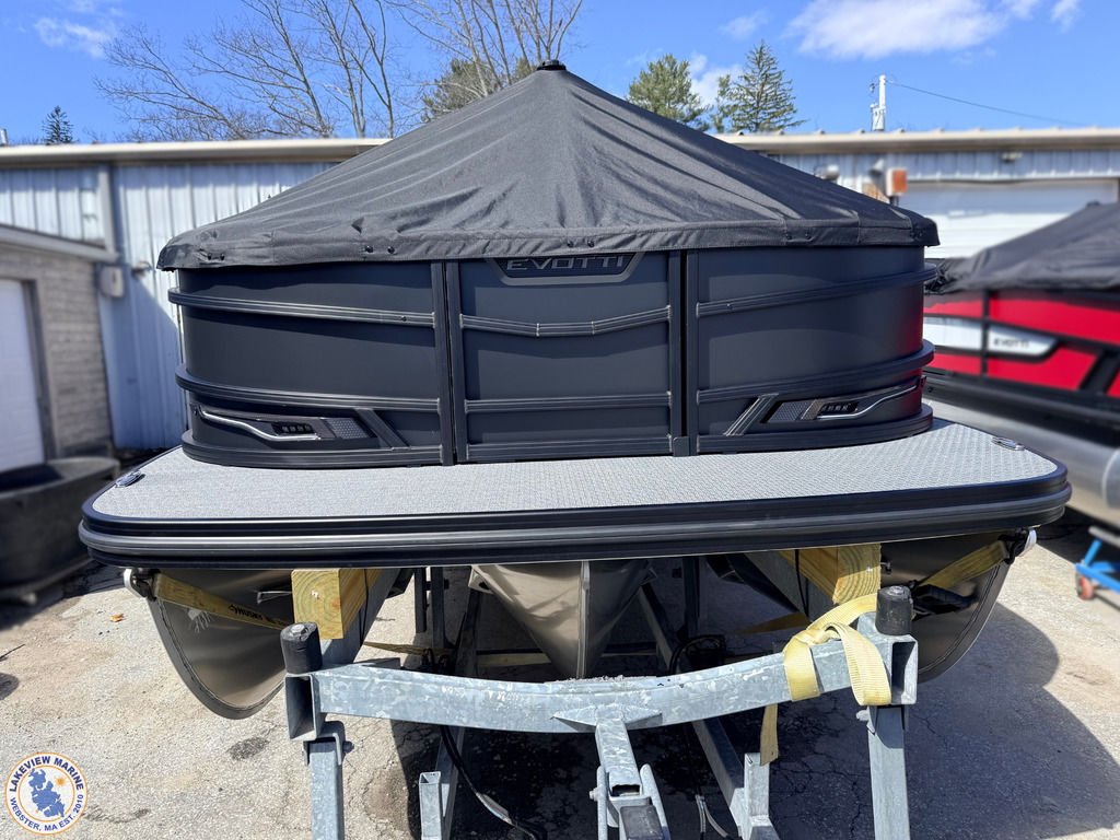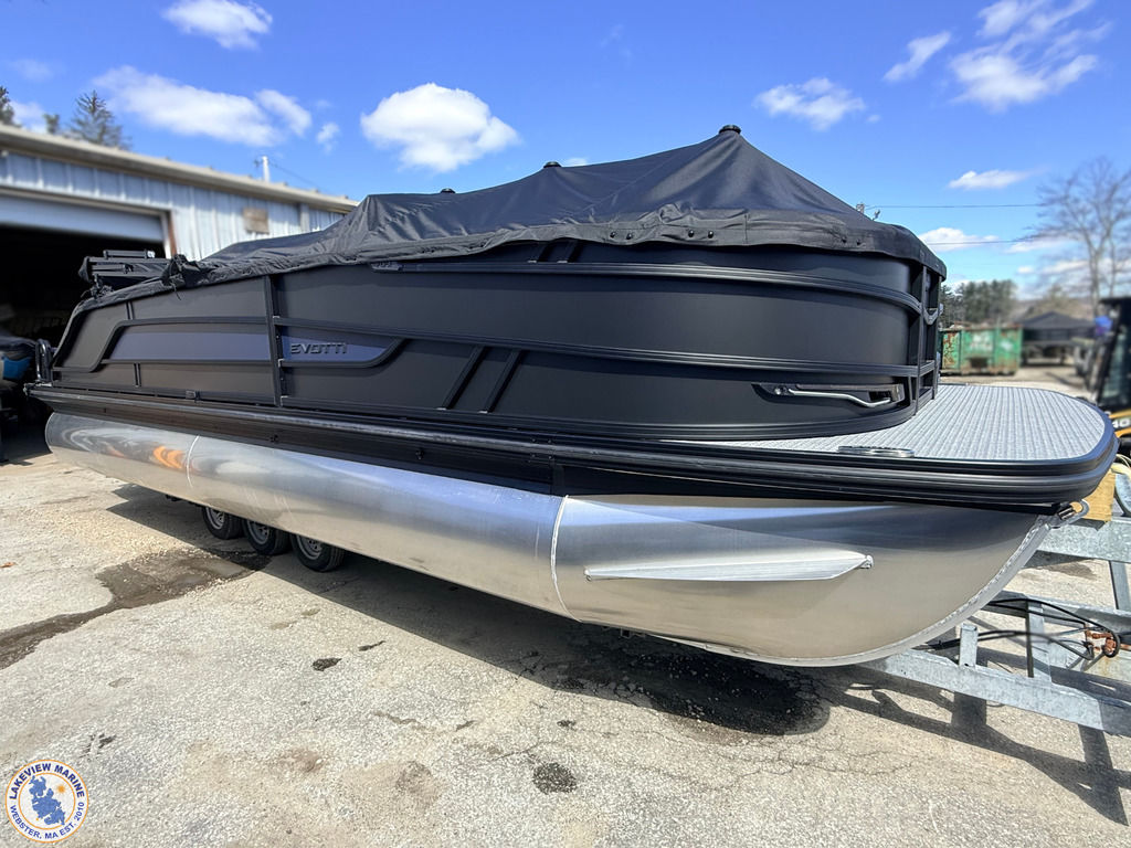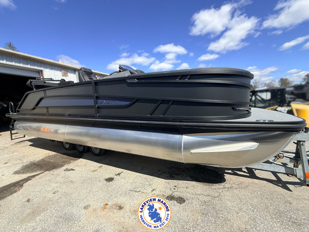 Evotti 723CS in Diamond Black Satin / Platinum Blue Satin! This tritoon is rigged with the 250hp Yamaha V-Max SHO Outboard for reliability and strong performance! Features include Spectra Black Interior Vinyl, Steel Gray Evolution Flooring, 15" Ultra-Wide Garmin Display, Power Assist Steering, 7-Position Convertible Stern, Exterior White Lighting Package and Fusion Head Unit w/ JL Audio Speakers, Sub & Amp!