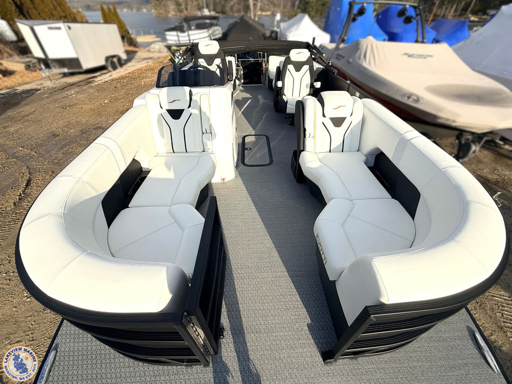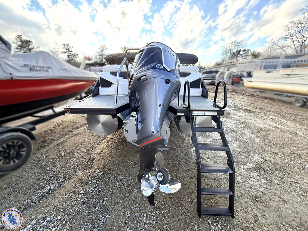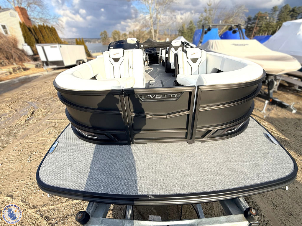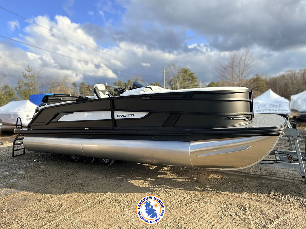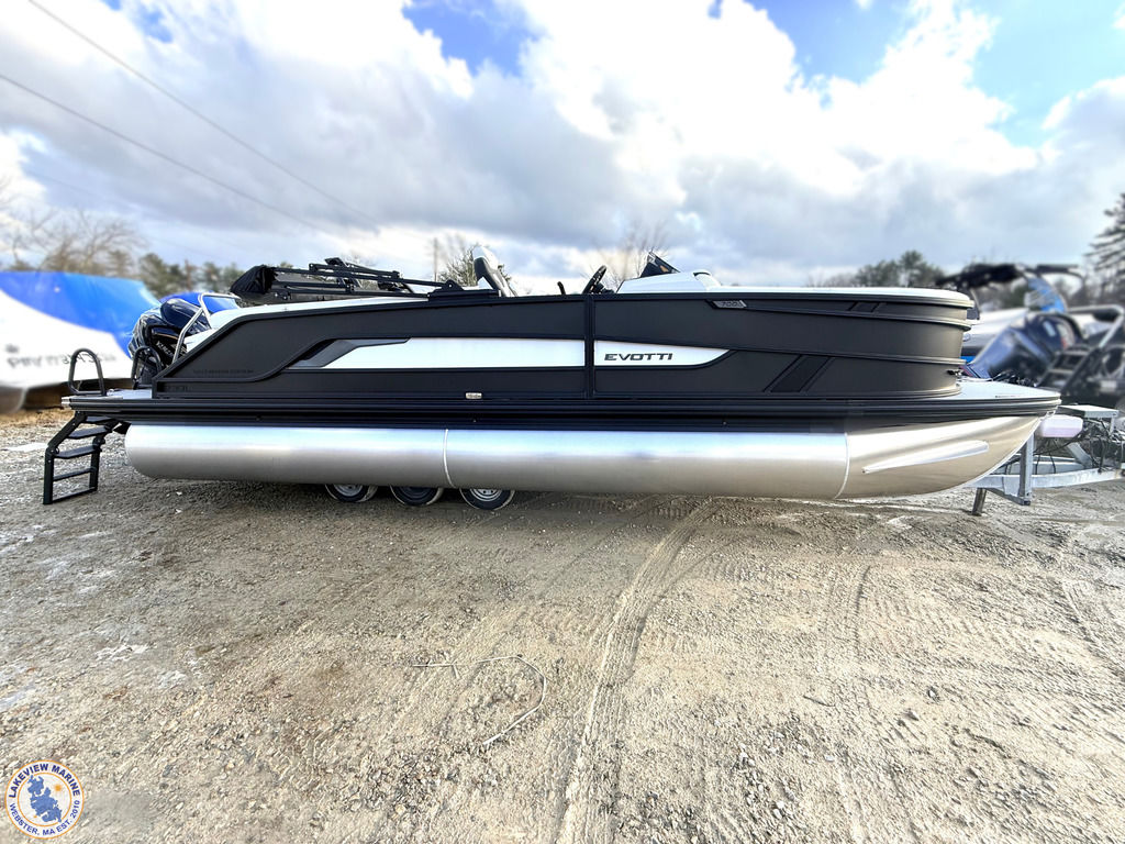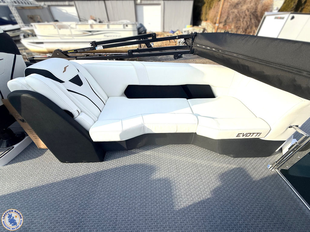 Stunning 700 Series 23' Quad Lounge model from Evotti Marine in Diamond Black Satin with a Pearl White Gloss accent panel. This Tritoon is paired with the Yamaha 250hp V-Max SHO Outboard with Power Assist Steering. Features include 15" Ultra Wide Display at the Helm, Elevated Helm w/ Marine Mat, JL Premium Head Unit & Speakers and much more!