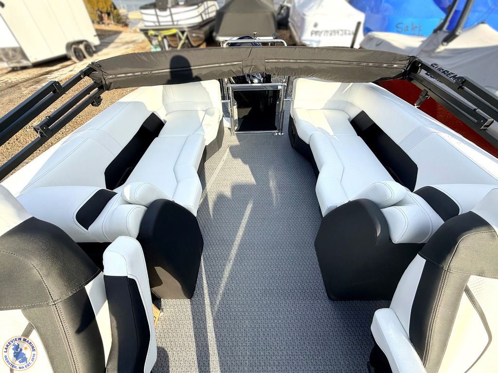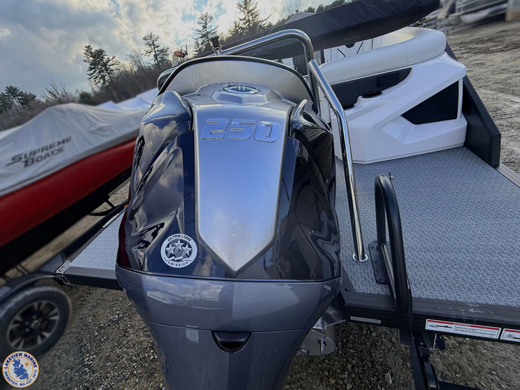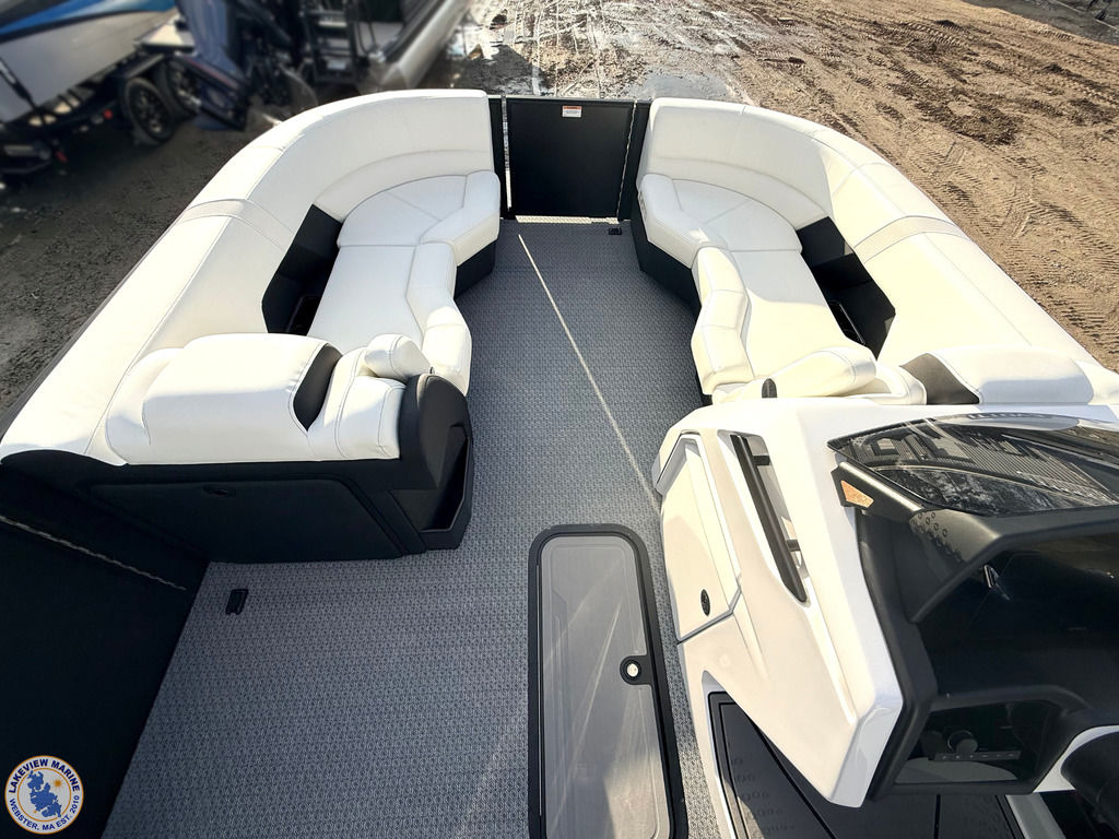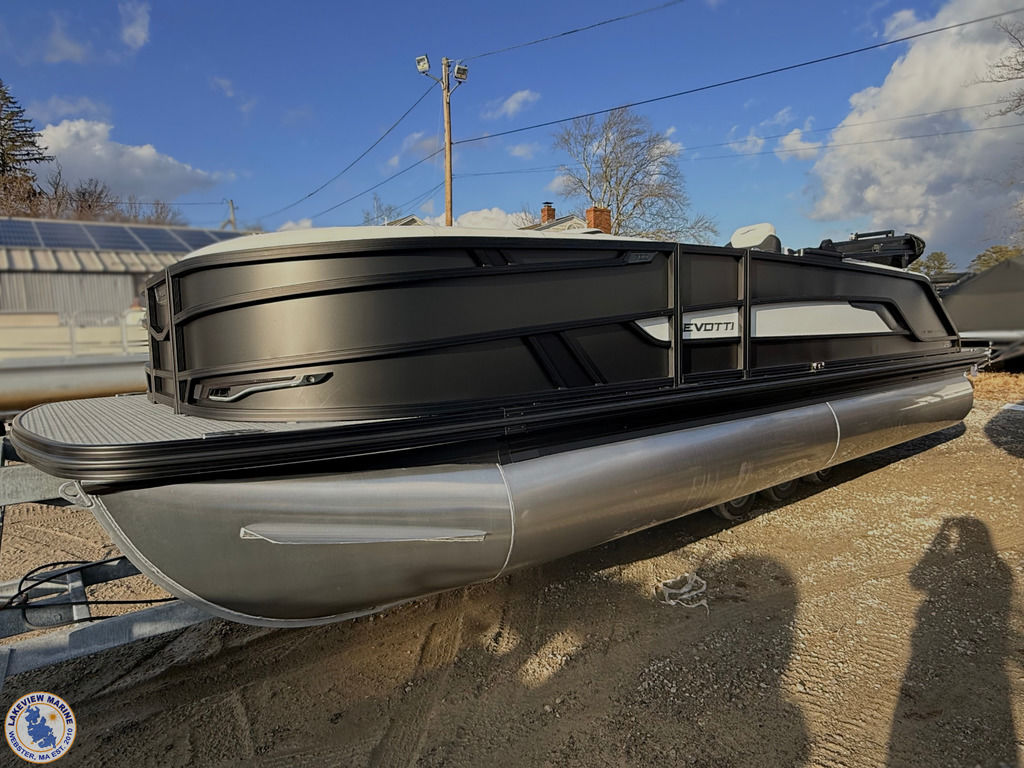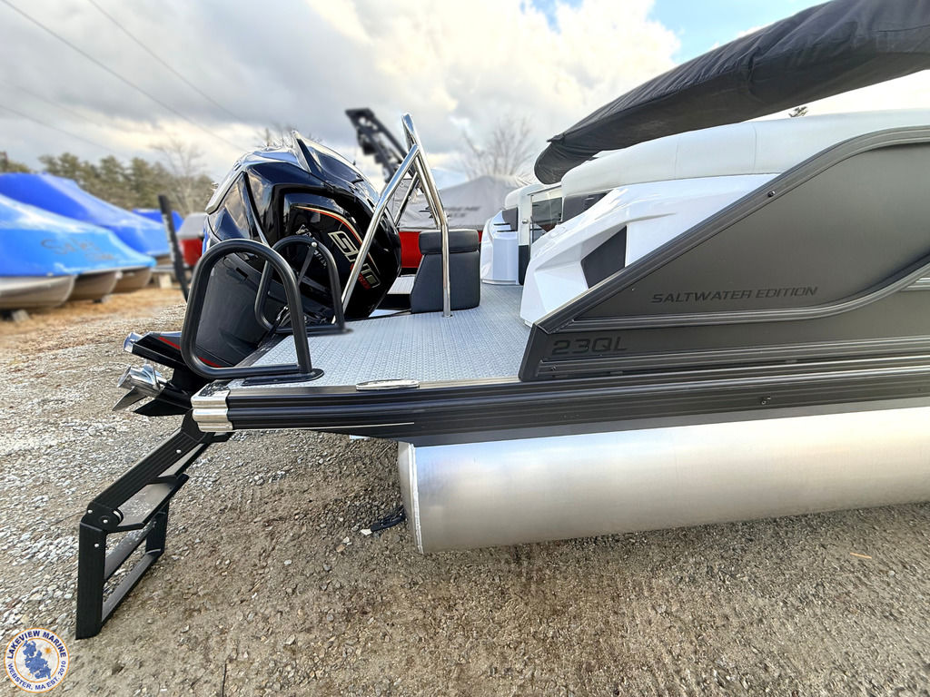 Stunning 700 Series 23' Quad Lounge model from Evotti Marine in Diamond Black Satin with a Pearl White Gloss accent panel. This Tritoon is paired with the Yamaha 250hp V-Max SHO Outboard with Power Assist Steering. Features include 15" Ultra Wide Display at the Helm, Elevated Helm w/ Marine Mat, JL Premium Head Unit & Speakers and much more!