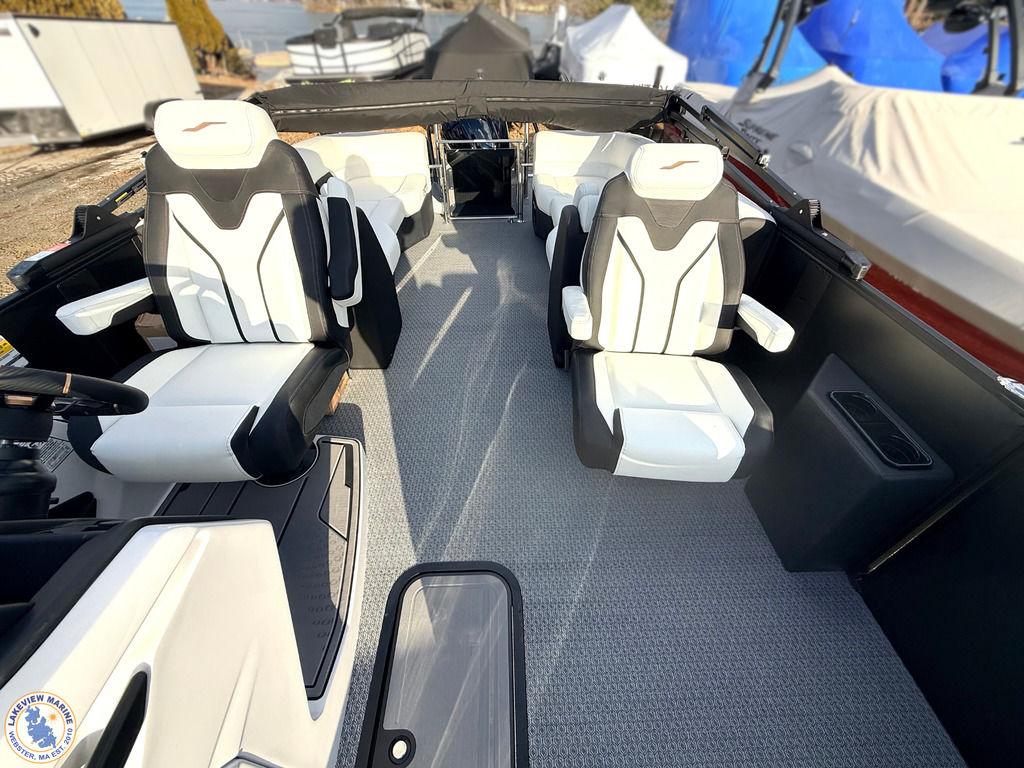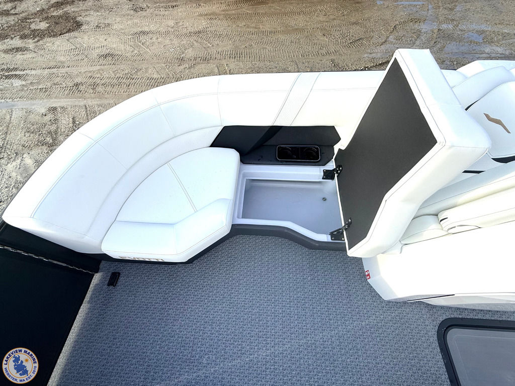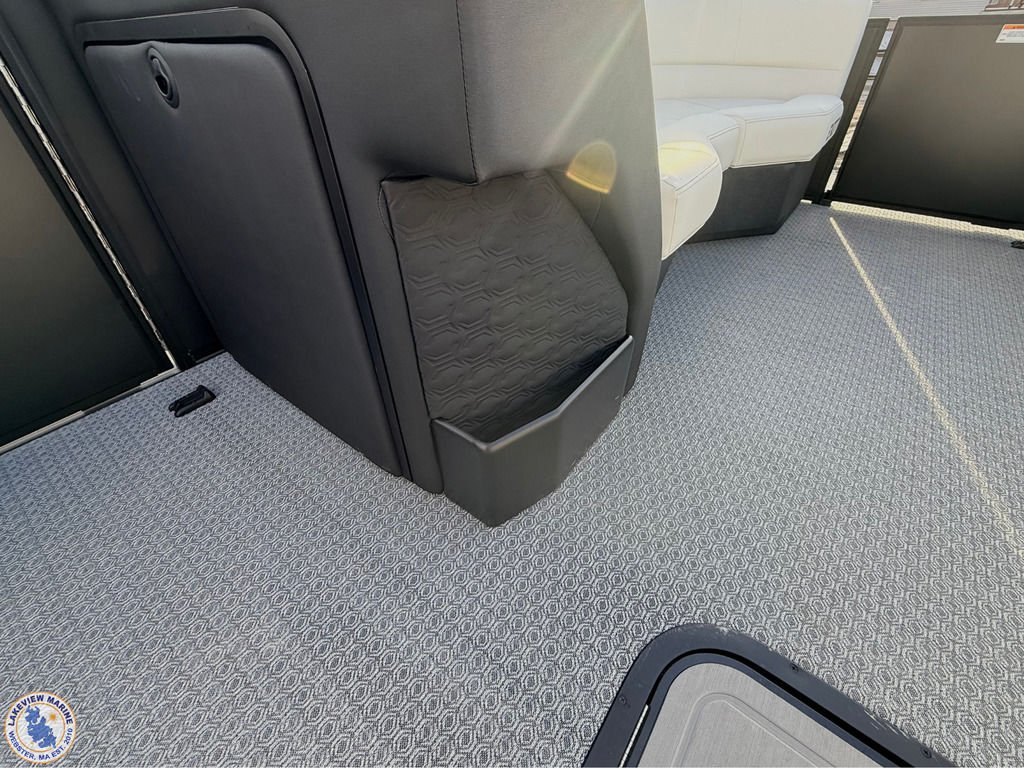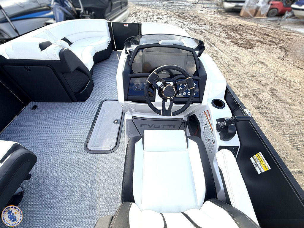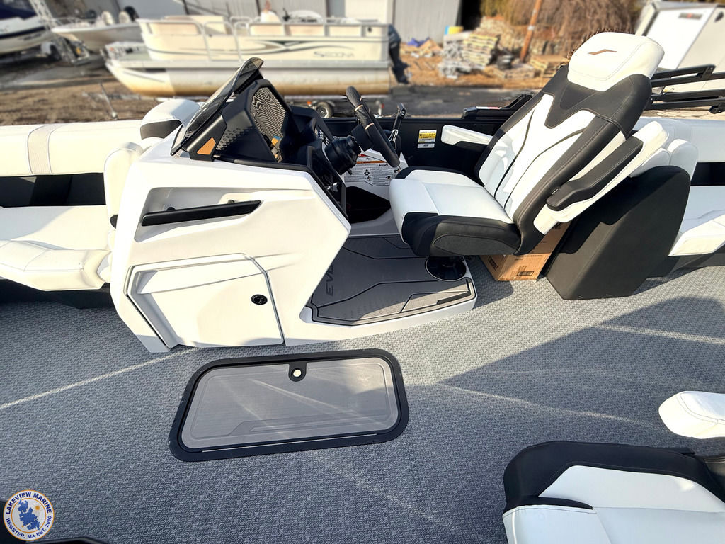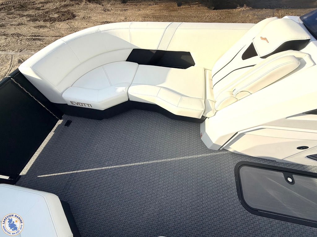 Stunning 700 Series 23' Quad Lounge model from Evotti Marine in Diamond Black Satin with a Pearl White Gloss accent panel. This Tritoon is paired with the Yamaha 250hp V-Max SHO Outboard with Power Assist Steering. Features include 15" Ultra Wide Display at the Helm, Elevated Helm w/ Marine Mat, JL Premium Head Unit & Speakers and much more!