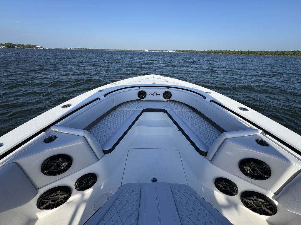 Performance, quality, and world class fishing features come together like never before in the amazing new Fountain 34 Tournament Edition. An engineering marvel, the 34TE offers 360-degree movement while fighting fish, thick coaming panels, and easy access to 52-rod holders. Even if you max out, the day's catch easily stows in five insulated in-floor lockers and a huge 380 quart coffin box cooler. Fountain's innovative tackle center rates best-in-class. At speed, Fountain's twin step Positive Lift bottom design is unmatched when it comes to low speed stability, fuel efficiency and big water ride control.