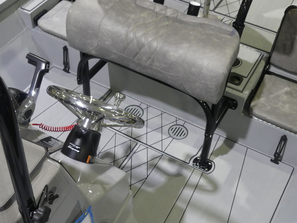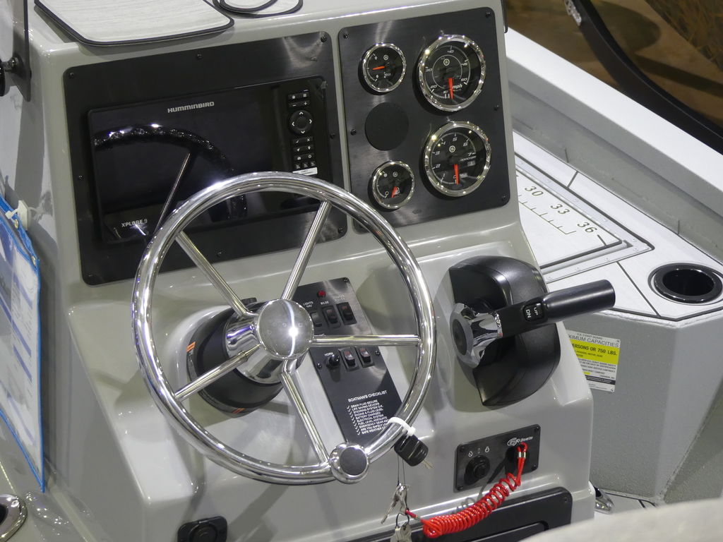 - Stainless steel steering wheel, Yamaha gauges, place for electronics, console door and upright rod holders.