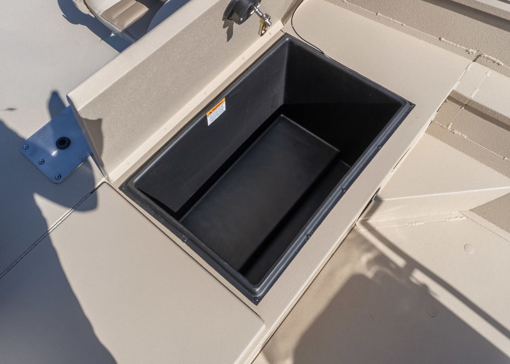 Upright rod storage for 6 rods. Extra seat for a passenger and a 14-gallon livewell under the seat lid.
