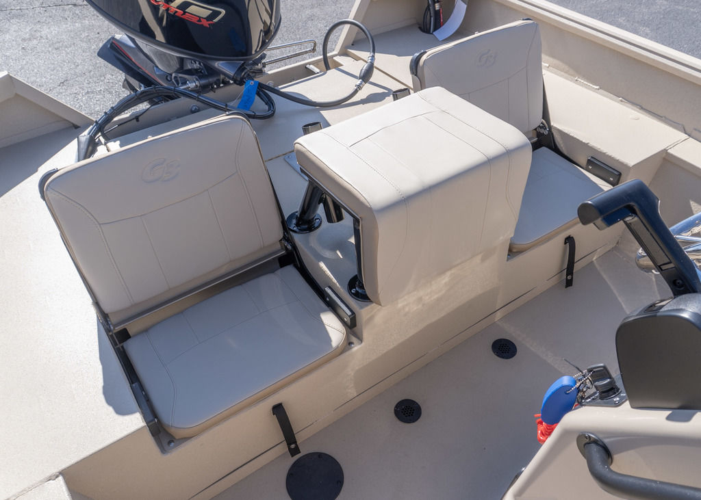 Upright rod storage for 6 rods. Extra seat for a passenger and a 14-gallon livewell under the seat lid.