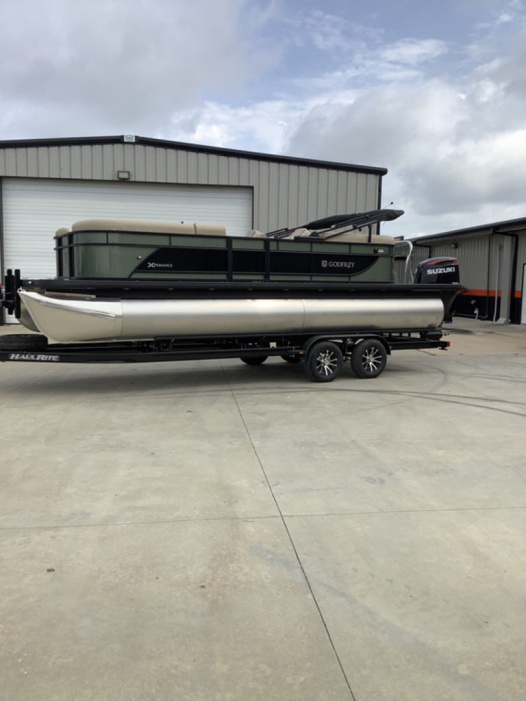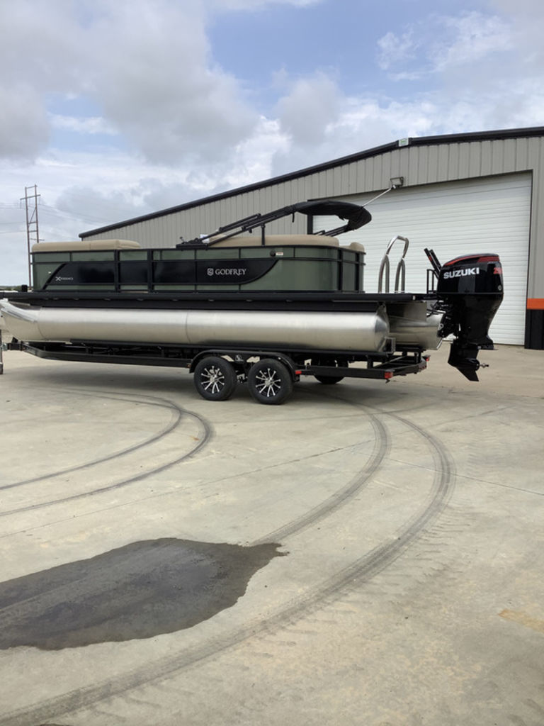 The Godfrey Xperience 2286 SBX is a versatile pontoon boat designed for a variety of on-water activities, including day-cruising, freshwater fishing, and watersports, with features like comfortable lounge seating, a redesigned helm, ample storage, and an integrated stereo system. It typically offers seating for a large group and features the "Sport Tube 27 in." package, which enhances performance. Key specifications include an overall length of approximately 23' 10", a width of 8' 6", and a maximum engine power of 150 HP, although configurations can vary.