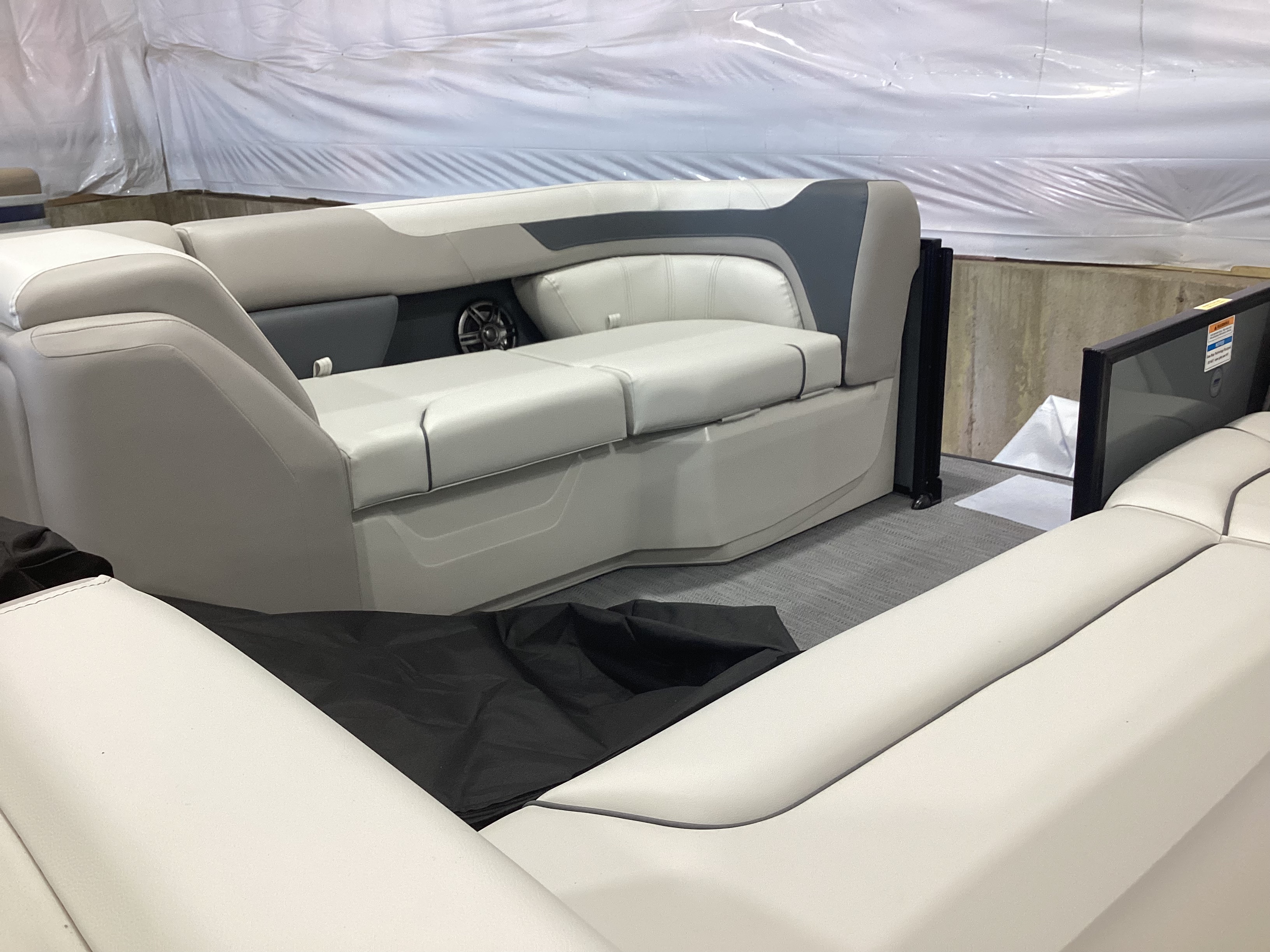 Conversation friendly L-shaped stern seating with bow loungers