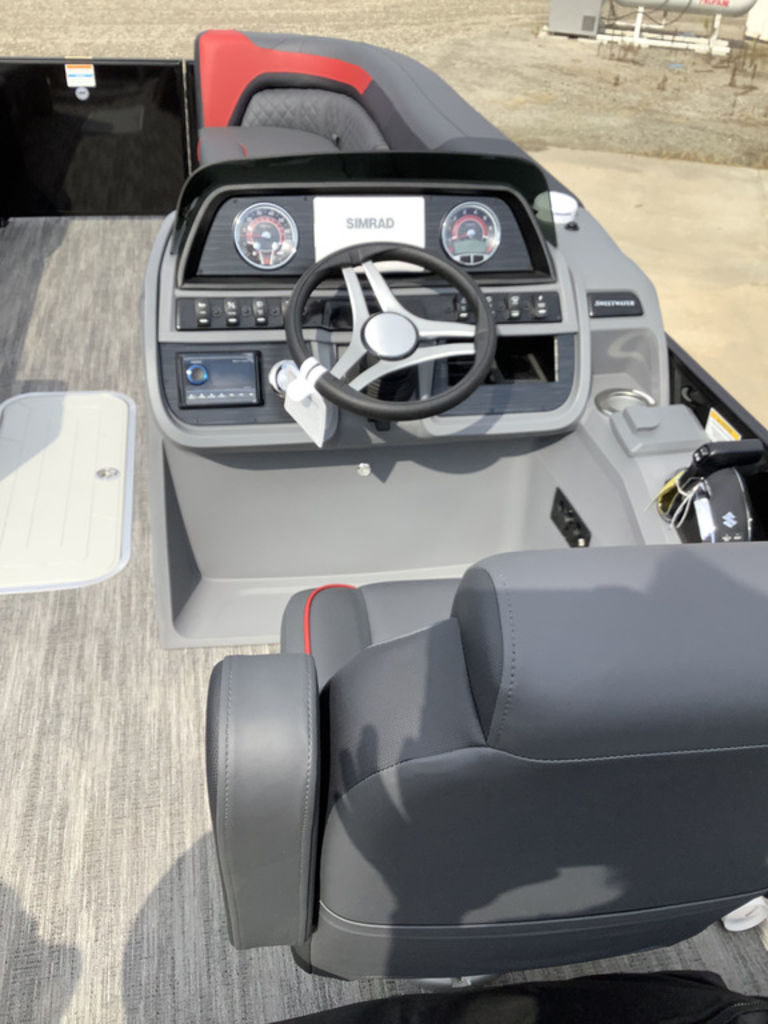 Helm station: The redesigned helm features clearly labeled rocker switches, easy-to-read gauges, and modern controls, including Fusion audio and a Simrad display.