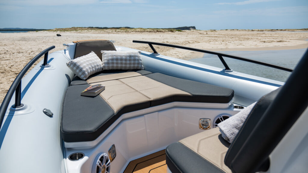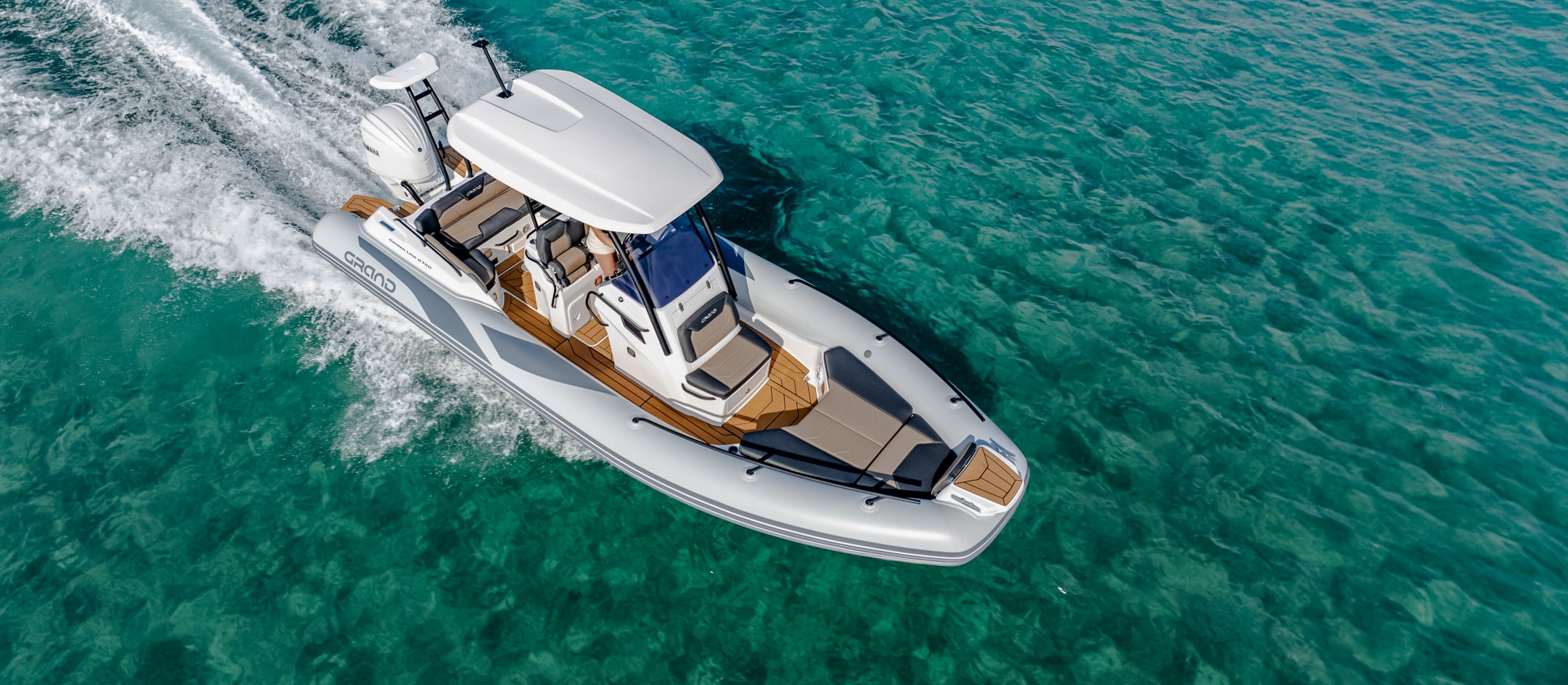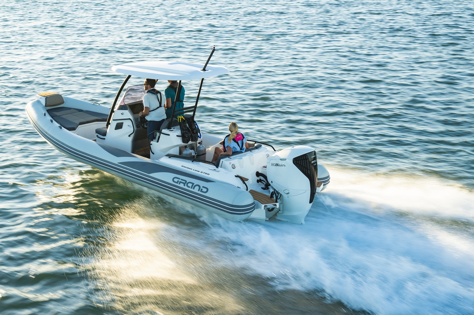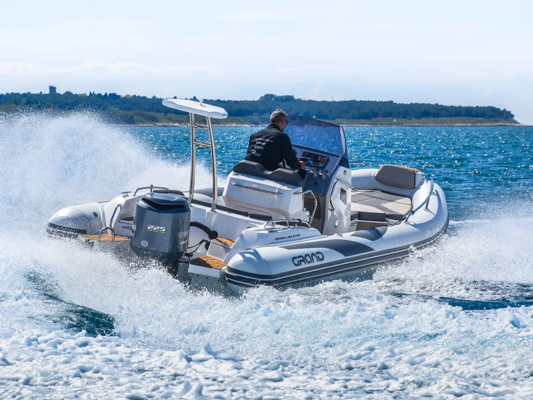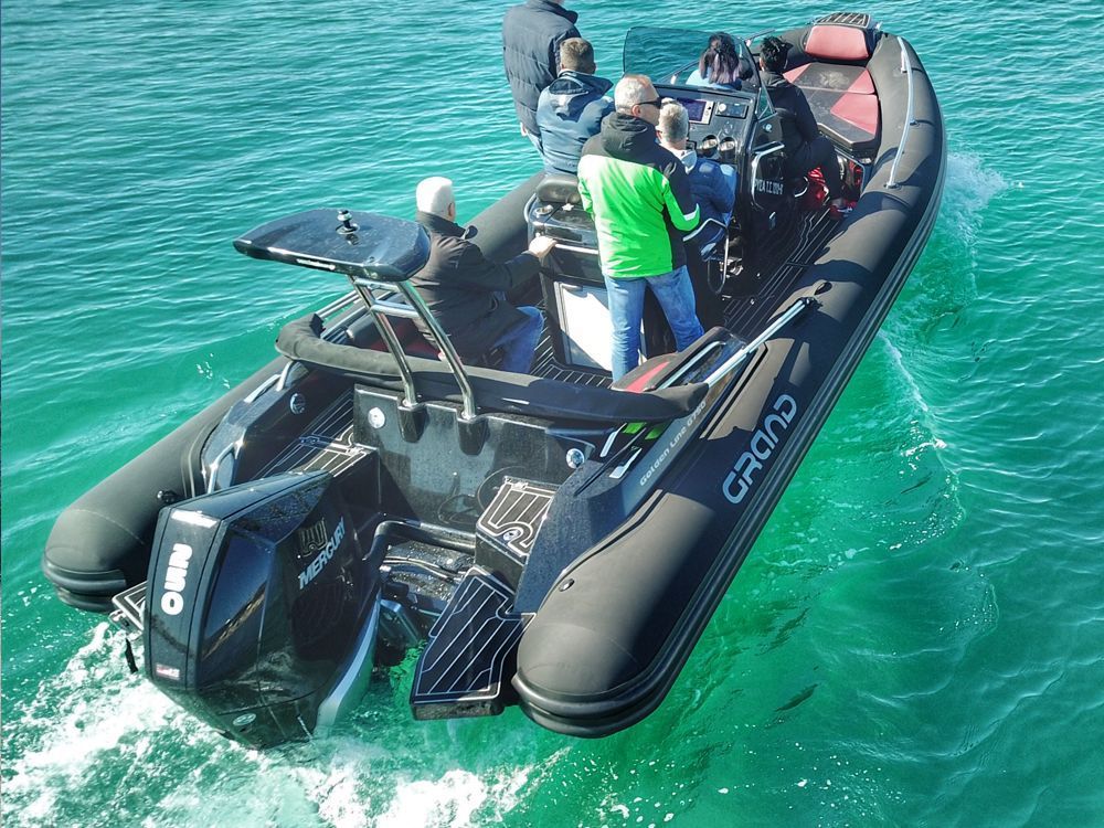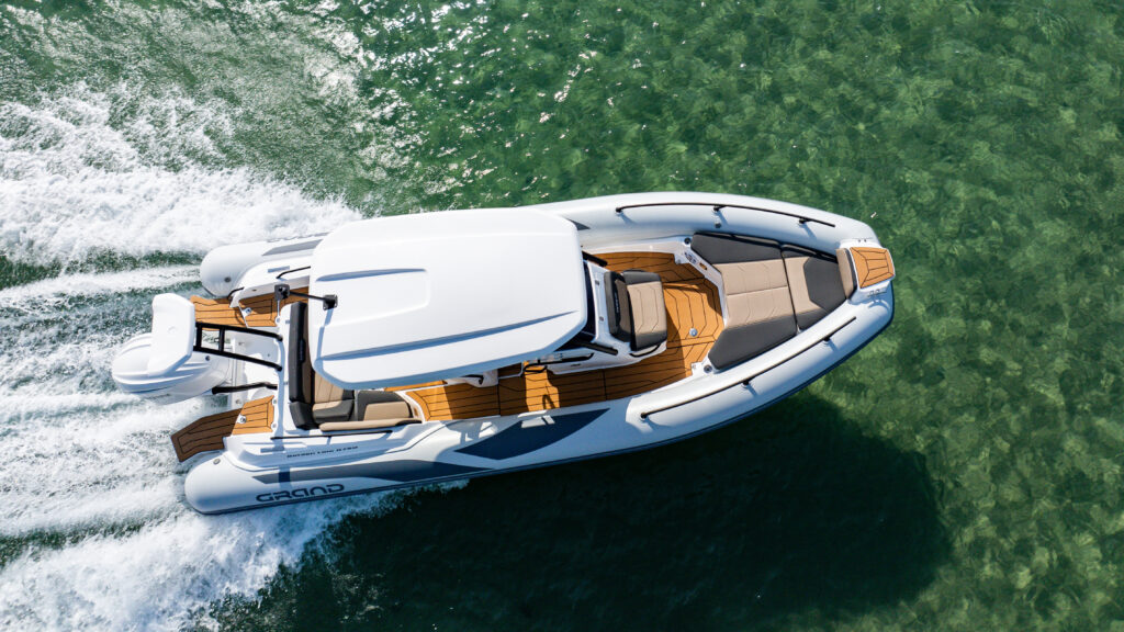 The extensive specification and options list includes features customers expect from their GRAND RIBS including a U-form rear sofa-style seat that now includes a boarding passageway, stainless steel bow rails, a newly designed centrally-positioned steering console with internal space for a marine WC, a new 260 liter built in fuel tank, a spacious and expandable bow sundeck, GRAND’s stylish waterski towing arch, accommodation for up to 10 passengers and much more!