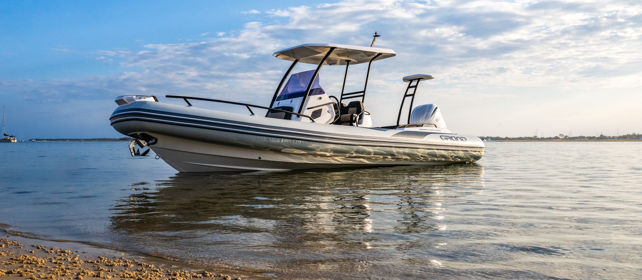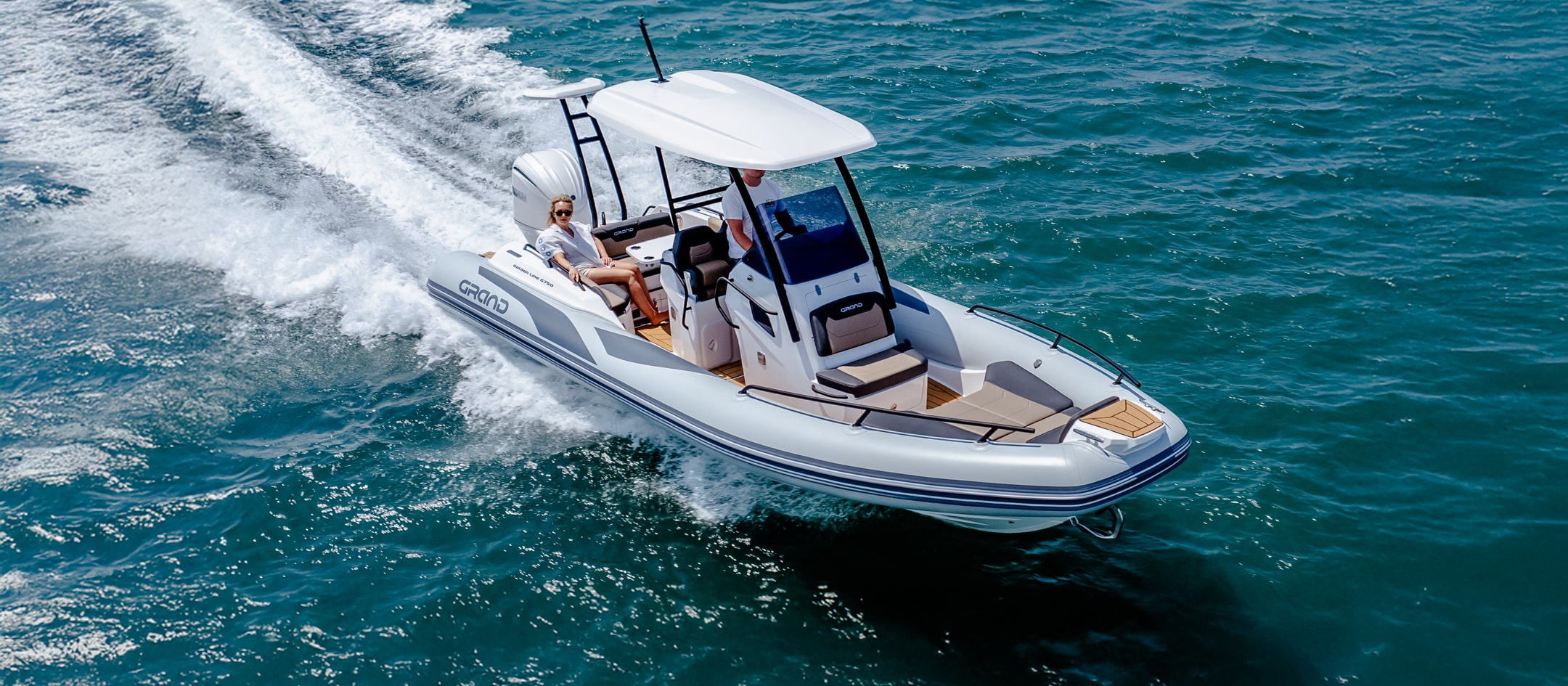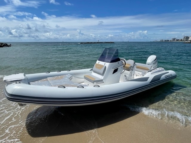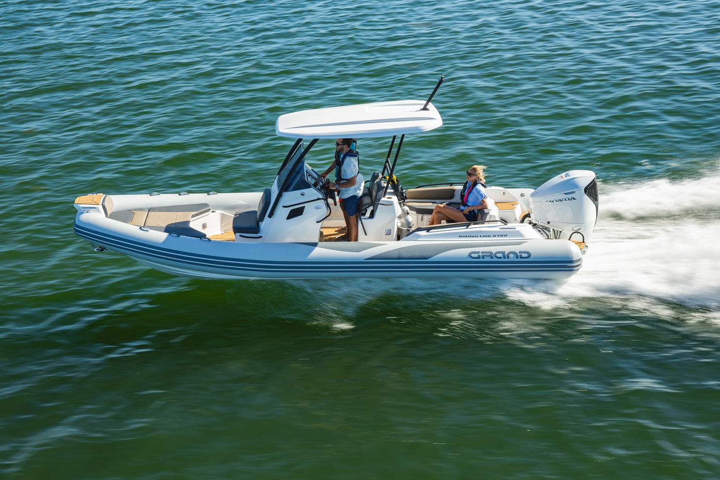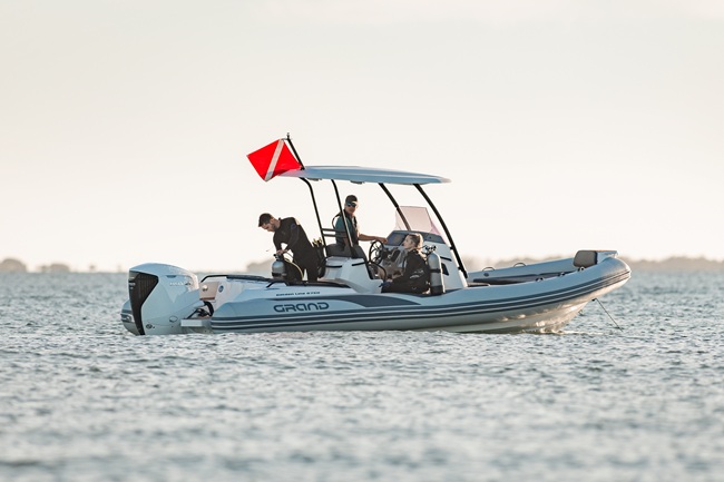 The extensive specification and options list includes features customers expect from their GRAND RIBS including a U-form rear sofa-style seat that now includes a boarding passageway, stainless steel bow rails, a newly designed centrally-positioned steering console with internal space for a marine head system, a new 260 liter built in fuel tank, a spacious and expandable bow sundeck, GRAND’s stylish waterski towing arch, accommodation for up to 10 passengers and much more!