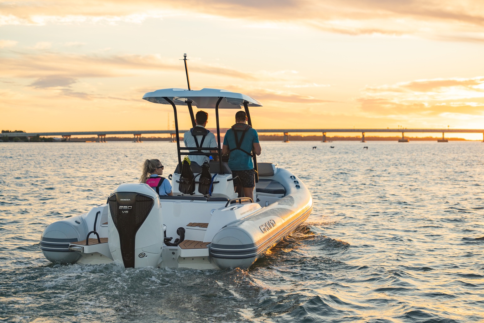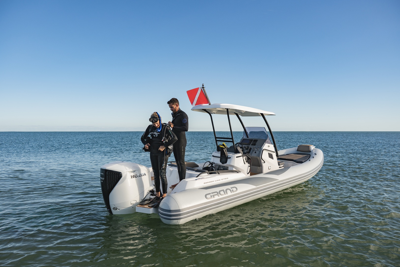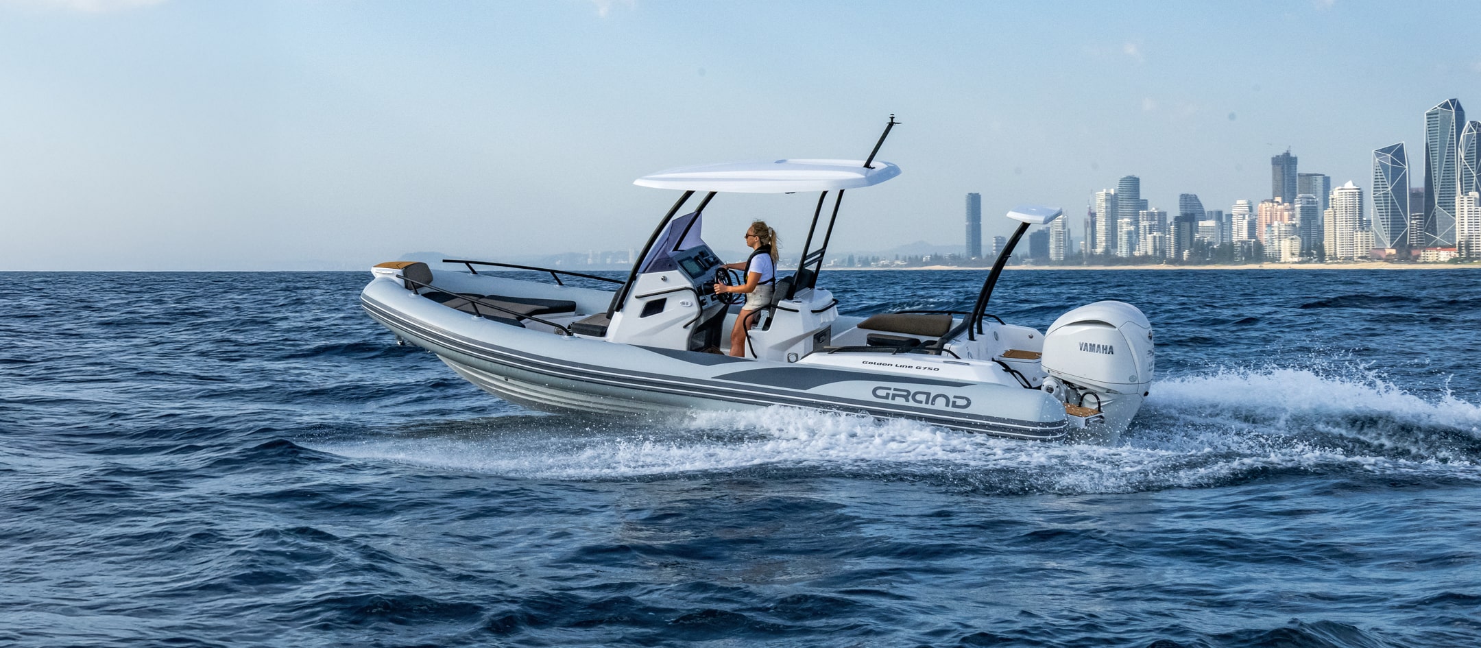 The extensive specification and options list includes features customers expect from their GRAND RIBS including a U-form rear sofa-style seat that now includes a boarding passageway, stainless steel bow rails, a newly designed centrally-positioned steering console with internal space for a marine head system, a new 260 liter built in fuel tank, a spacious and expandable bow sundeck, GRAND’s stylish waterski towing arch, accommodation for up to 10 passengers and much more!