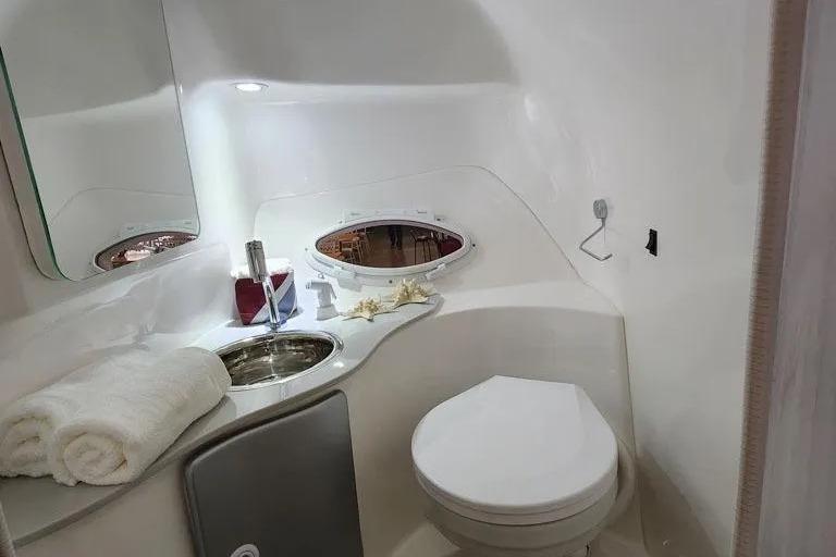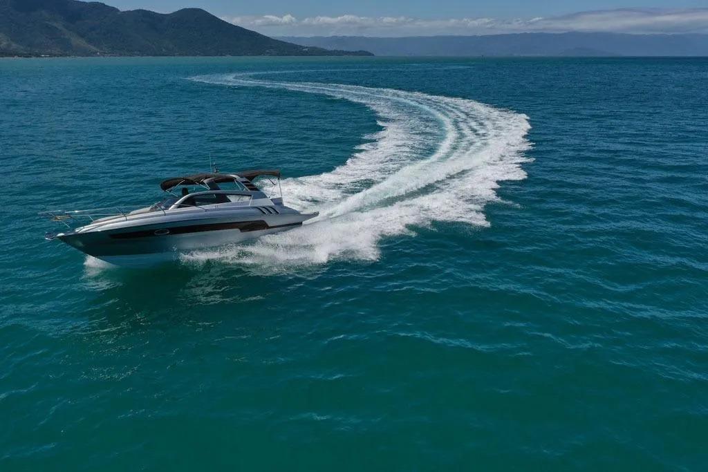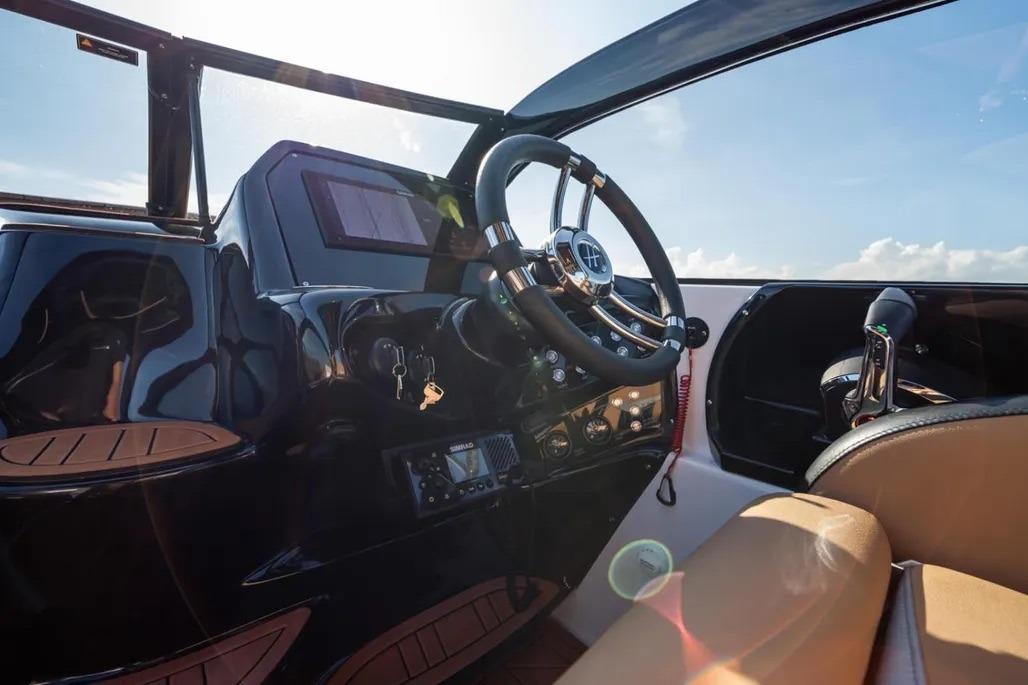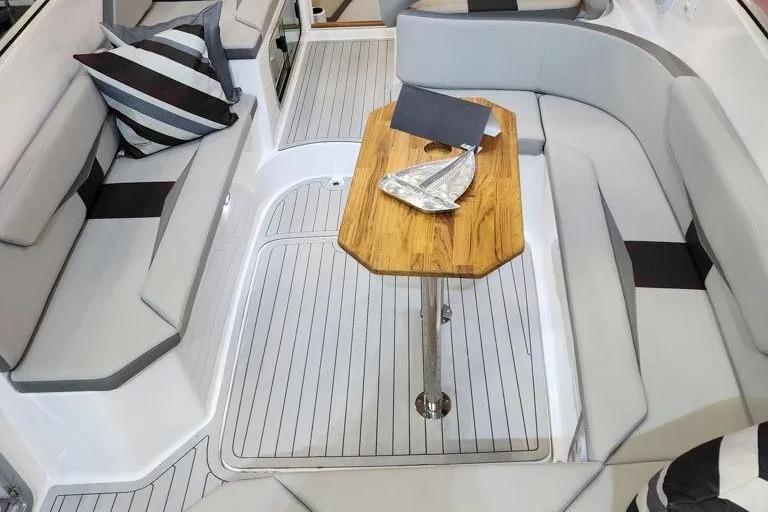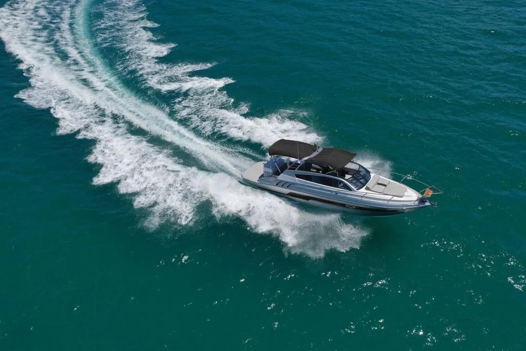 Example spec (configurable): 6″ stainless cleats • Bow anchor support & SS protection plate • Teak-seat stainless rail • Acrylic hatches & panoramic windows • Hydraulic swim platform w/ telescopic ladder • U-shaped cockpit seating & bow solarium • Synthetic teak/EVA flooring option • Stainless-steel grab rails & cup holders • Corvim upholstery • Enclosed tender garage under aft sunpad w/ electric winch • Cockpit storage compartments • Teak table • Enclosed cabin w/ U-shaped sofa, double berth, microwave space & storage • Electric head w/ 80 L holding & macerator • 27 gal fresh-water tank & booster pump • Dual bilge pumps • Fire extinguisher & engine-room smoke sensor • 316 L fuel tank • Non-slip gelcoat decks • Indirect LED cabin lighting • Stainless charcoal grill
