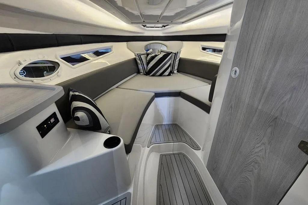 Secure your build slot for the 2026 Hanover 305 Inboard and tailor the spec to your program. Choose the MerCruiser 300 for efficient cruising or step up to 350 hp for added punch. Wide walk-around decks lead from the bow solarium to an aft lounge over a concealed tender garage, while a hydraulic swim platform and electric winch make water access effortless.