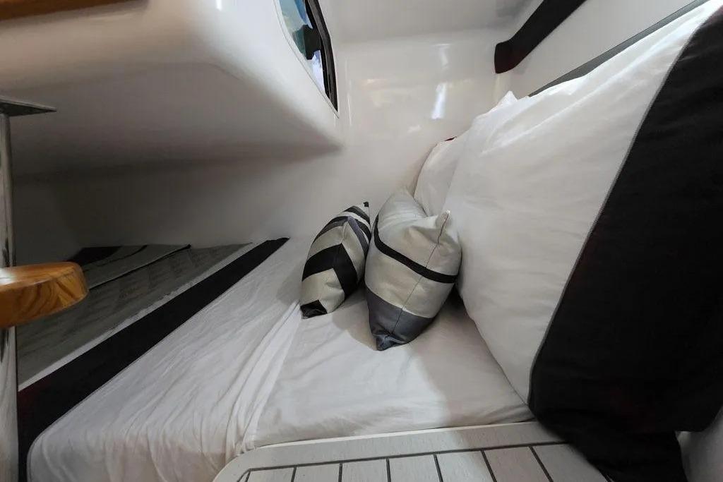 Inside, panoramic windows brighten a cabin that converts from lounge to double berth in seconds. Configure finishes, flooring, and electronics to taste, then add comfort systems like shore-power A/C with inverter/charger, hot water, and an electric head with macerator to support overnight plans.