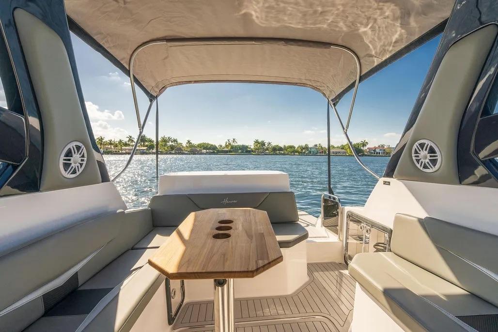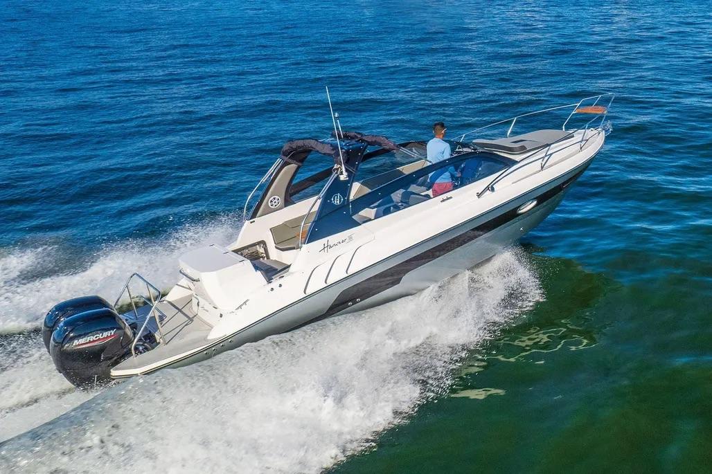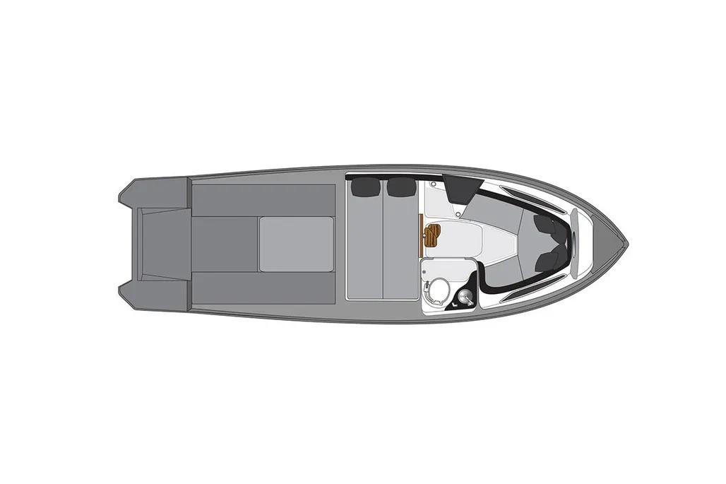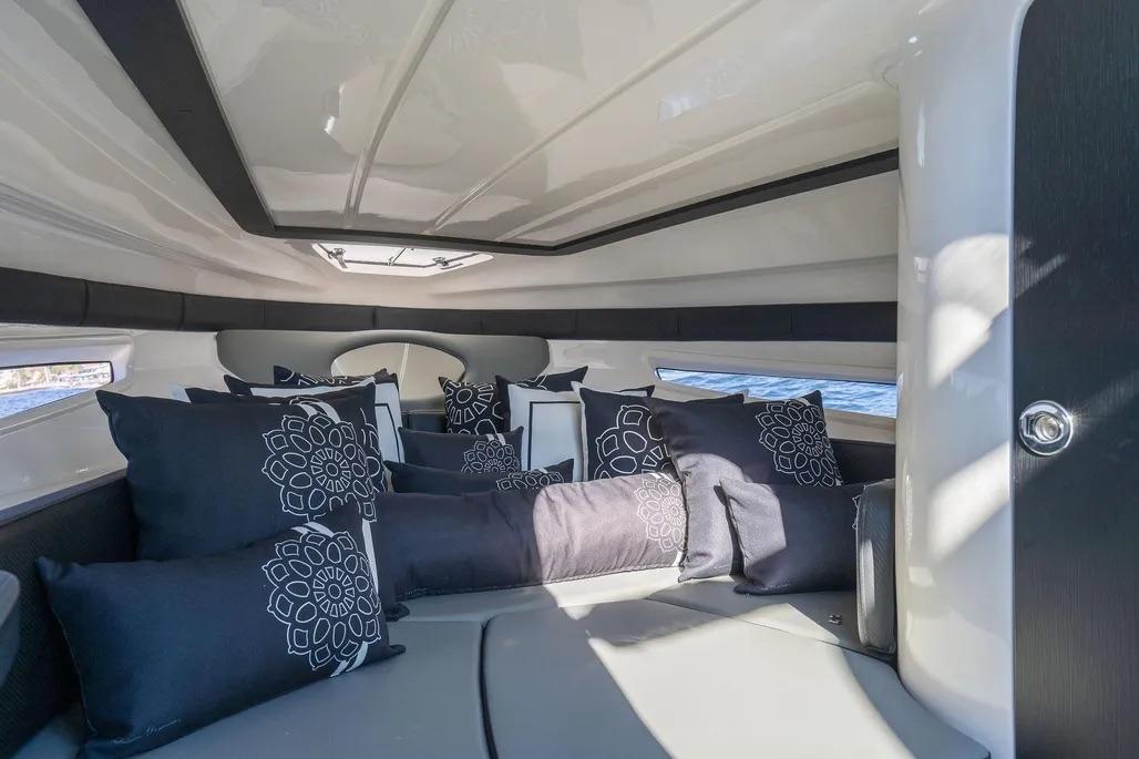 Example spec (configurable): 6″ stainless cleats • Bow anchor support & SS protection plate • Teak-seat stainless rail • Acrylic hatches & panoramic windows • Hydraulic swim platform w/ telescopic ladder • U-shaped cockpit seating & bow solarium • Synthetic teak/EVA flooring option • Stainless-steel grab rails & cup holders • Corvim upholstery • Enclosed tender garage under aft sunpad w/ electric winch • Cockpit storage compartments • Teak table • Enclosed cabin w/ U-shaped sofa, double berth, microwave space & storage • Electric head w/ 80 L holding & macerator • 27 gal fresh-water tank & booster pump • Dual bilge pumps • Fire extinguisher & engine-room smoke sensor • 316 L fuel tank • Non-slip gelcoat decks • Indirect LED cabin lighting • Stainless charcoal grill