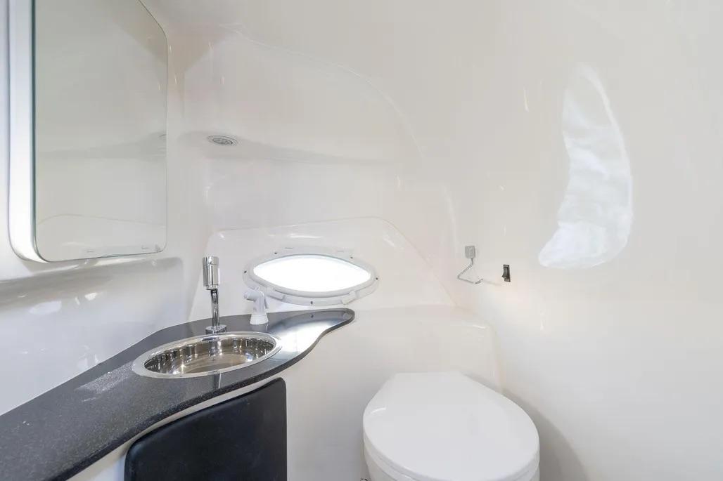 Below, panoramic glazing brightens a cabin that converts from lounge to double berth in seconds. Choose finishes, flooring and electronics to taste, then add comfort systems, shore-power A/C with inverter/charger, hot water, and an electric head, to support relaxed overnighters.
