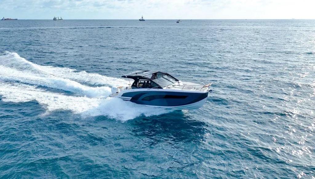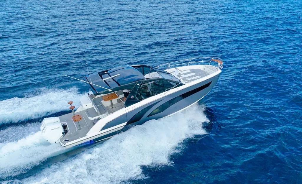Reserve your 387 Outboard build and tailor the spec to your program. Twin Verado V8s with joystick piloting make close-quarters work intuitive, while Zipwake tabs refine attitude underway. The lateral “Beach Club” deck creates a waterside terrace at anchor, the hydraulic swim platform streamlines water access, and an electric sunroof opens the cockpit to the breeze.