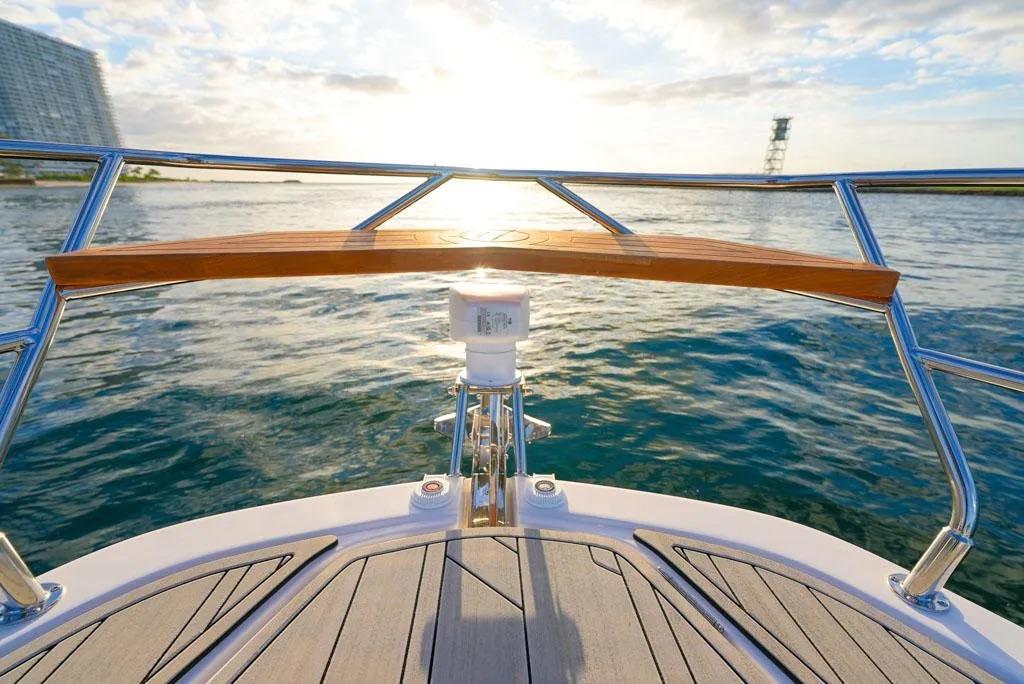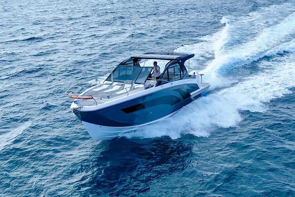 Example spec (configurable): EVA cockpit flooring · Electric opening lateral “Beach Club” deck · Zipwake automatic trim tabs · Electric sunroof · Electric anchor windlass · Shore power & 100 A battery charger · Galvanic isolator · Windshield wipers · Heavy-duty folding cockpit table · Italian steering wheel · USCG essential safety kit · Choice of three main-deck layouts · Sleeps 5 with 6′2″ walk-in shower · Bow sunpads
