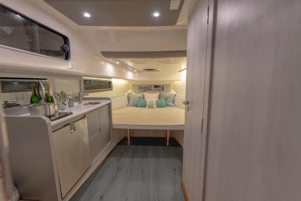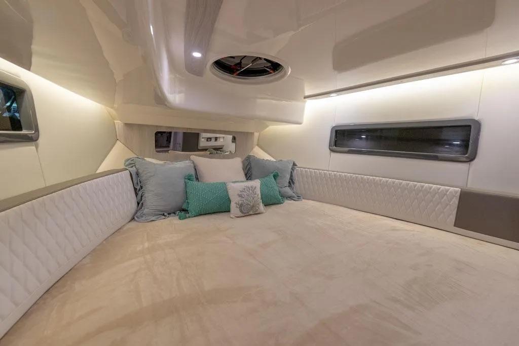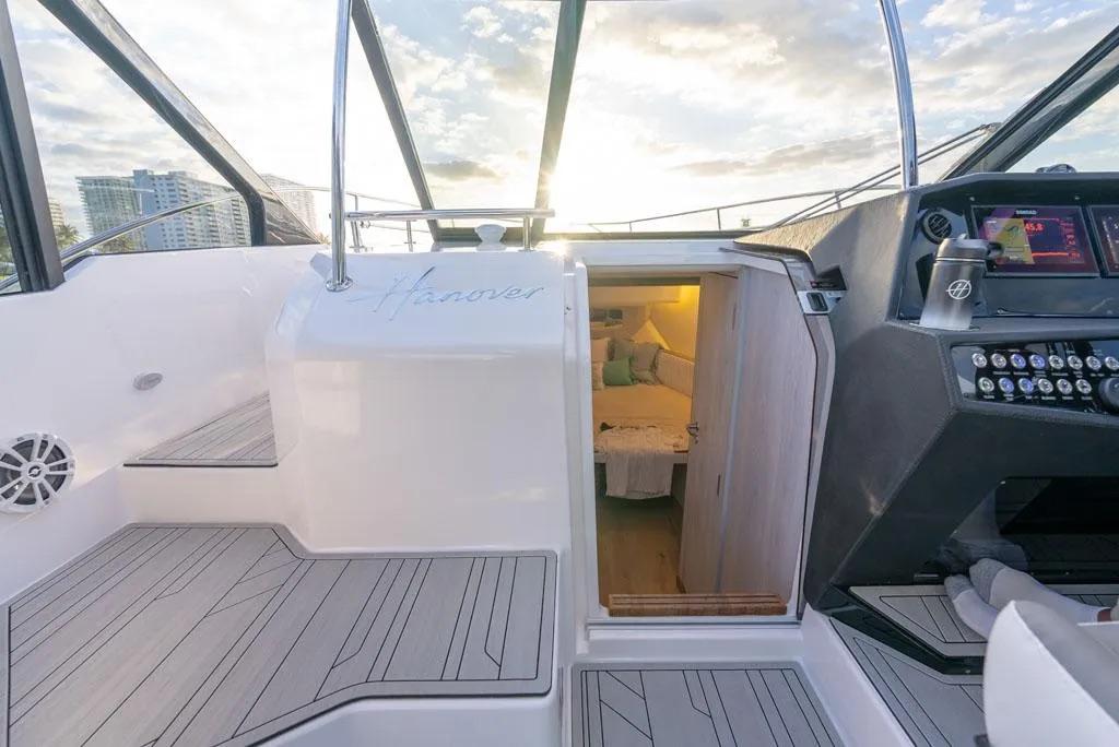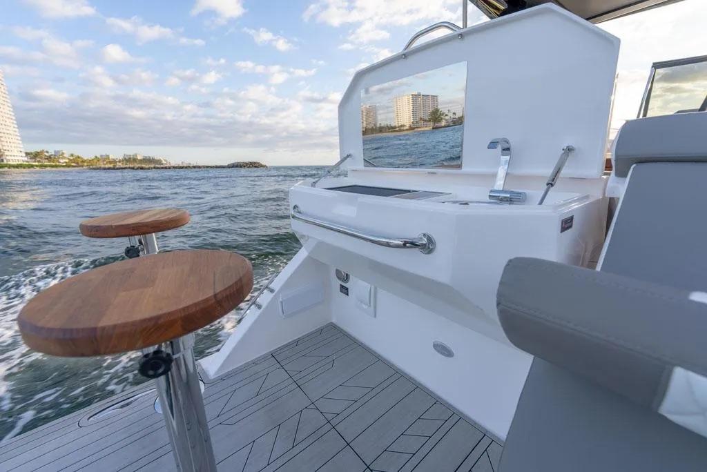 Below, select from three main-deck layouts to sleep up to five, anchored by a full-height 6′2″ walk-in shower. Add the Kohler generator and shore-power package for extended time aboard, and choose finishes, EVA flooring, audio, and upholstery to match your style.