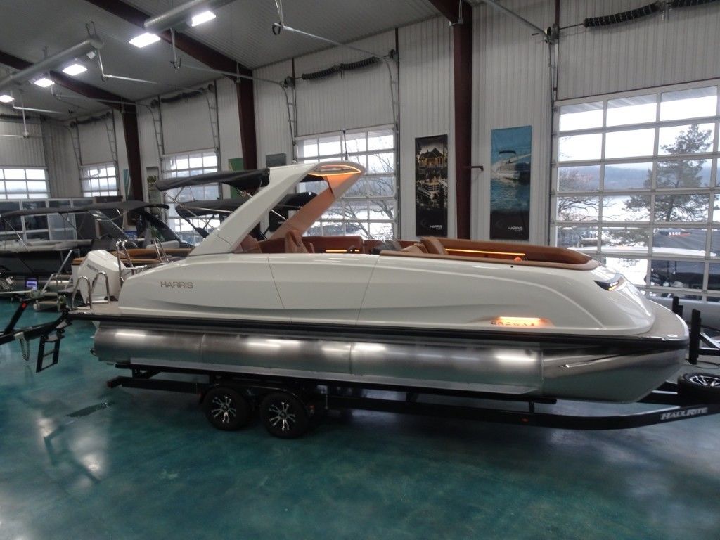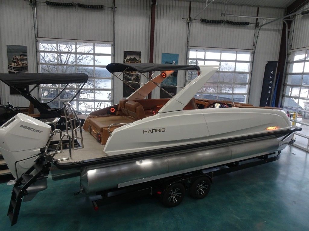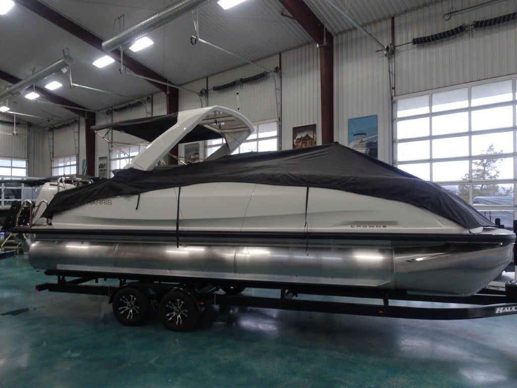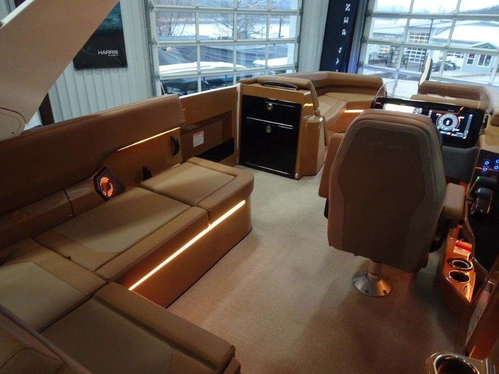 This is a new 2026 Harris Crowne 250SL Tri-toon in Ceramic White and Chestnut Brown Interior. It is powered by a Mercury 400hp Verado V-10 4-Stroke DTS/PAS and has the following options: