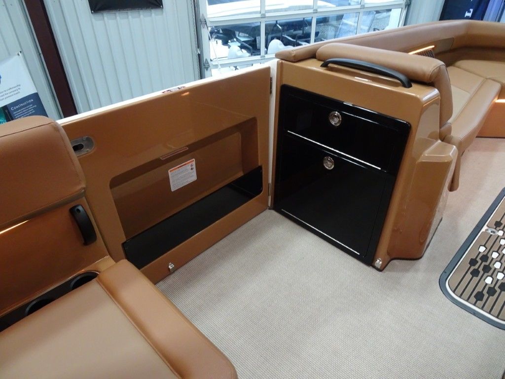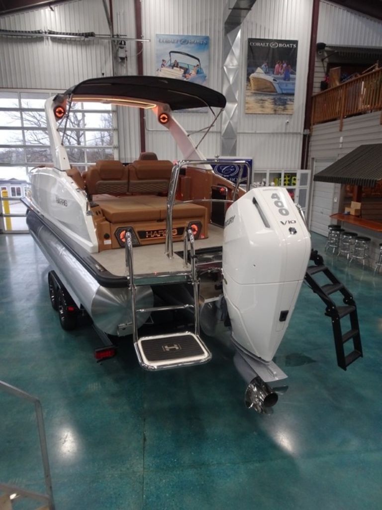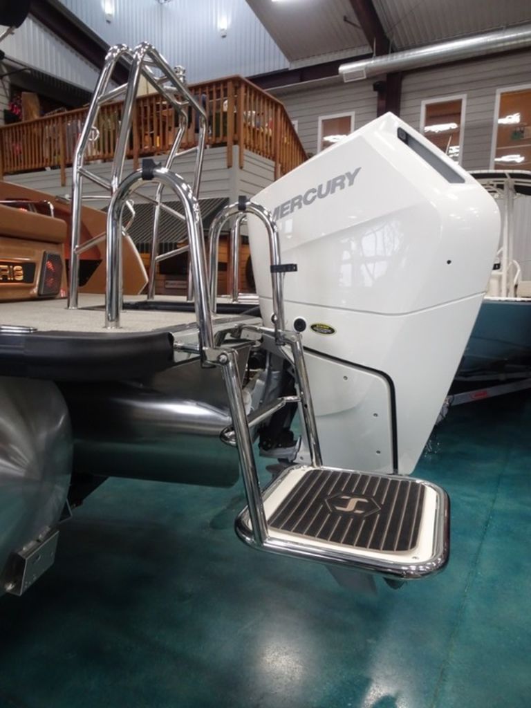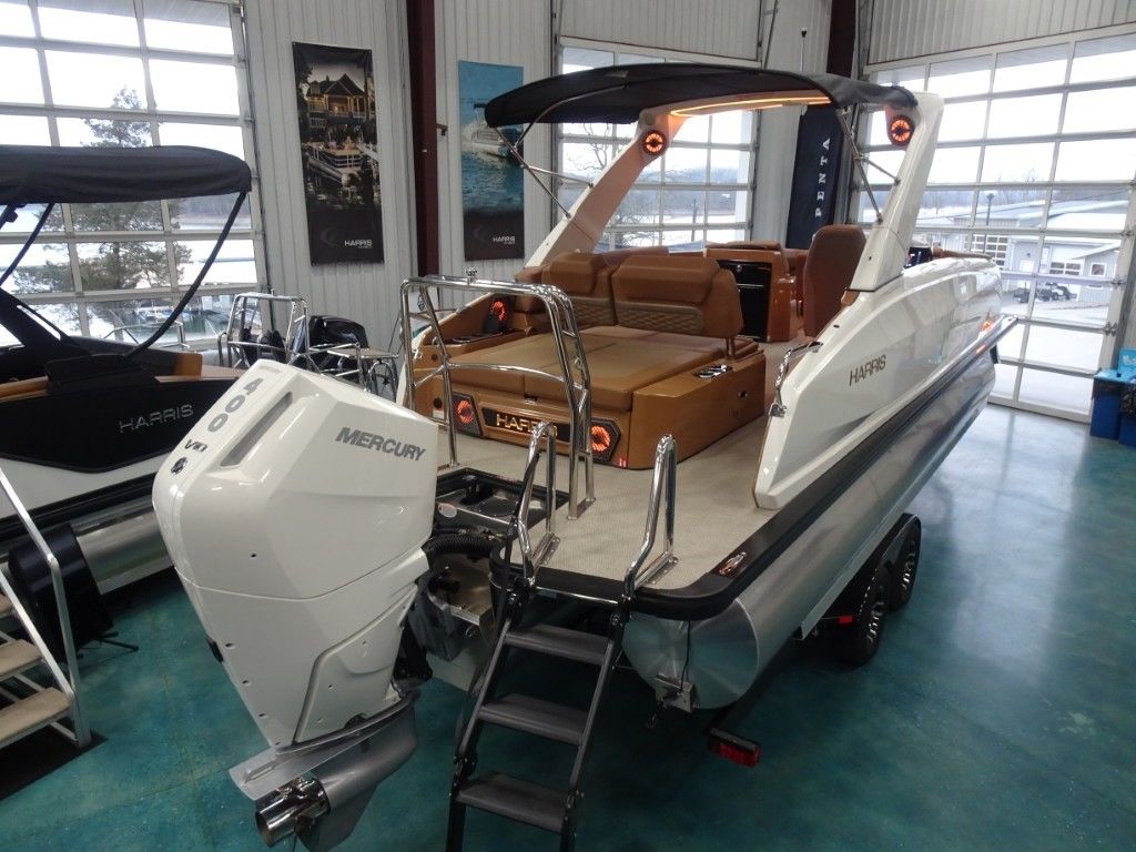 This is a new 2026 Harris Crowne 250SL Tri-toon in Ceramic White and Chestnut Brown Interior. It is powered by a Mercury 400hp Verado V-10 4-Stroke DTS/PAS and has the following options: