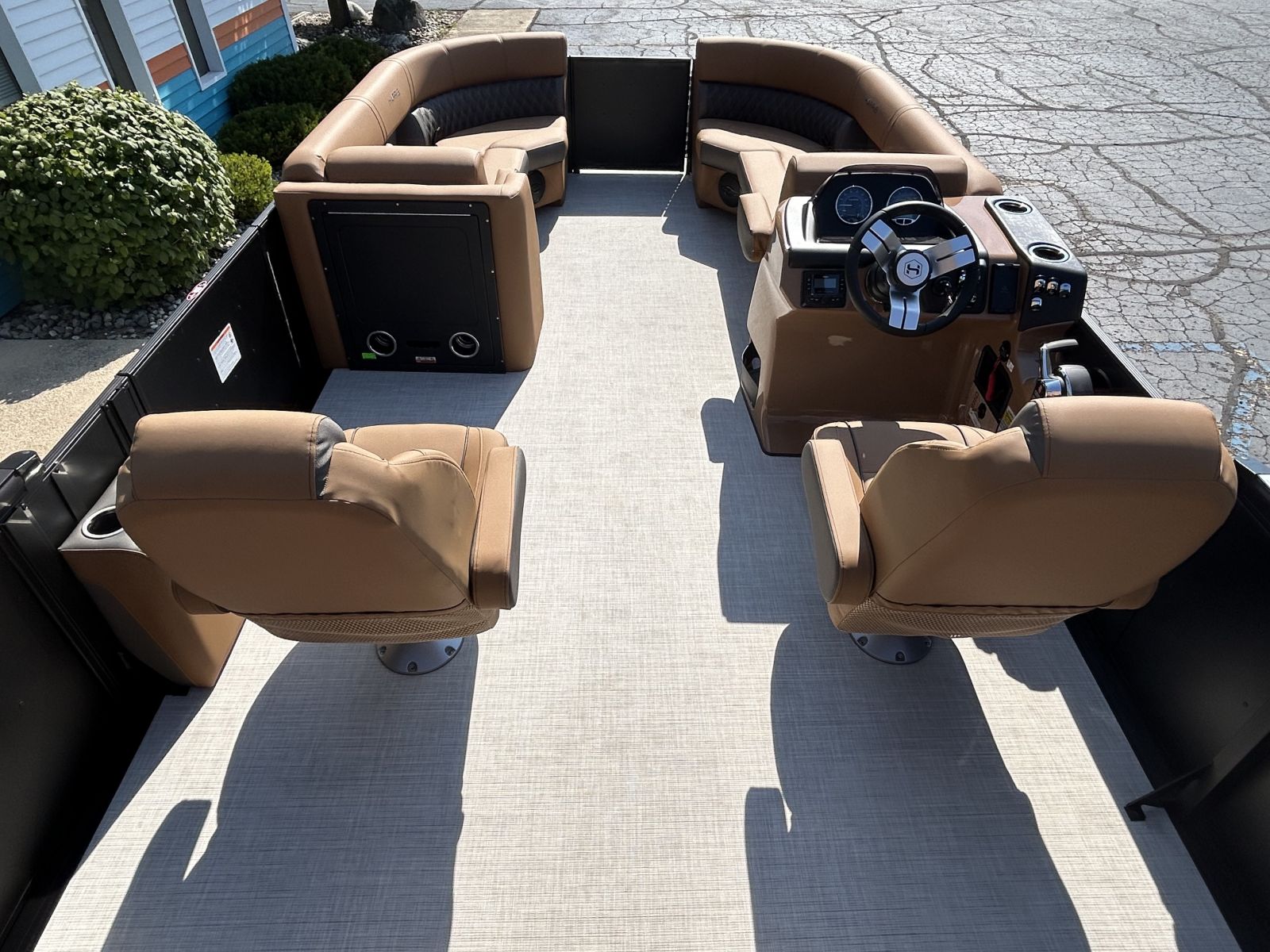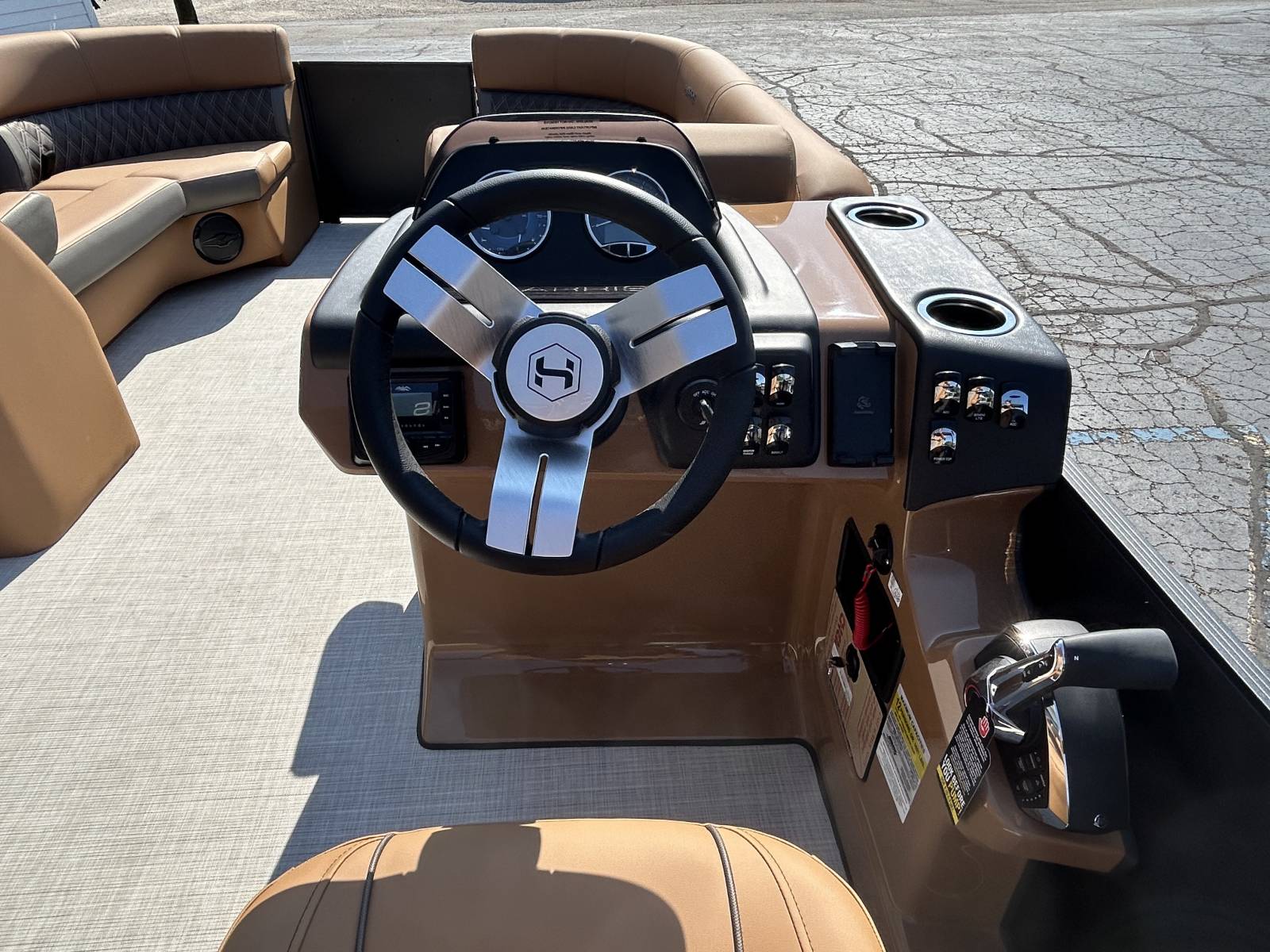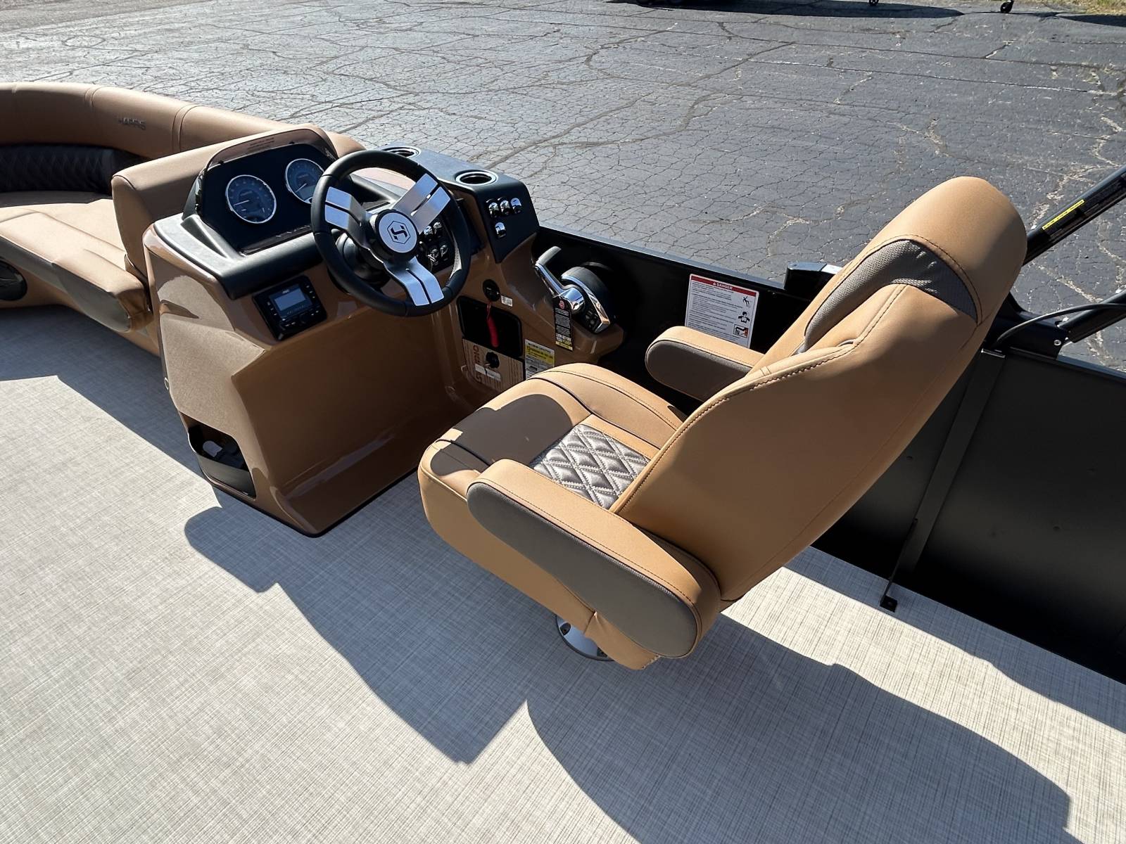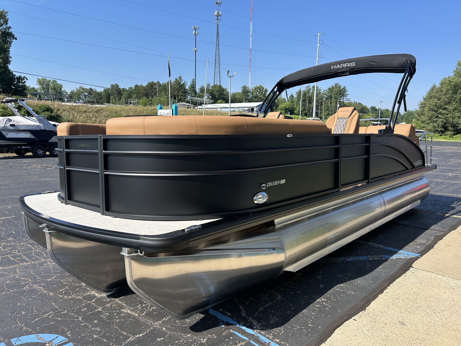 luxury tritoon that’s turn-key and water-ready. Notable Options Include:Mercury 200hp FourStroke EngineRPM Tritoon ChassisMatte Black ExteriorUpgraded Lux Chestnut InteriorPower Bimini TopWet Sounds Bluetooth Stereo SystemUpgraded Lillipad LadderSafety Railing PackageChaise-End Flip-Up Table34" Portside DoorBuilt-in CoolerRemovable Cockpit TableSki Tow BarEZ-Clip Mooring CoverAdditional Details: