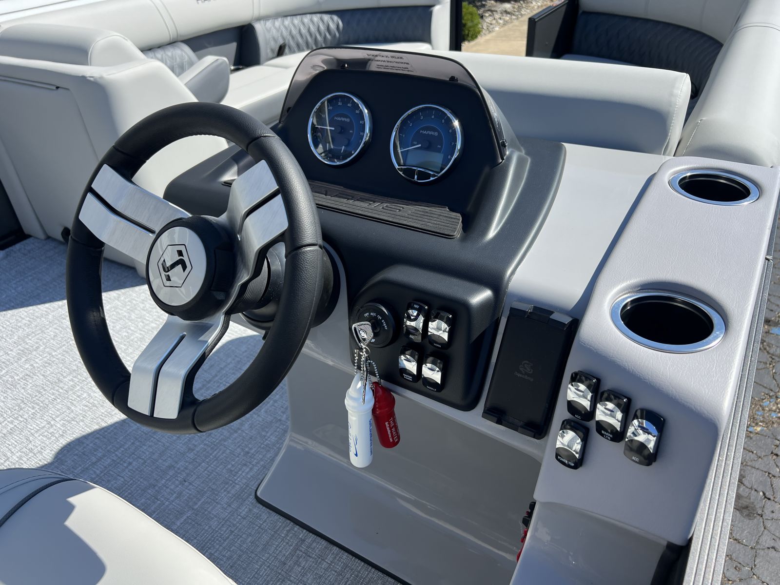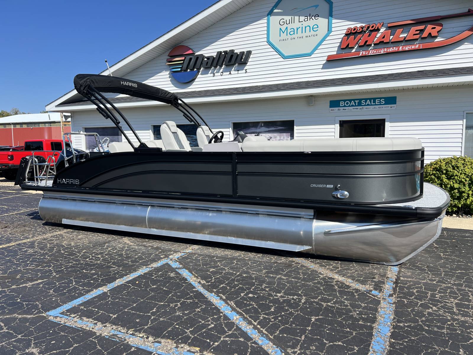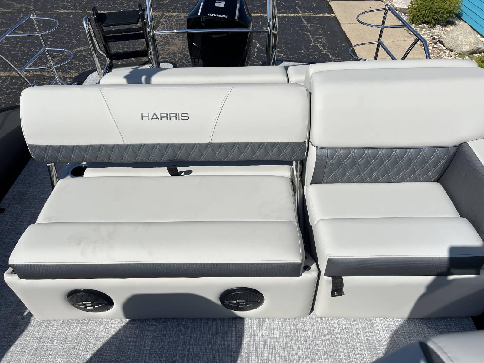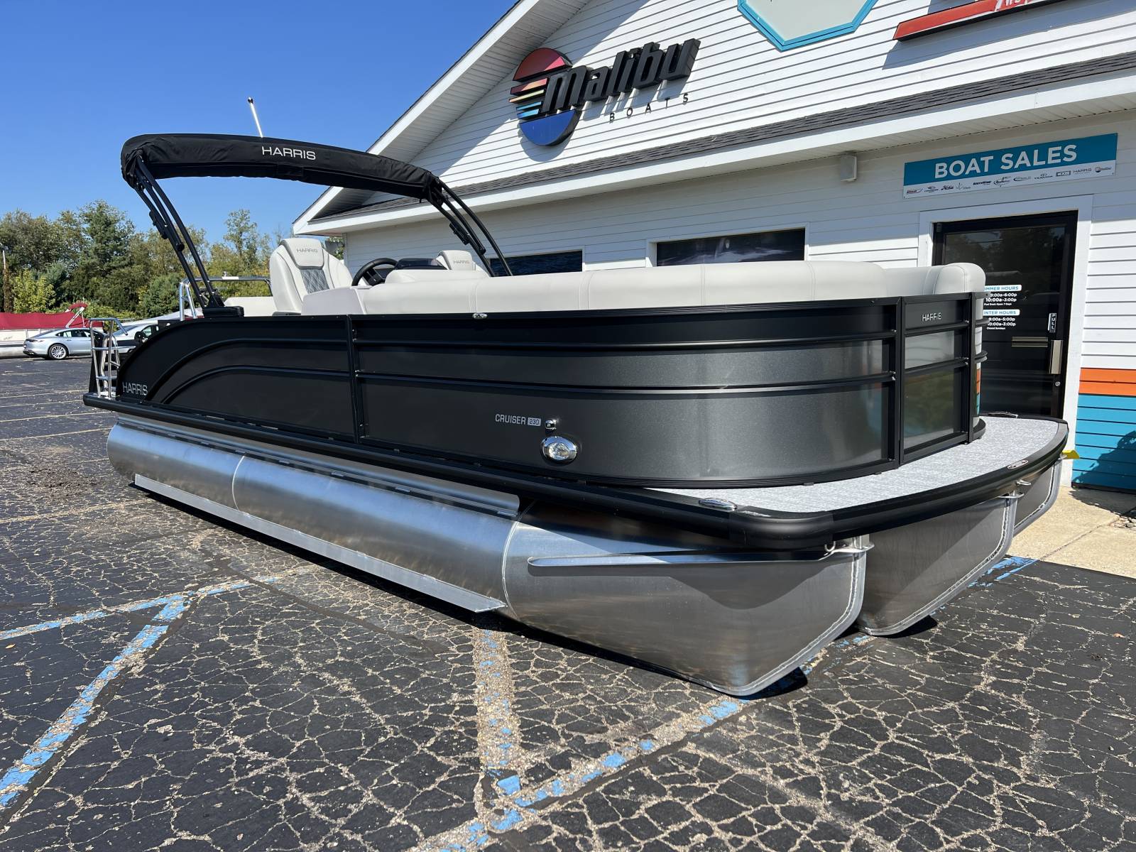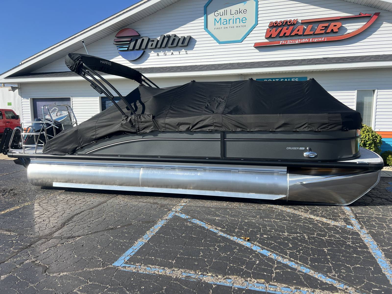 stability, strength, and a confident ride in all conditions.Notable Options Include:Mercury 200hp Engine Digital Throttle Power Assist SteeringRPM 325 Tritoon ChassisPower Bimini TopLillipad LadderSki Tow BarSeagrass FlooringWireless ChargingDepth GaugeWet Sounds Bluetooth AudioBattery Disconnect SwitchDocking LightsCourtesy LightingQuick-Release (QR) Fender SystemSafety RailingRemovable TableEZ-Clip Mooring CoverAdditional Details: The Harris Cruiser 230 SLDH is