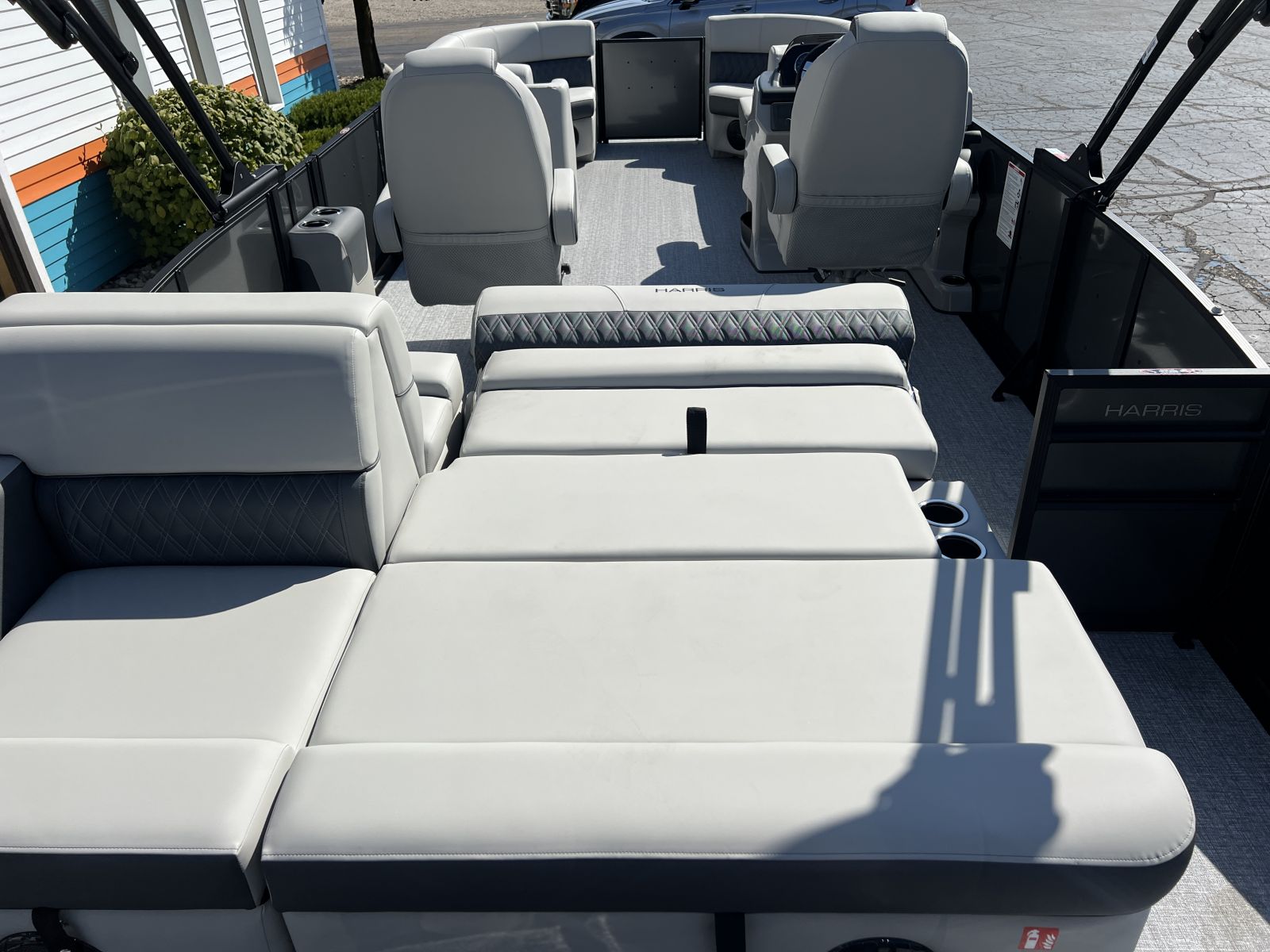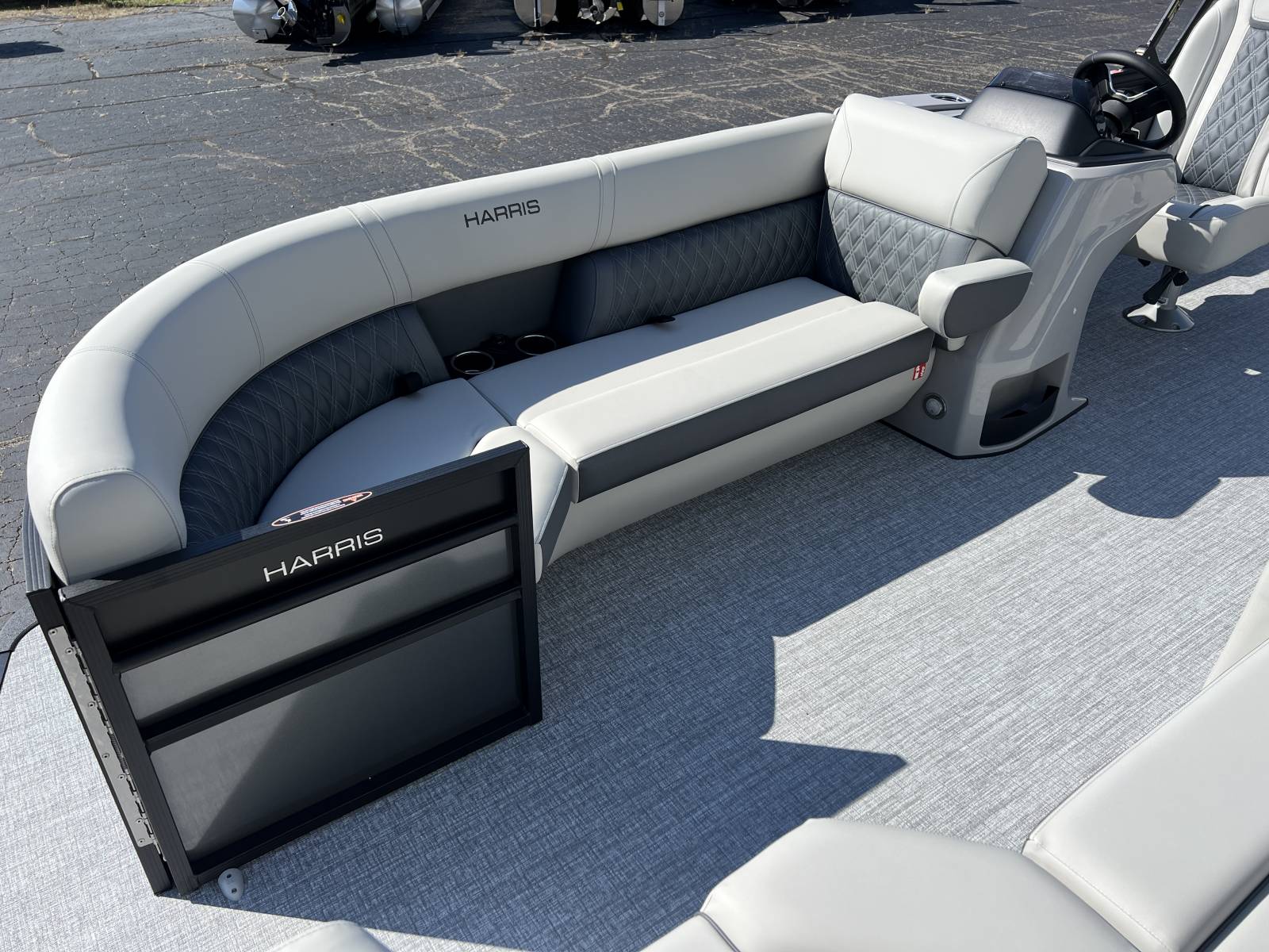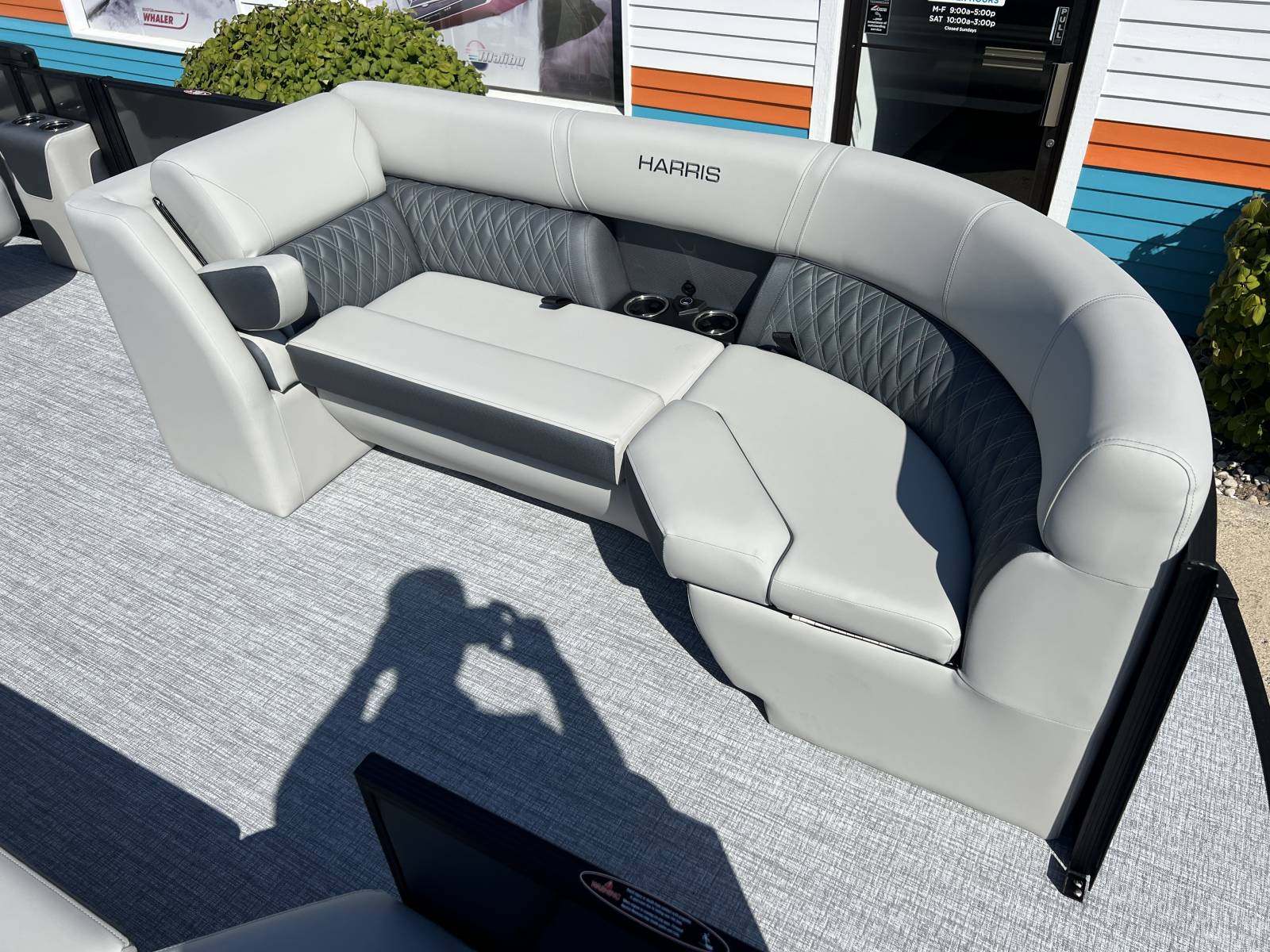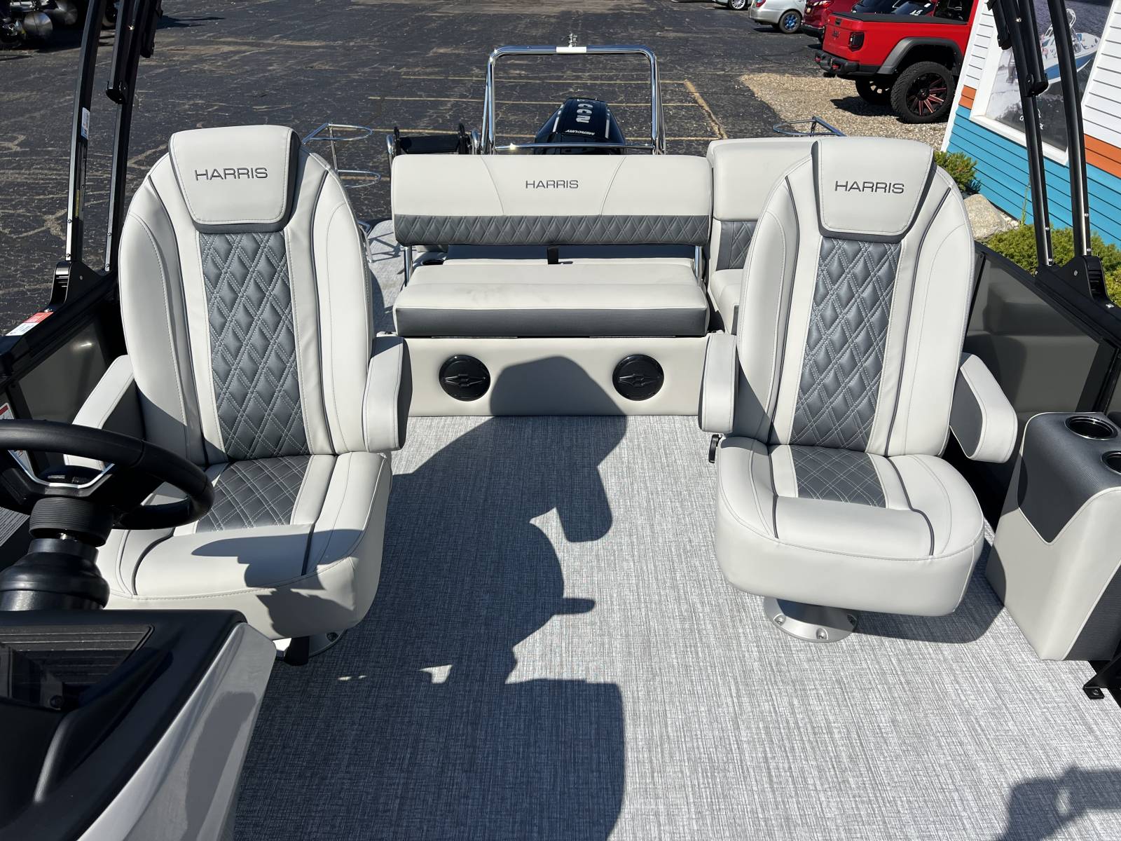 stability, strength, and a confident ride in all conditions.Notable Options Include:Mercury 200hp Engine Digital Throttle Power Assist SteeringRPM 325 Tritoon ChassisPower Bimini TopLillipad LadderSki Tow BarSeagrass FlooringWireless ChargingDepth GaugeWet Sounds Bluetooth AudioBattery Disconnect SwitchDocking LightsCourtesy LightingQuick-Release (QR) Fender SystemSafety RailingRemovable TableEZ-Clip Mooring CoverAdditional Details: The Harris Cruiser 230 SLDH is