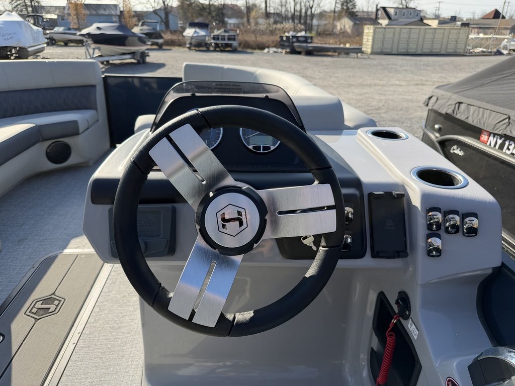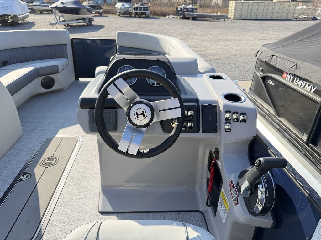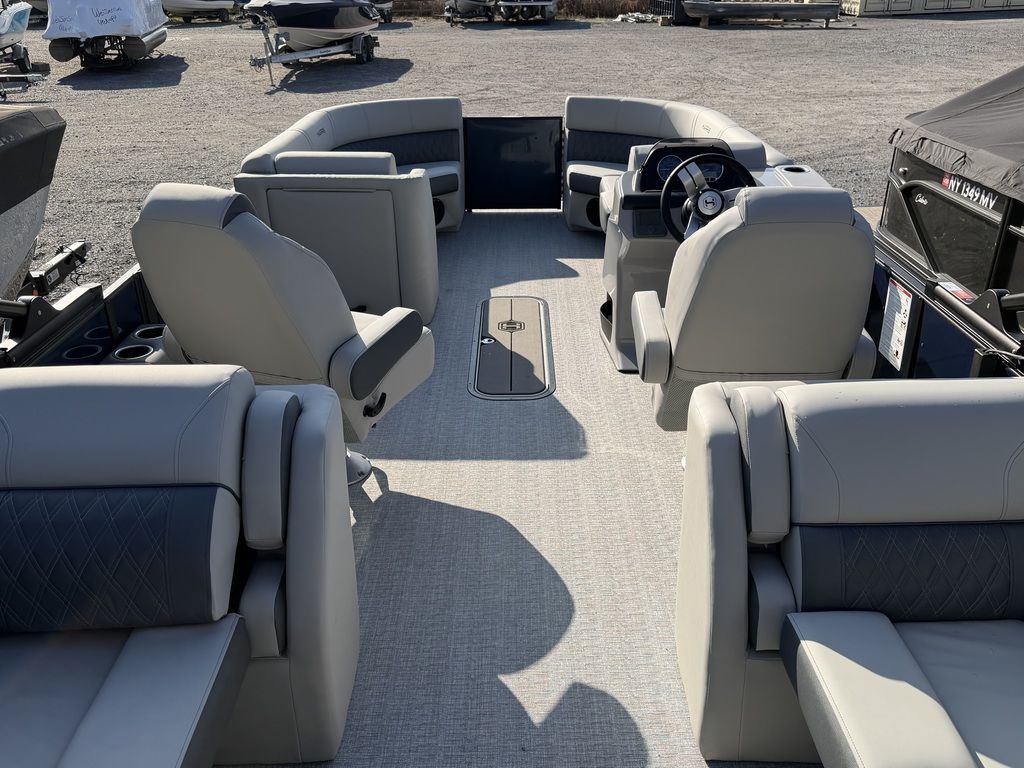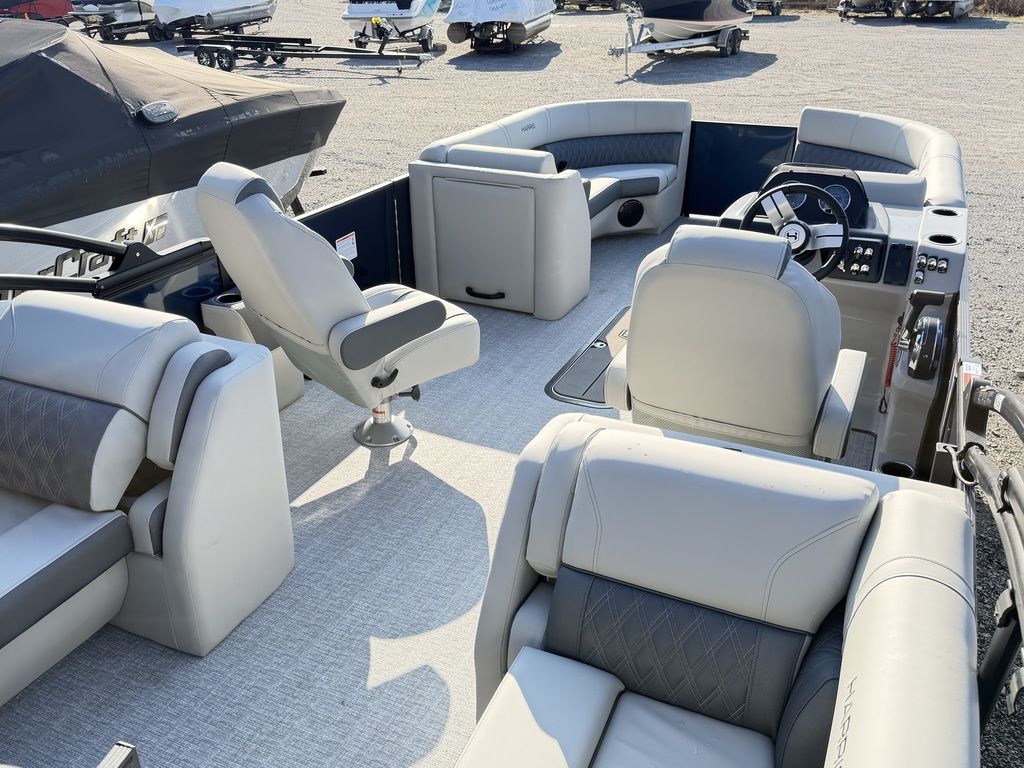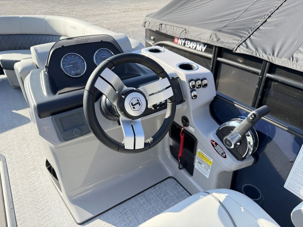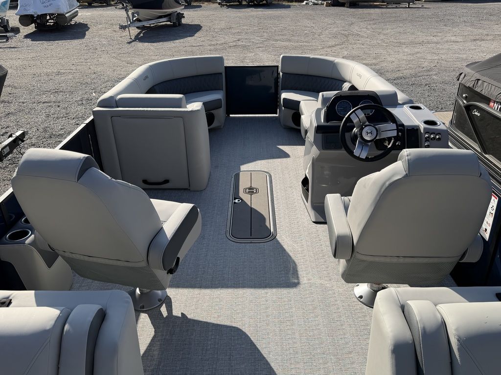 ENHANCEDTake to the water on a craft built with value in mind that also includes more than you might expect, including a new 190 (19-foot) length, ultra-soft yet extremely durably vinyl upholstery, a reclining helm chair, and standard charging station. Personalizing your pontoon for watersports or fishing is simple—and optional performance packages give you better control on rough water.