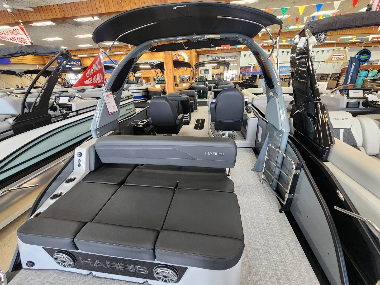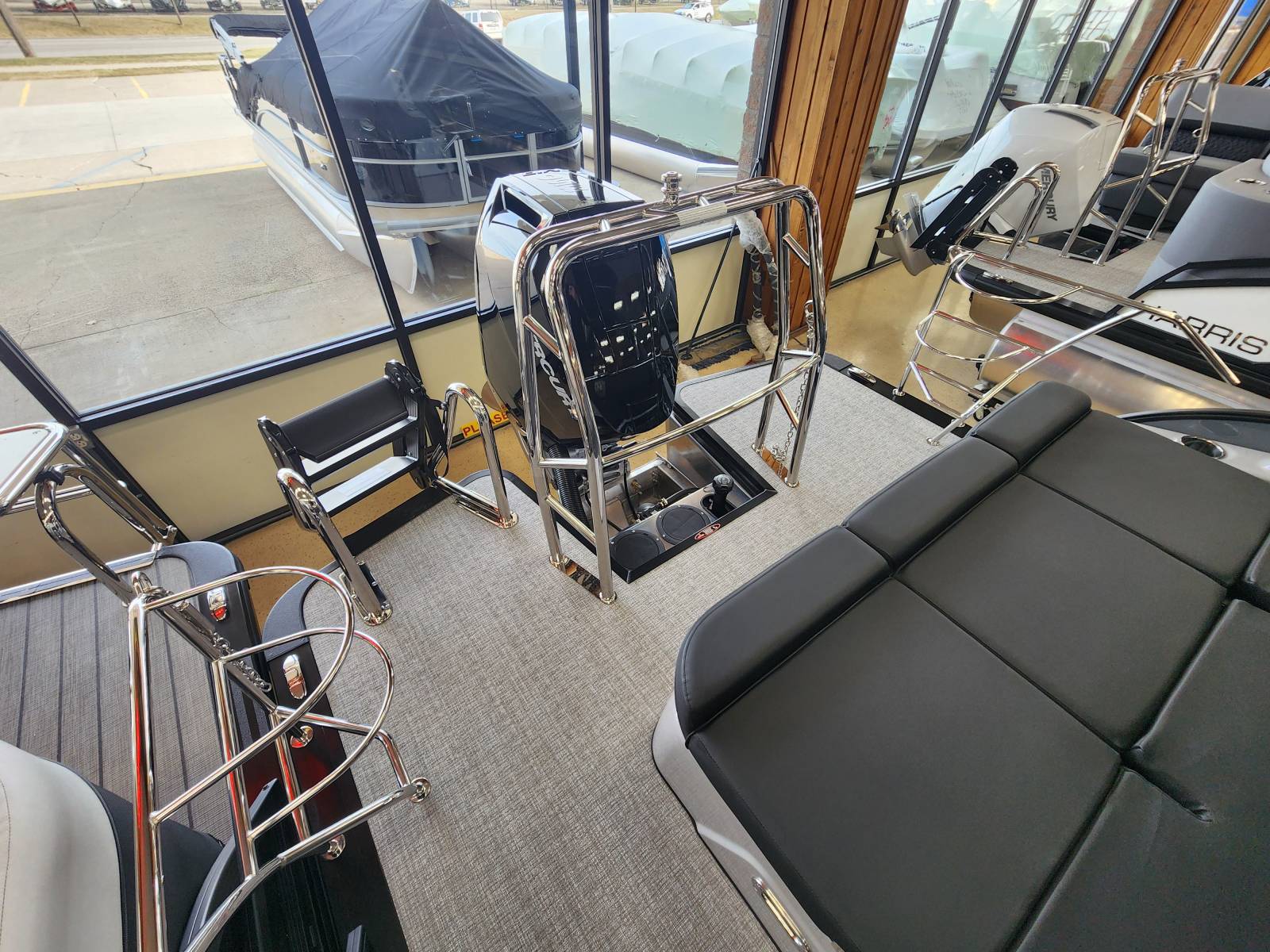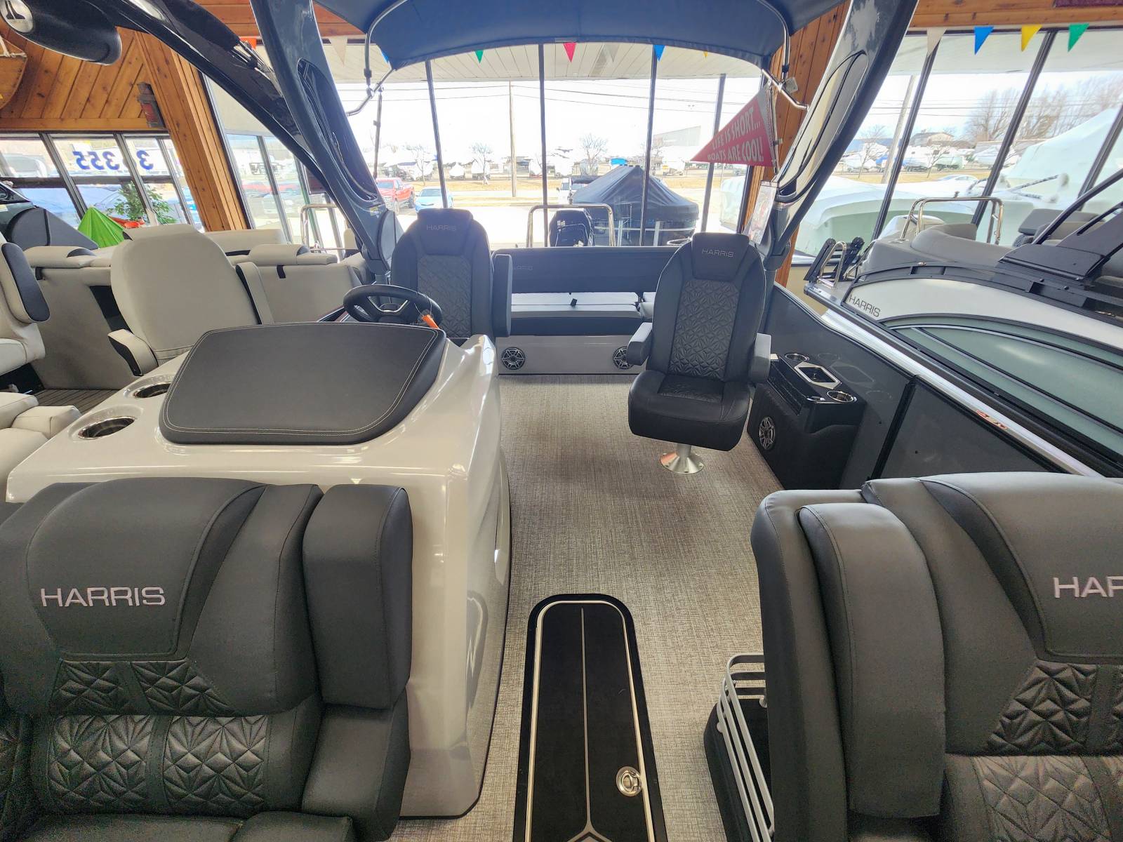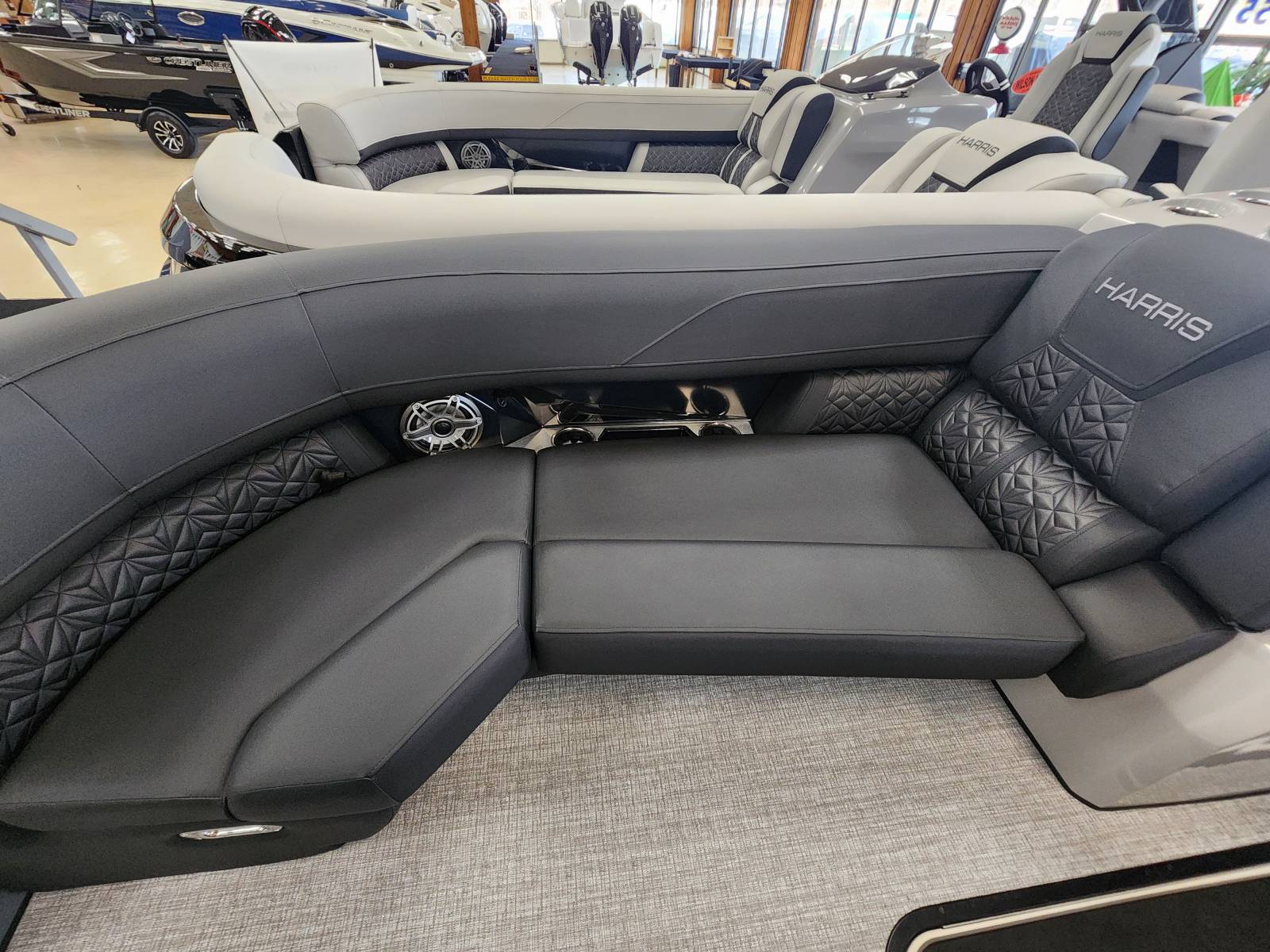 2026 Harris 230 Grand Mariner with a SLDH floorplan and powered by a Mercury V350L 6.4!Factory Installed Options:Exterior- sterling gray with matte black accentsInterior- Luxe caviar cool touch with onyx accentsBlack edition325 chassisIon power lift tower with black biminiTechnology packageInterior light packageLillipad easy step ladderStainless steel ski tow barUltra lux high back helm seatsStone gray woven vinyl flooringRaised helmSafety railLuxury sport woodgrain table