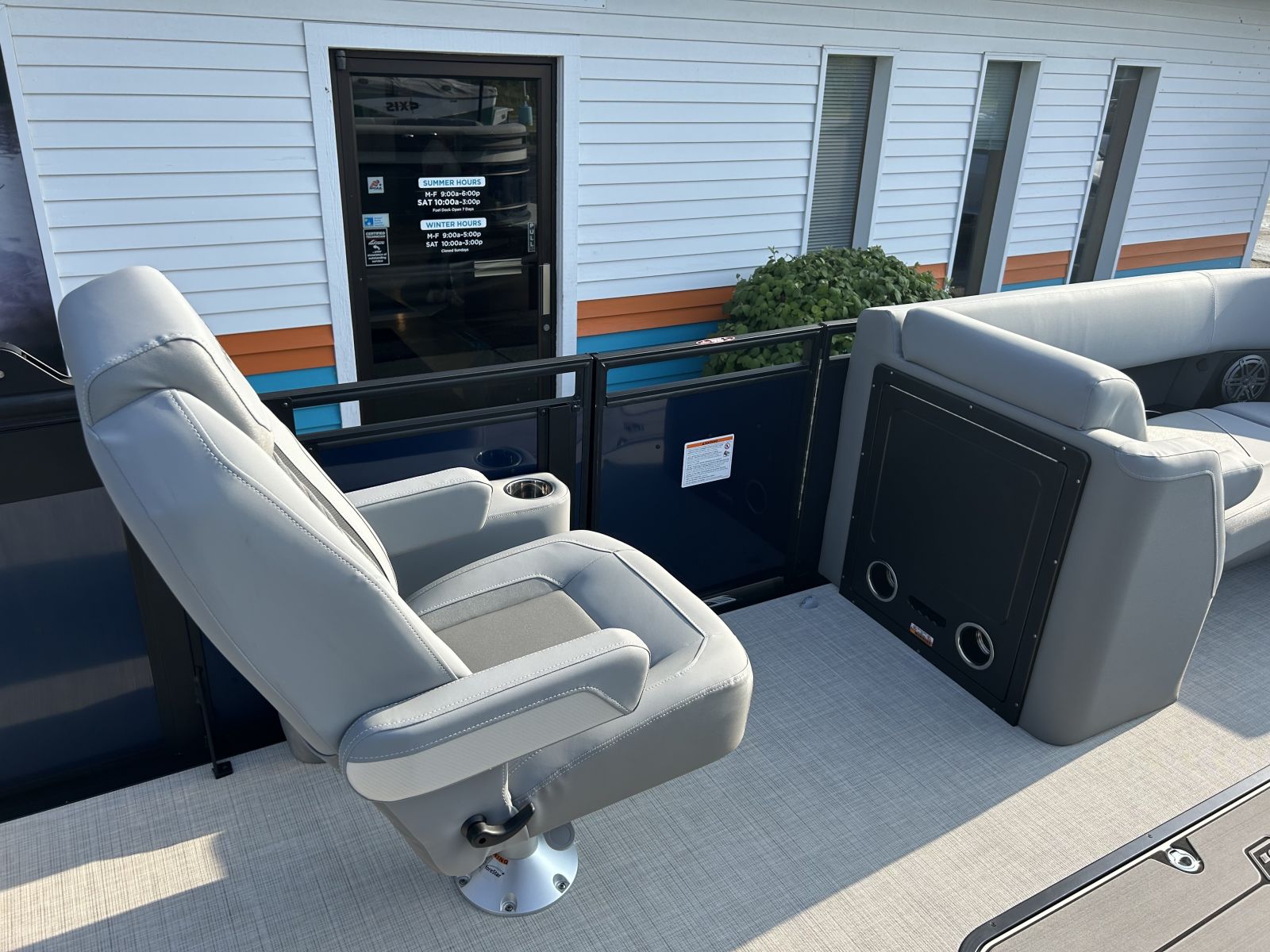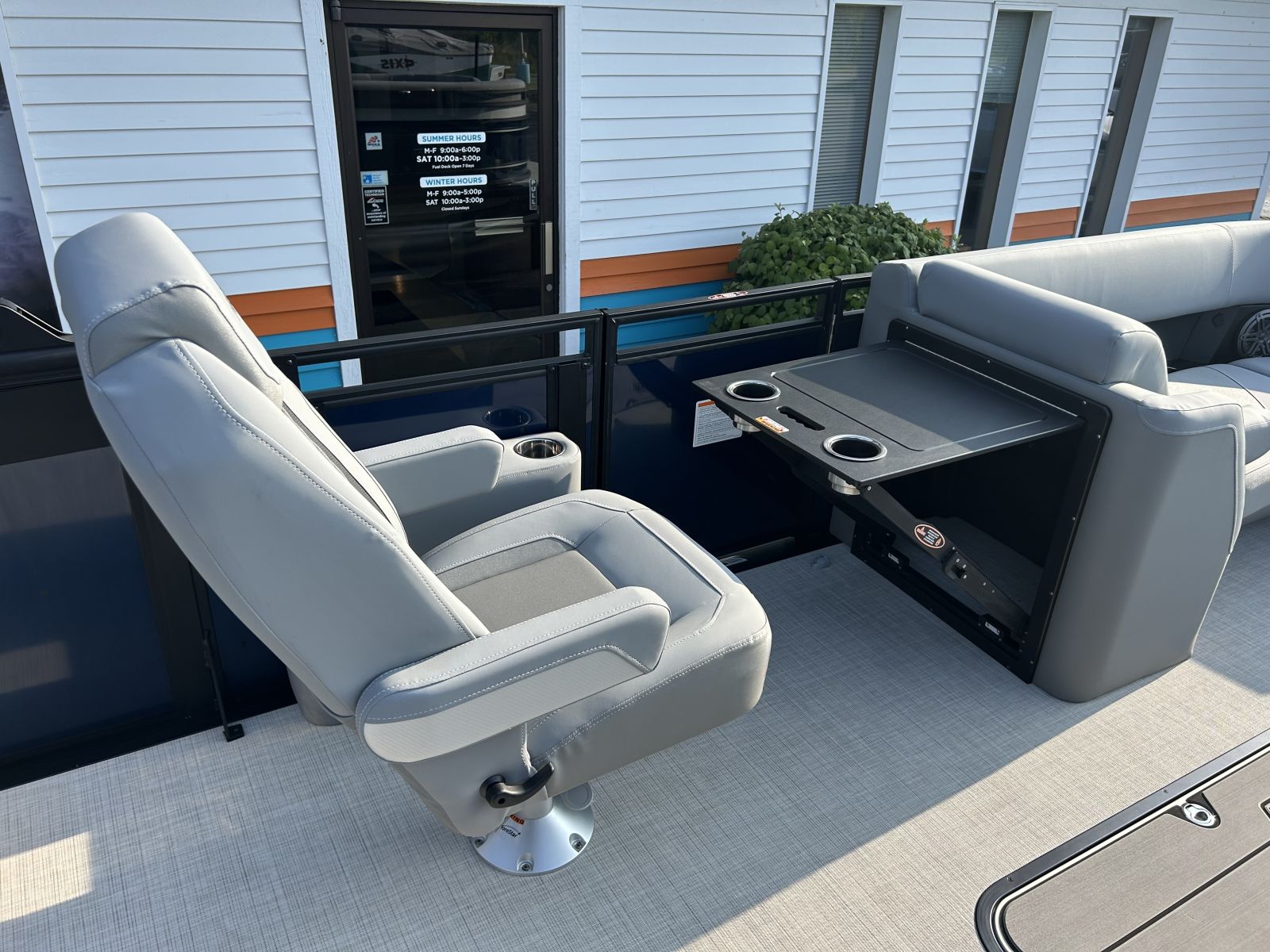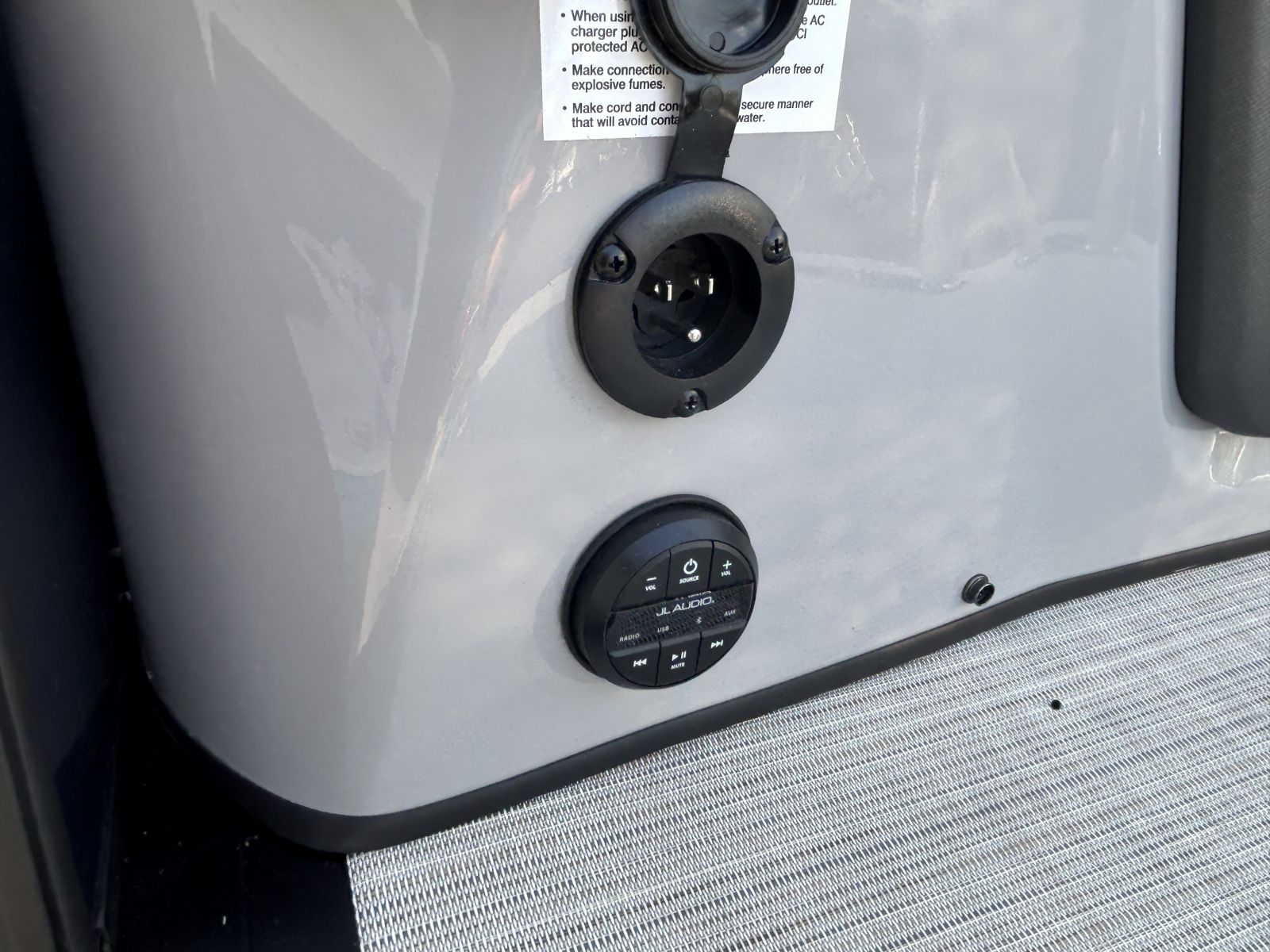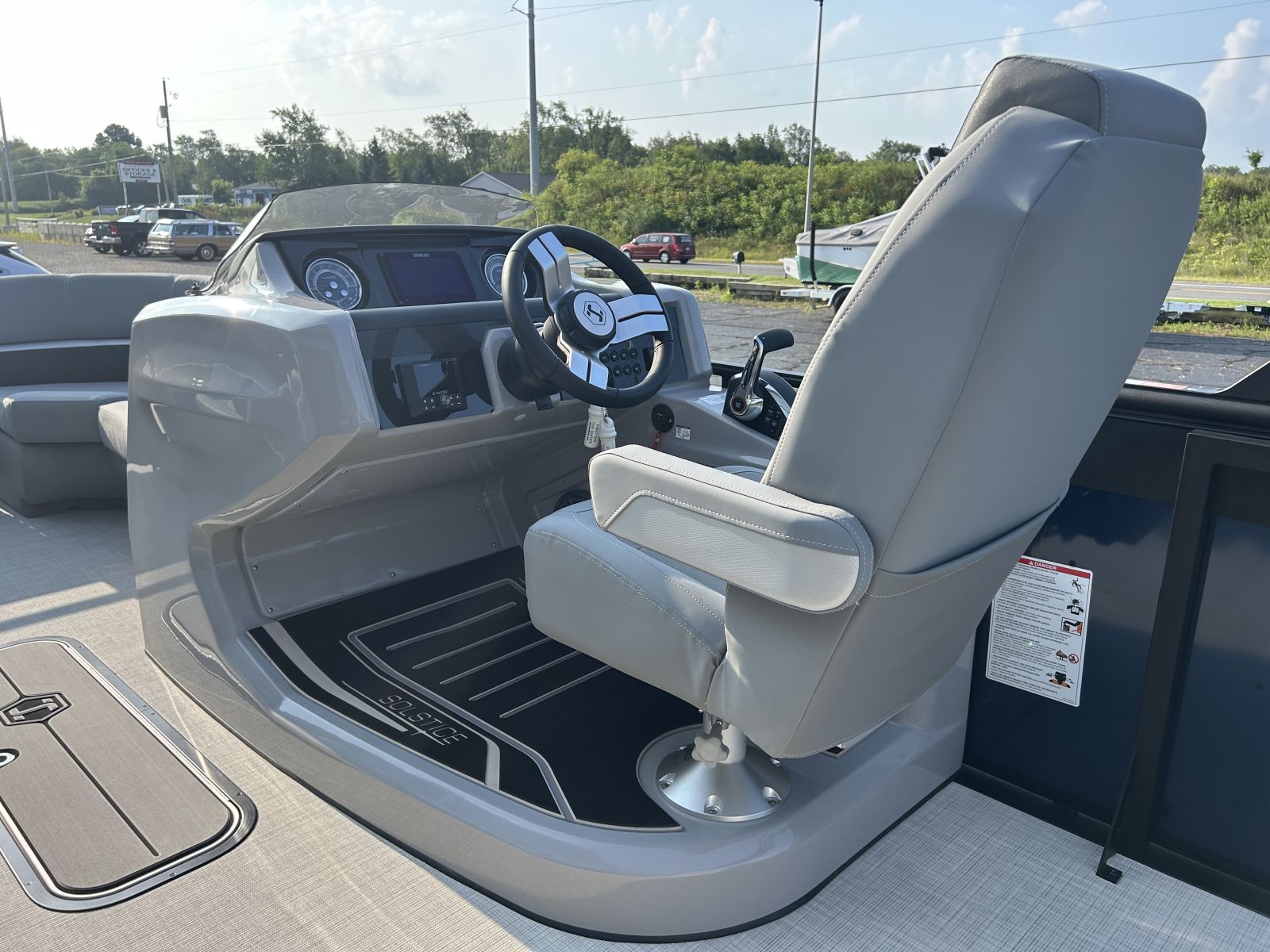 ShiftPower-Assist Steering325 RPM Tritoon ChassisPower Bimini TopAdditional Forward ShadeTotal Lighting PackageSIMRAD Touchscreen DisplayUpgraded JL Audio System with Zone ControlSki Tow BarWindscreenRaised HelmChaise-End Flip-Up TableRemovable Cockpit TableEZ-Clip Mooring CoverAdditional Details: