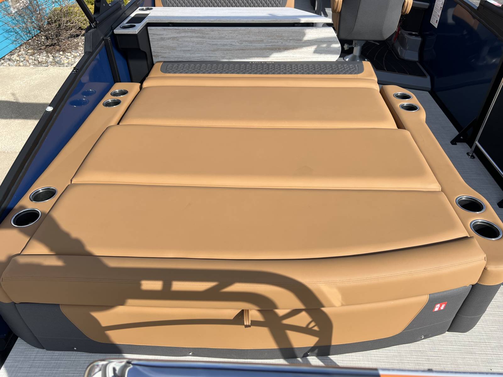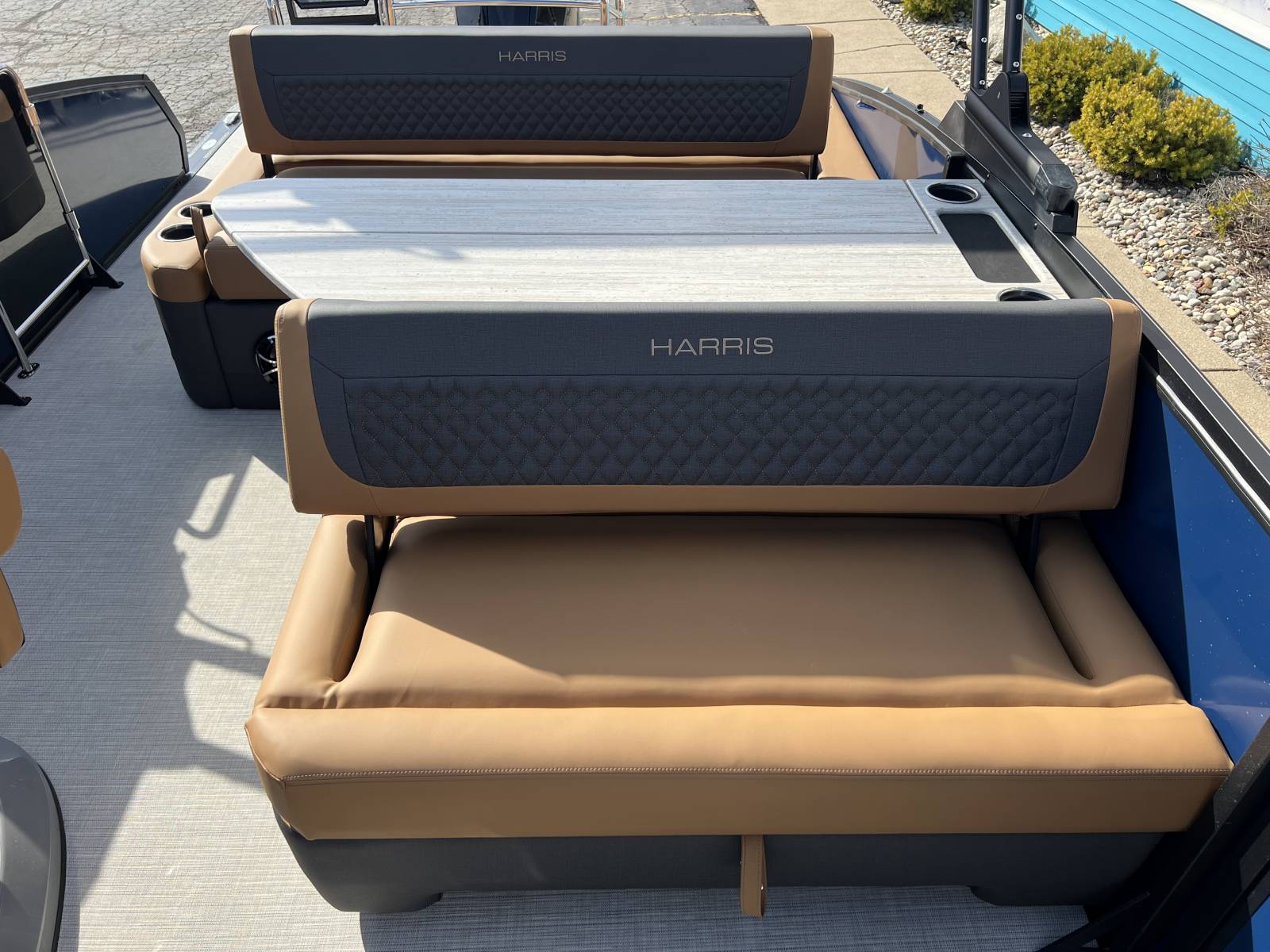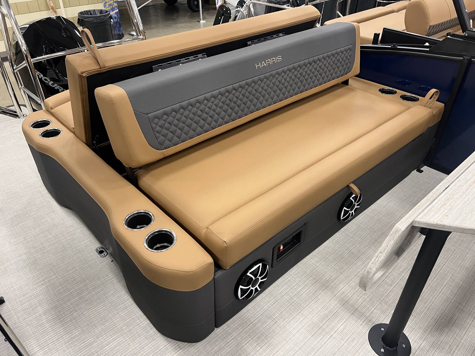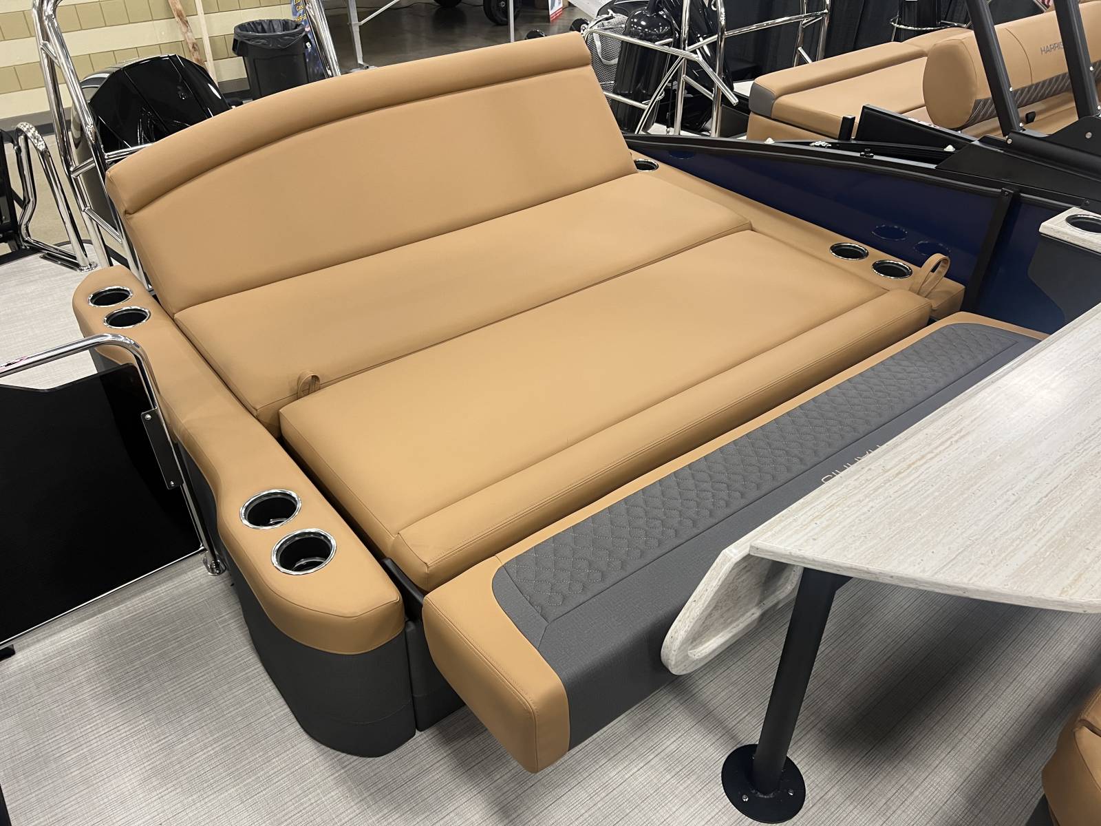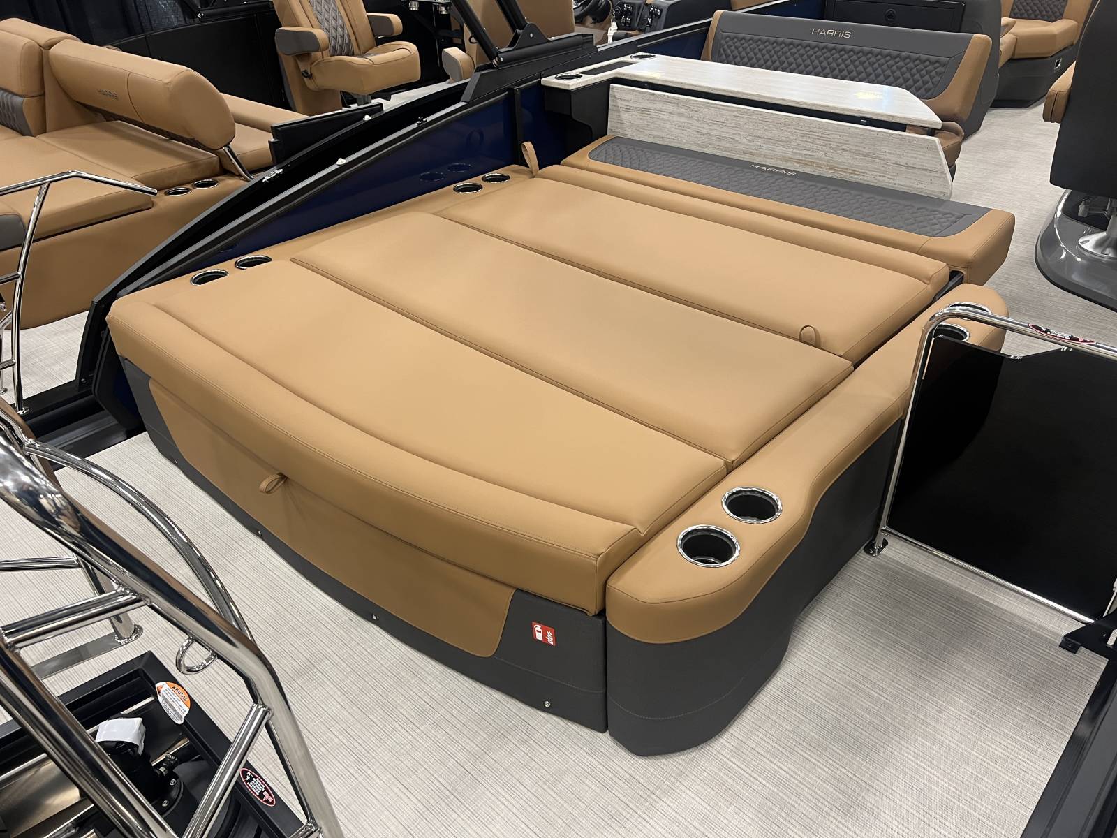 interior, this Sunliner is both a head-turner and a must-see on the water. Powered by a Mercury 225hp engine and built on Harris’s RPM Tritoon Chassis, the 230 SLE offers an exhilarating yet refined ride, whether you’re entertaining friends, pulling skiers, or cruising at sunset.Notable Options Include:Mercury 225hp EngineHarris RPM Tritoon ChassisMidnight Blue Exterior with Blackout EditionLUX Chestnut InteriorSki Tow BarPower Bimini TopTotal Lighting PackageLillipad Ladder UpgradeSIMRAD NSX9 Touchscreen DisplayAll-New See-Through Bow GateDual Battery Selector SwitchStainless Steel CupholdersQuick-Release (QR) Fender SystemRemovable TableEZ-Clip Mooring CoverAdditional Details:The 2026 Sunliner 230 with the SLE floorplan takes luxury pontoons to a new