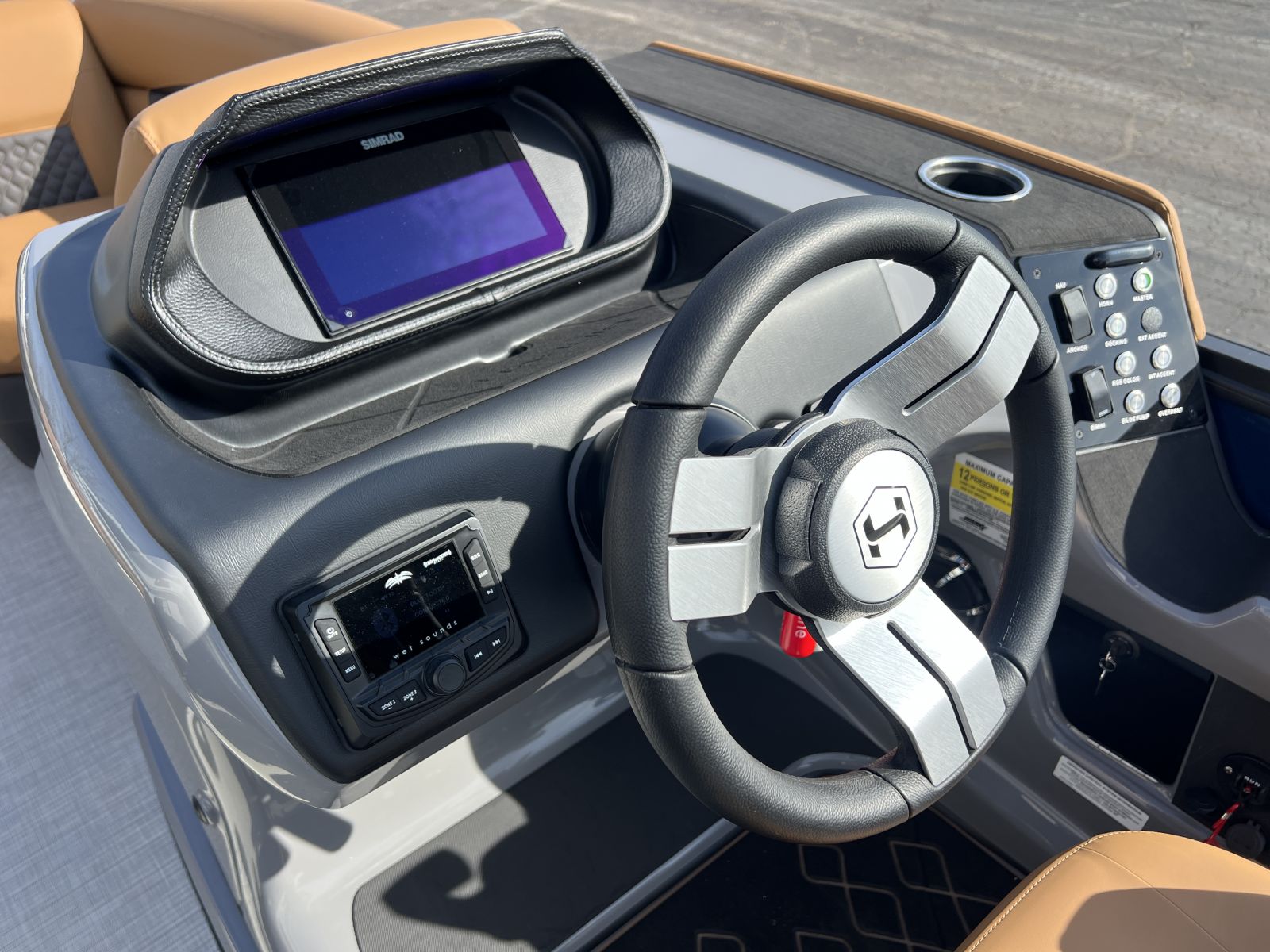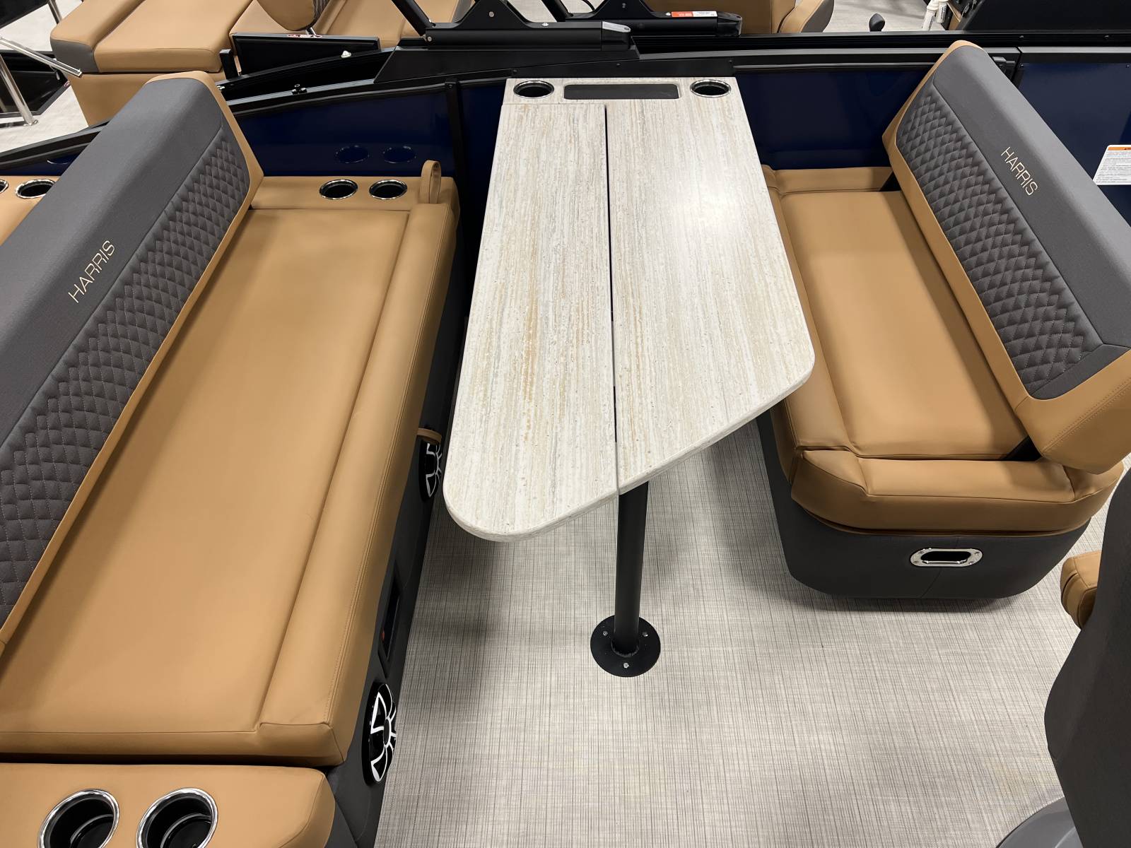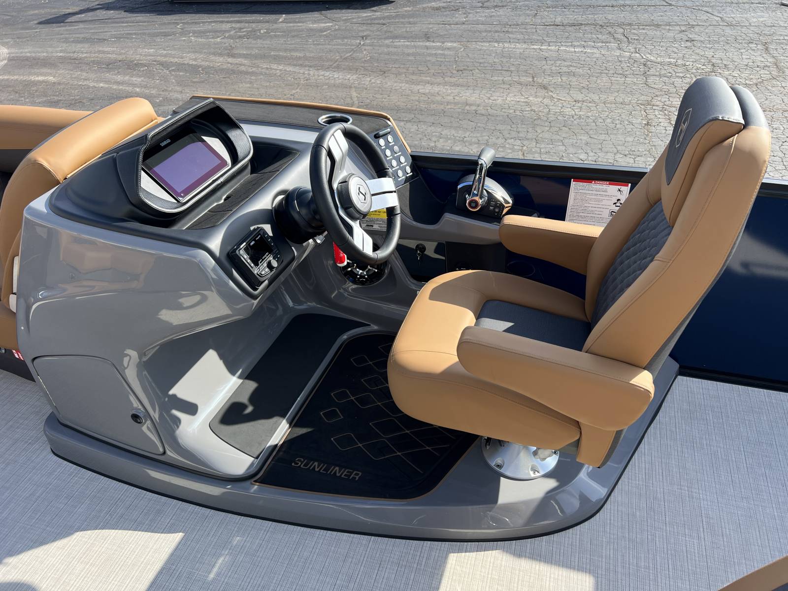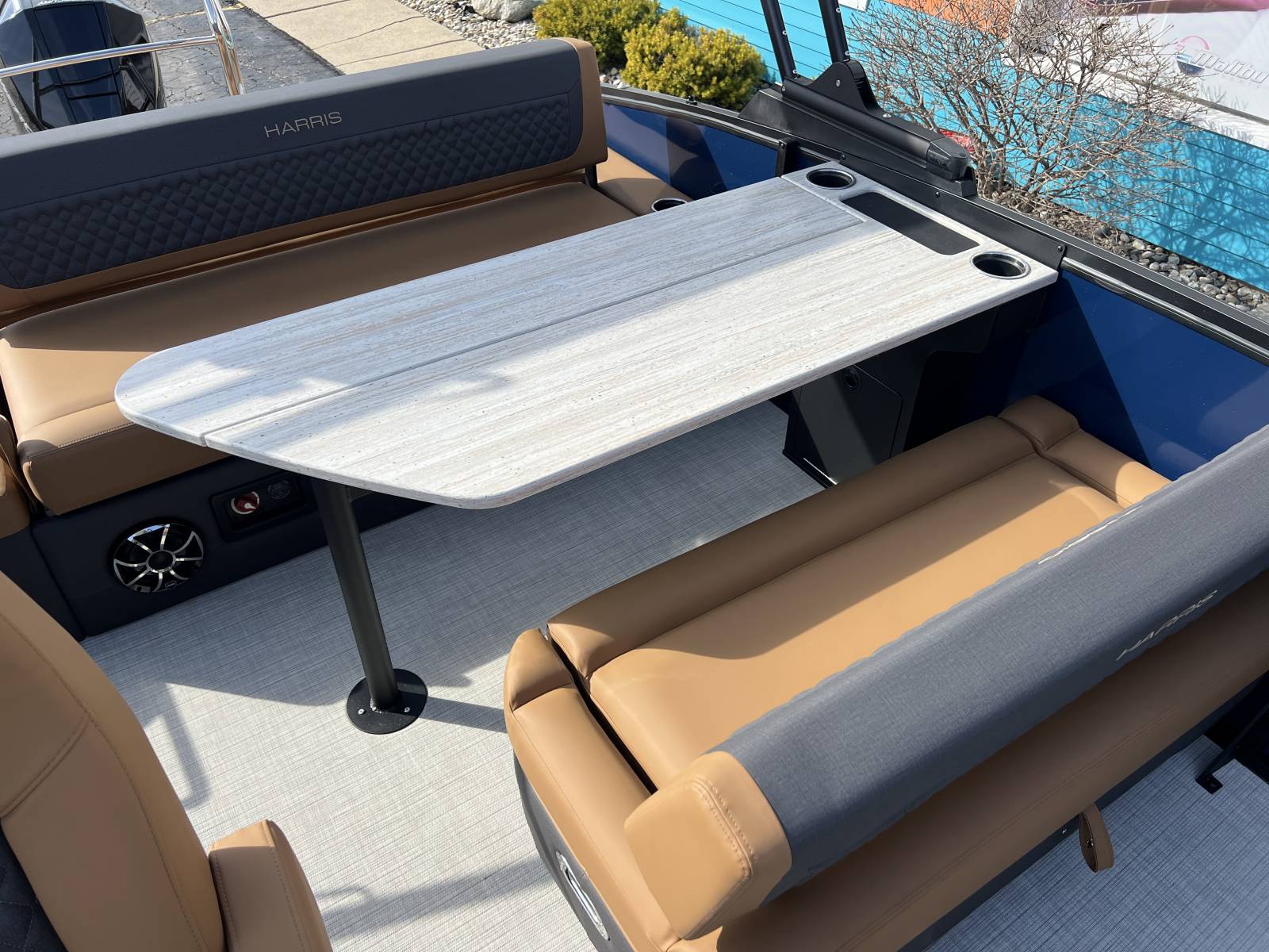 interior, this Sunliner is both a head-turner and a must-see on the water. Powered by a Mercury 225hp engine and built on Harris’s RPM Tritoon Chassis, the 230 SLE offers an exhilarating yet refined ride, whether you’re entertaining friends, pulling skiers, or cruising at sunset.Notable Options Include:Mercury 225hp EngineHarris RPM Tritoon ChassisMidnight Blue Exterior with Blackout EditionLUX Chestnut InteriorSki Tow BarPower Bimini TopTotal Lighting PackageLillipad Ladder UpgradeSIMRAD NSX9 Touchscreen DisplayAll-New See-Through Bow GateDual Battery Selector SwitchStainless Steel CupholdersQuick-Release (QR) Fender SystemRemovable TableEZ-Clip Mooring CoverAdditional Details:The 2026 Sunliner 230 with the SLE floorplan takes luxury pontoons to a new