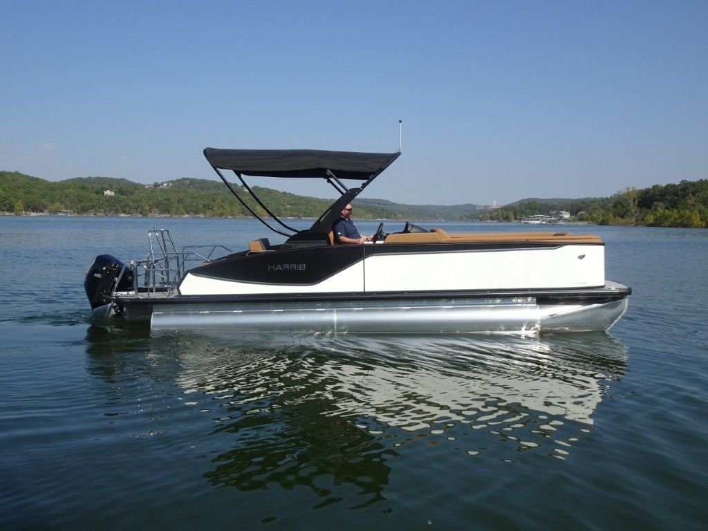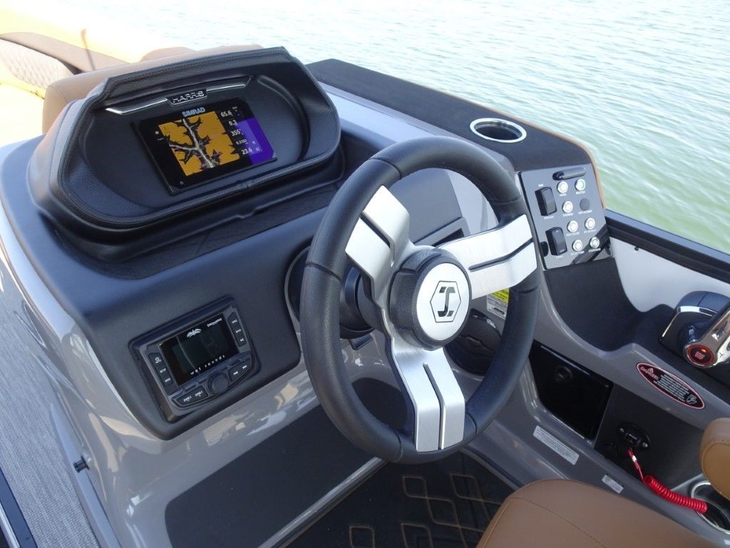 This is a new 2026 Harris Sunliner 250 SL Tri-toon in Ceramic White w/Matte Black Accent and Chestnut Brown Interior. It is powered by a Mercury 250hp Verado 4-Stroke DTS/PAS and has the following options: