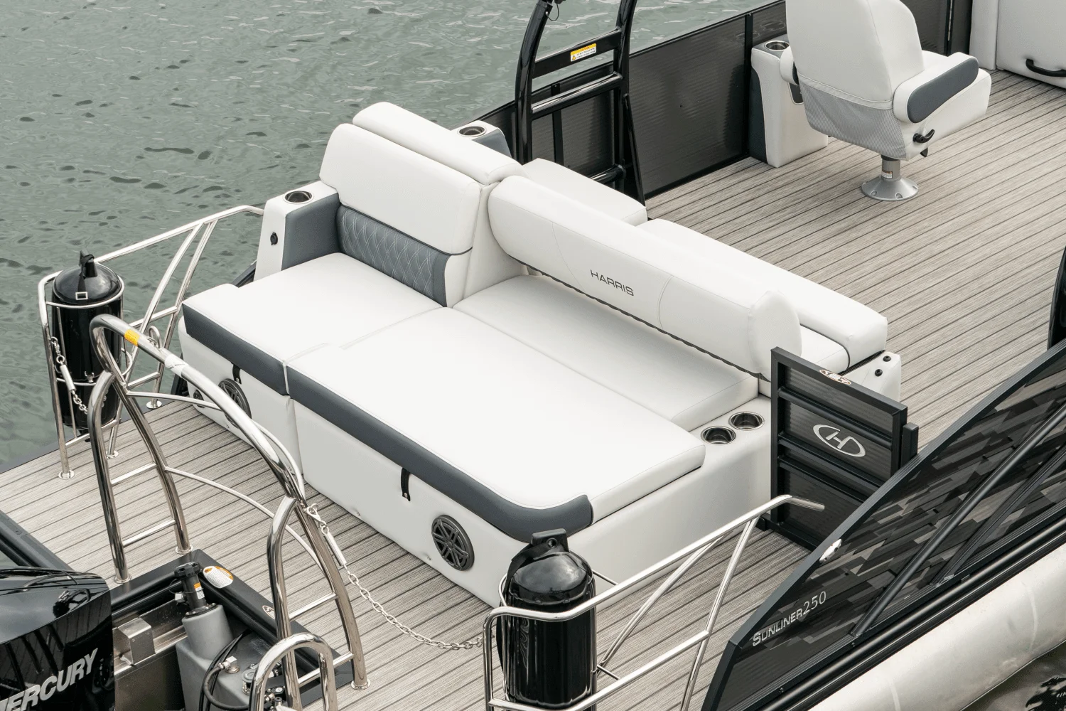 Introducing the 2026 Harris Sunliner 250 Sport, crafted for adventure. With flexible seating arrangements and easy style, Sunliner is the pontoon built to fit your family. Make a splash. The Sunliner delivers the incredible fun you expect with style and comfort that will turn heads and encourage smiles. It's purpose-built for versatility-cruising, relaxing, partying, fishing, skiing or simply getting away with family and friends for a relaxing day on the lake. Comfort meets convenience. Reimagined interiors feature luxuriously soft yet incredibly durable pillow-top vinyl upholstery surrounded by a sleek and stunning new fence. Flexible seating options let you configure the craft for any group, and generous onboard storage sllows you to stow all the gear you need for a relaxing and fulfilling day on the water. It's everything you need for the best day on the water ever!
